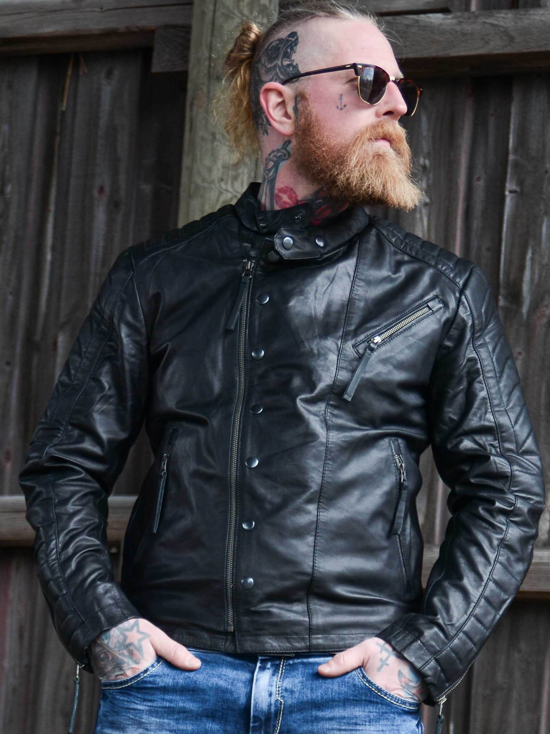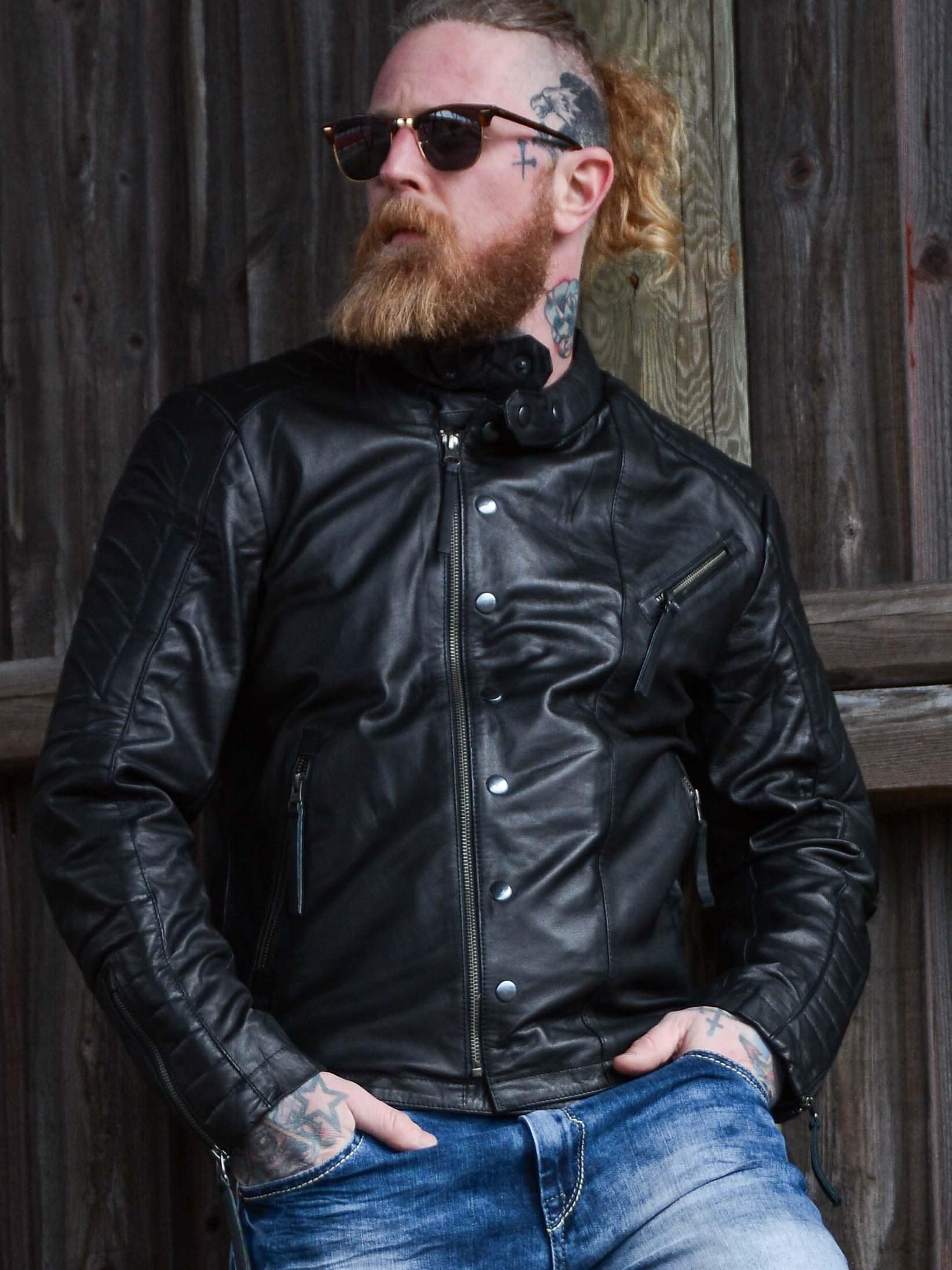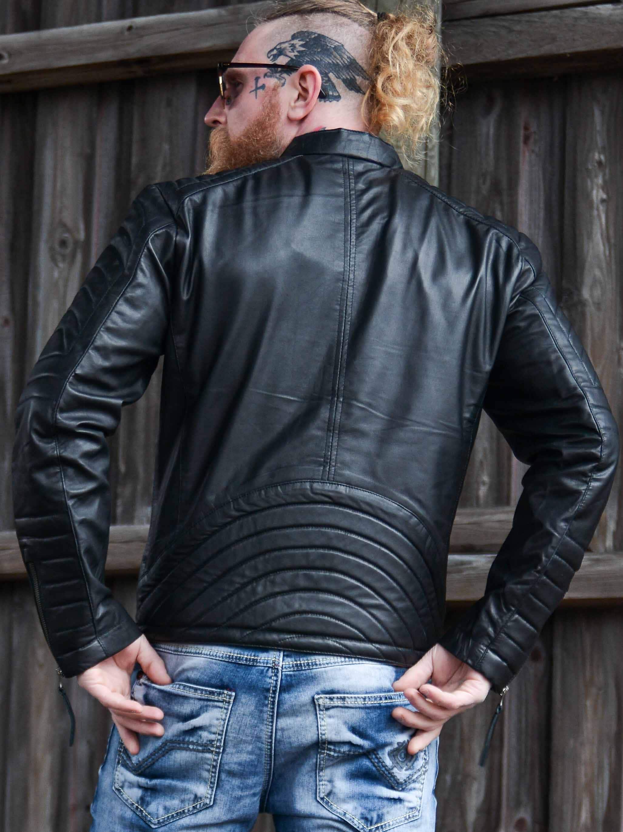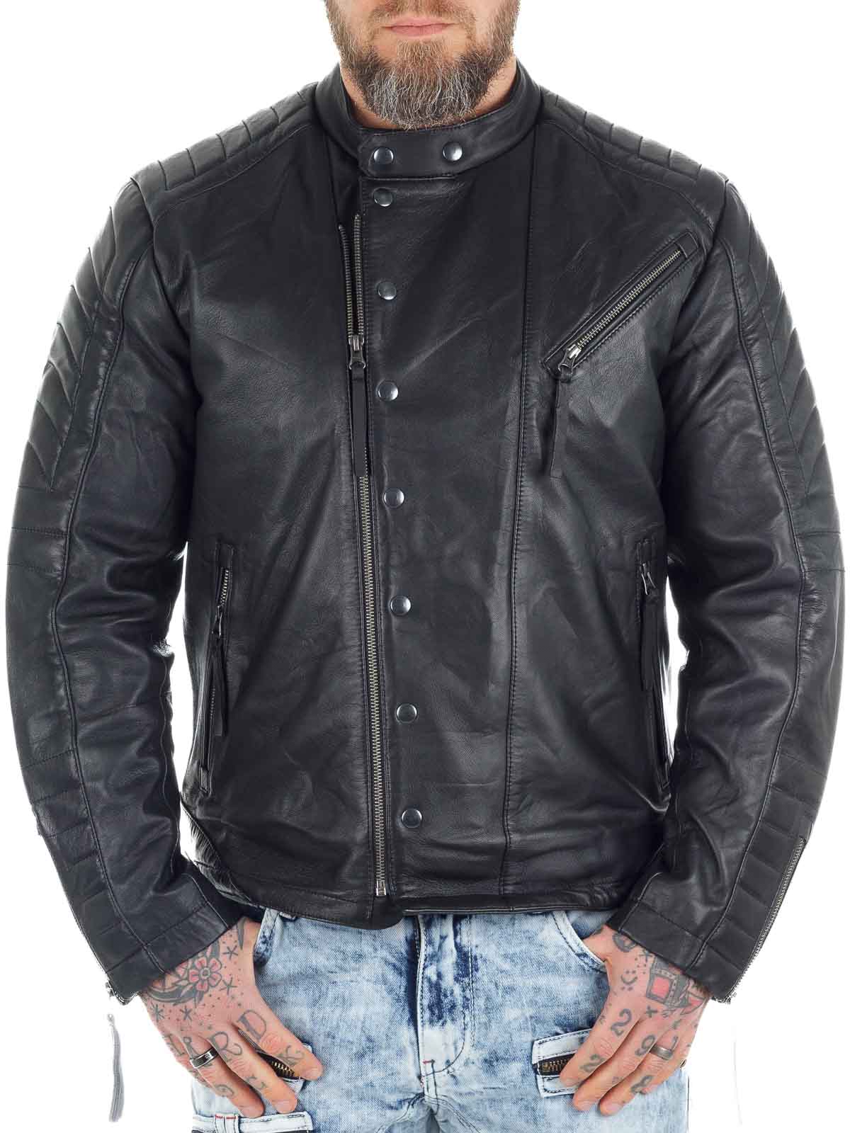 Rå skindjakke i blødt og smidigt fåreskind med markante detaljer, der giver et kraftfuldt udtryk. Modellen har lynlås- og knaplukning foran samt vatterede partier på skuldre, ærmer og ryg, som understreger det bikerinspirerede look. Tre praktiske yderlommer og to inderlommer gør jakken både stilfuld og funktionel. En eksklusiv skindjakke med attitude, perfekt til dig, der ønsker både komfort og karakter!