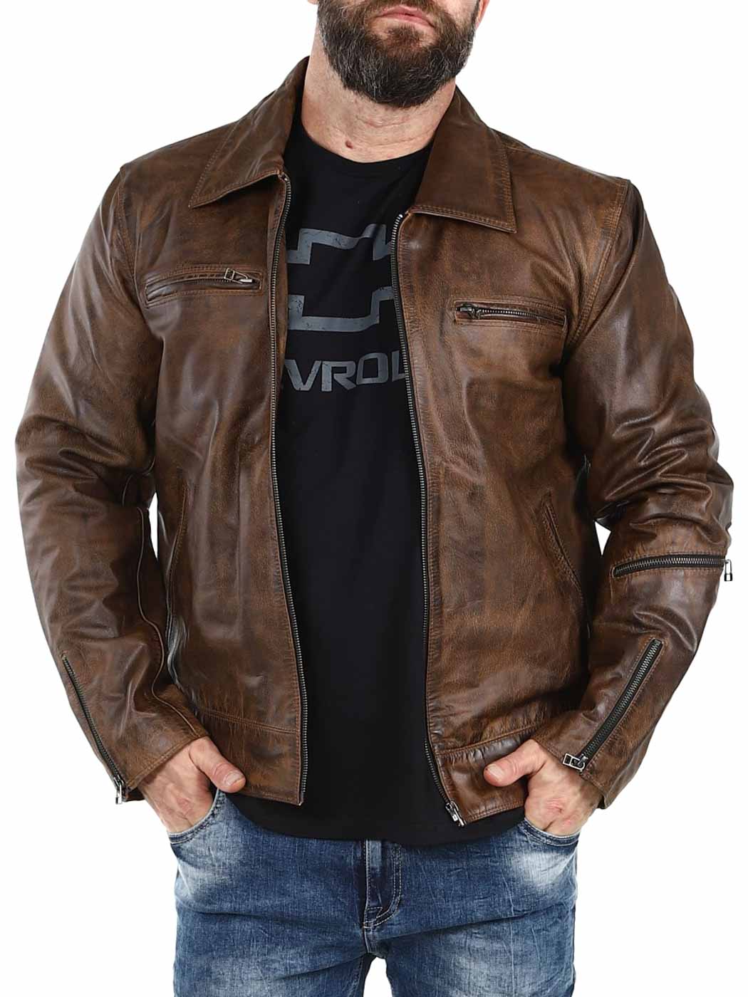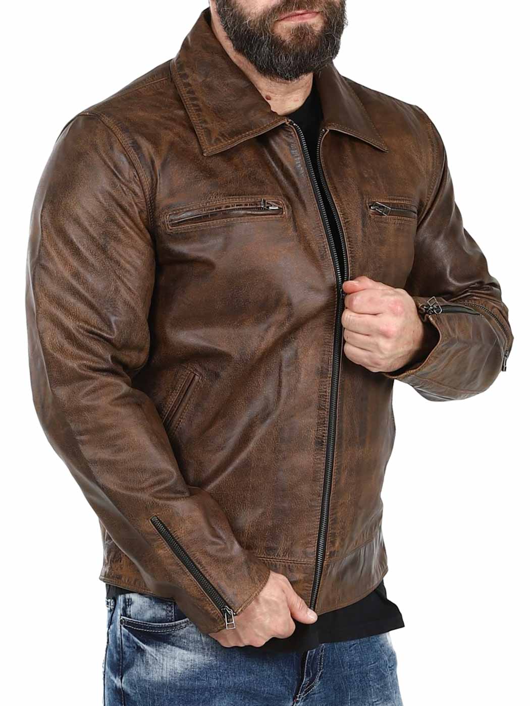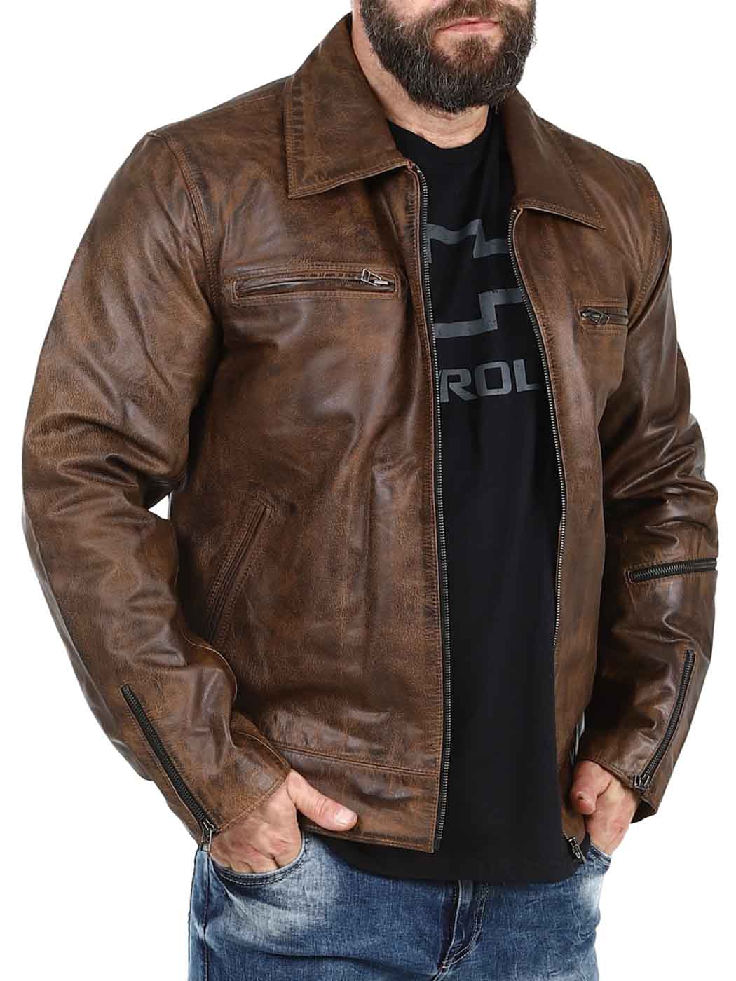 Stærk og tung jakke i ægte læder. Den er designet med en krave og en justerbar talje samt kanter for enden af ærmerne. Der findes fire lommer fortil, en lomme på armen og to lommer indvendigt. Denne jakke er perfekt til dig, der ønsker en tidløs jakke i en god kvalitet!