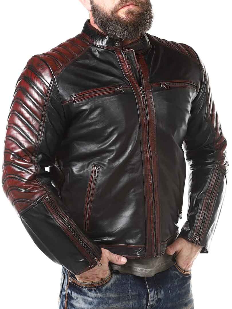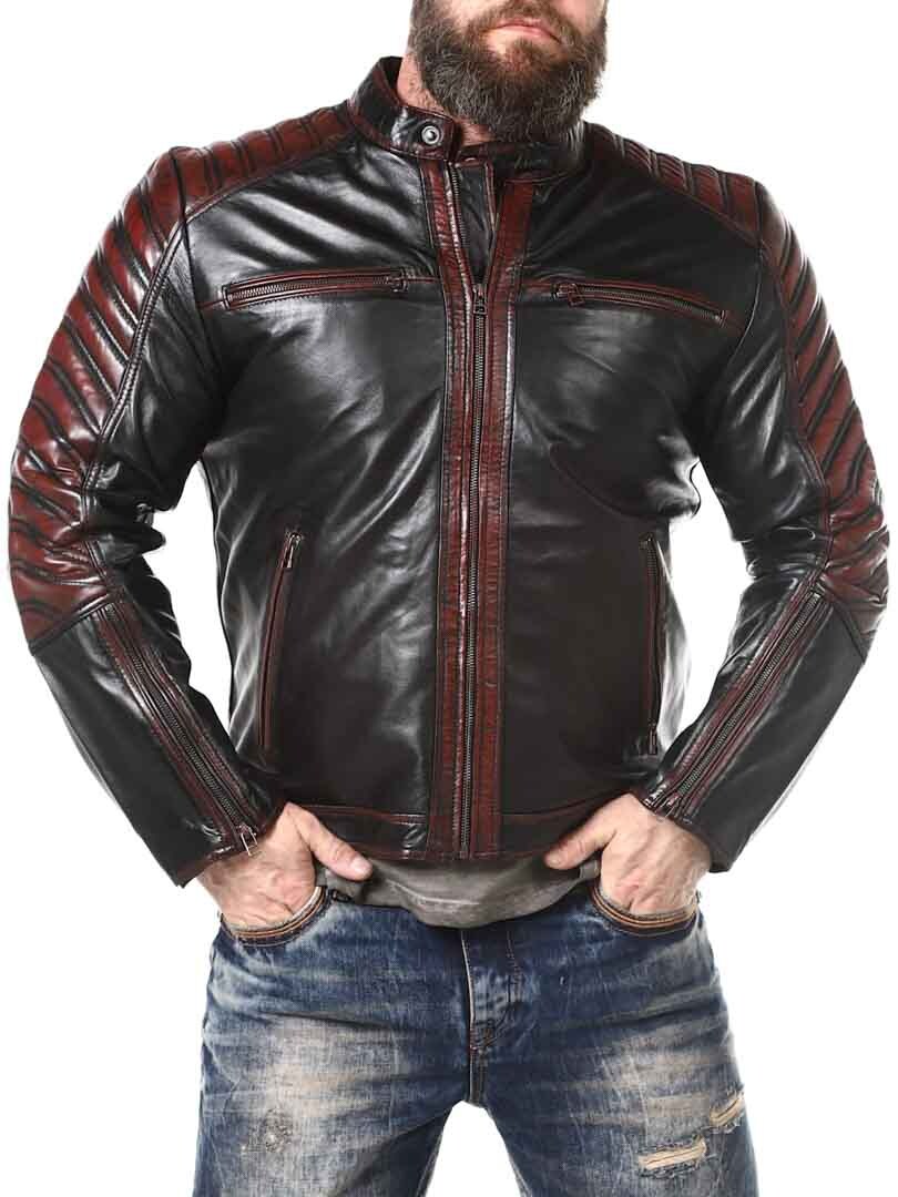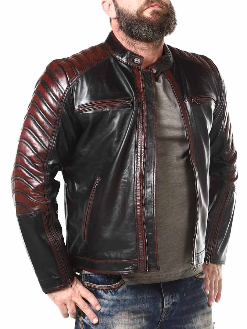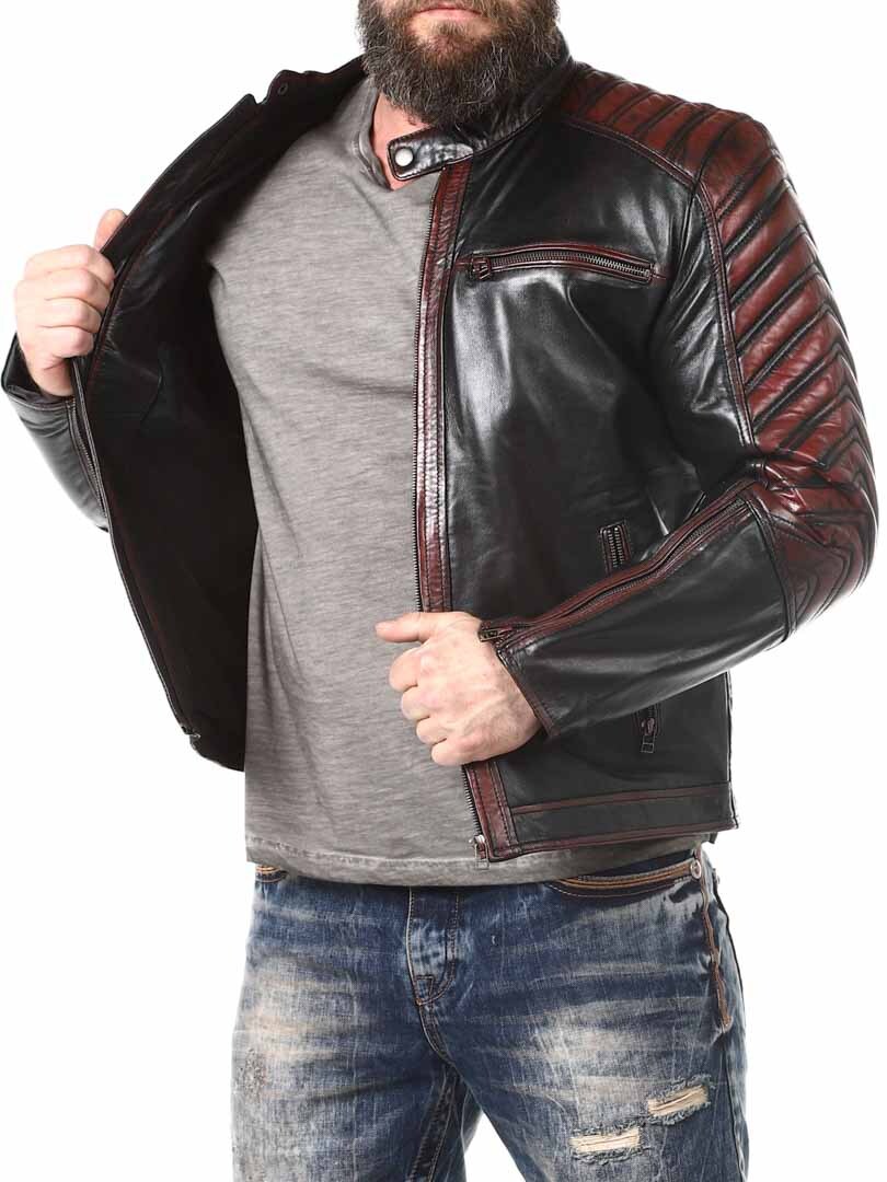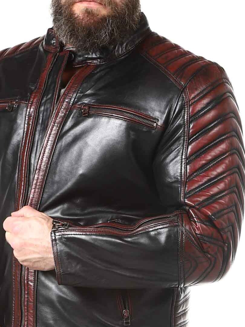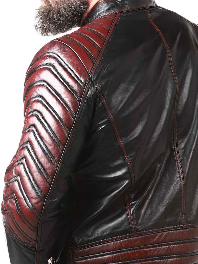 Sort jakke i blødt læder, der følger kroppen. Læderet har røde effekter. Den kan justeres ved kanten af ærmerne ved hjælp af en lynlås. Jakken har desuden polstrede dele. Der er fire lommer fortil, der alle kan lukkes. Hertil kommer to lommer indvendigt i jakken. Jakken lukkes ved hjælp af en lynlås.