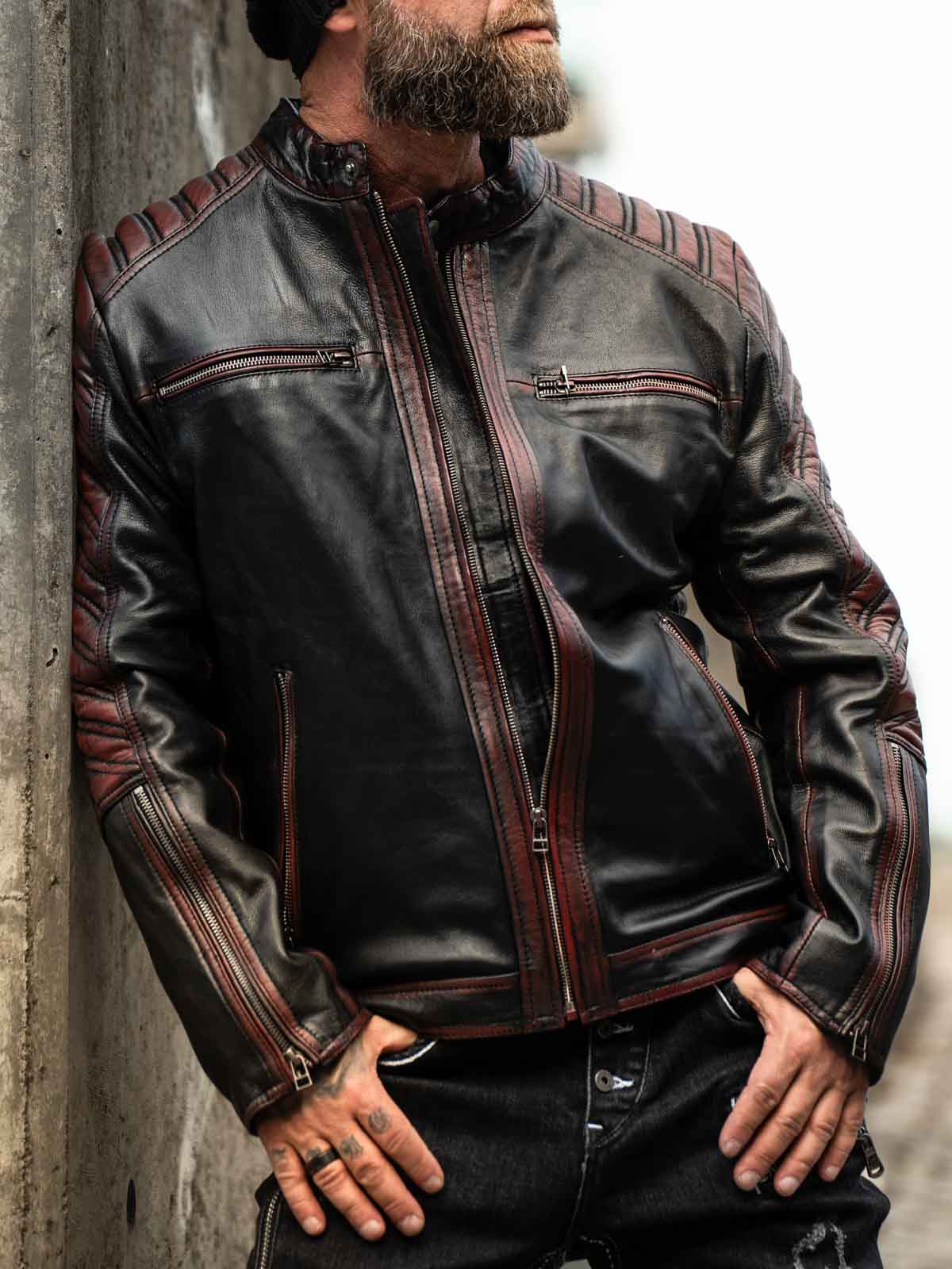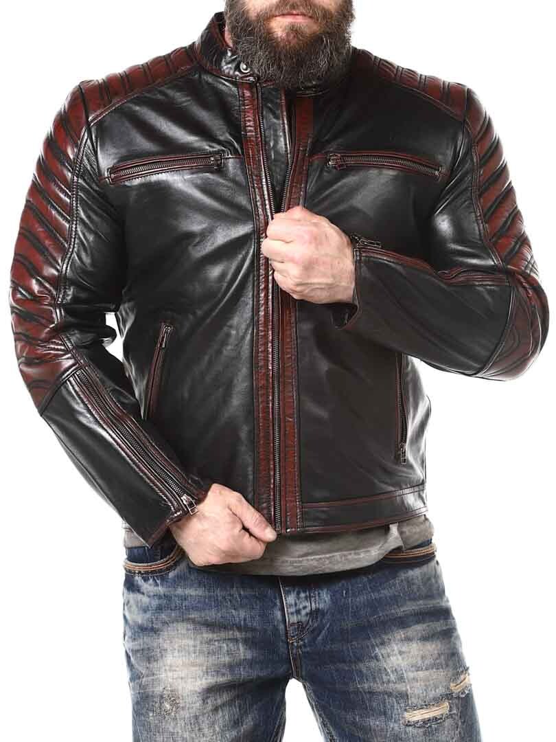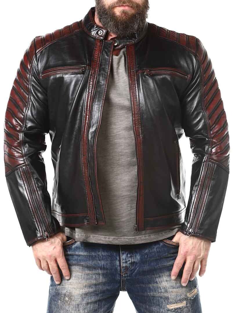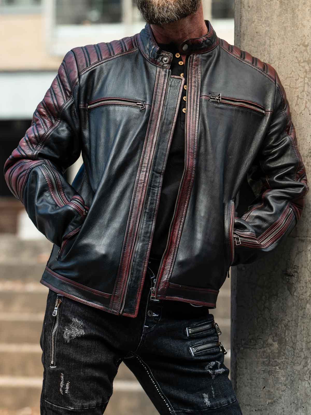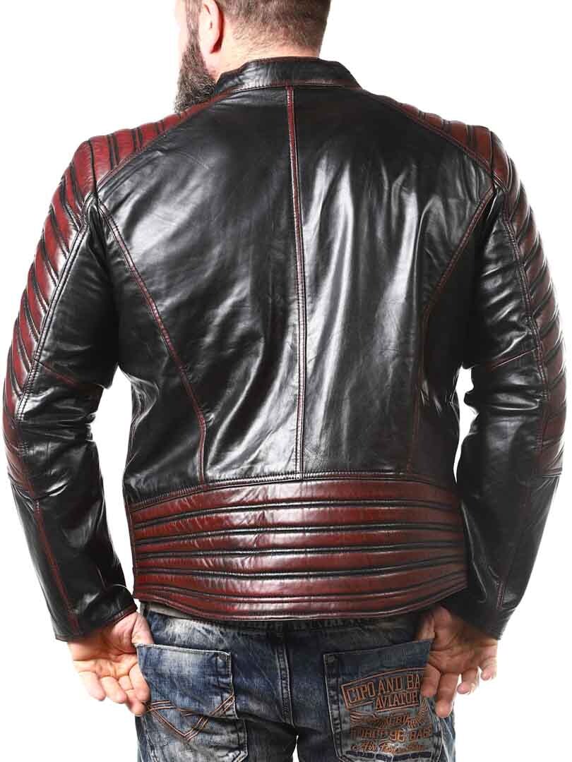 Sort jakke i blødt læder, der følger kroppen. Læderet har røde effekter. Den kan justeres ved kanten af ærmerne ved hjælp af en lynlås. Jakken har desuden polstrede dele. Der er fire lommer fortil, der alle kan lukkes. Hertil kommer to lommer indvendigt i jakken. Jakken lukkes ved hjælp af en lynlås.