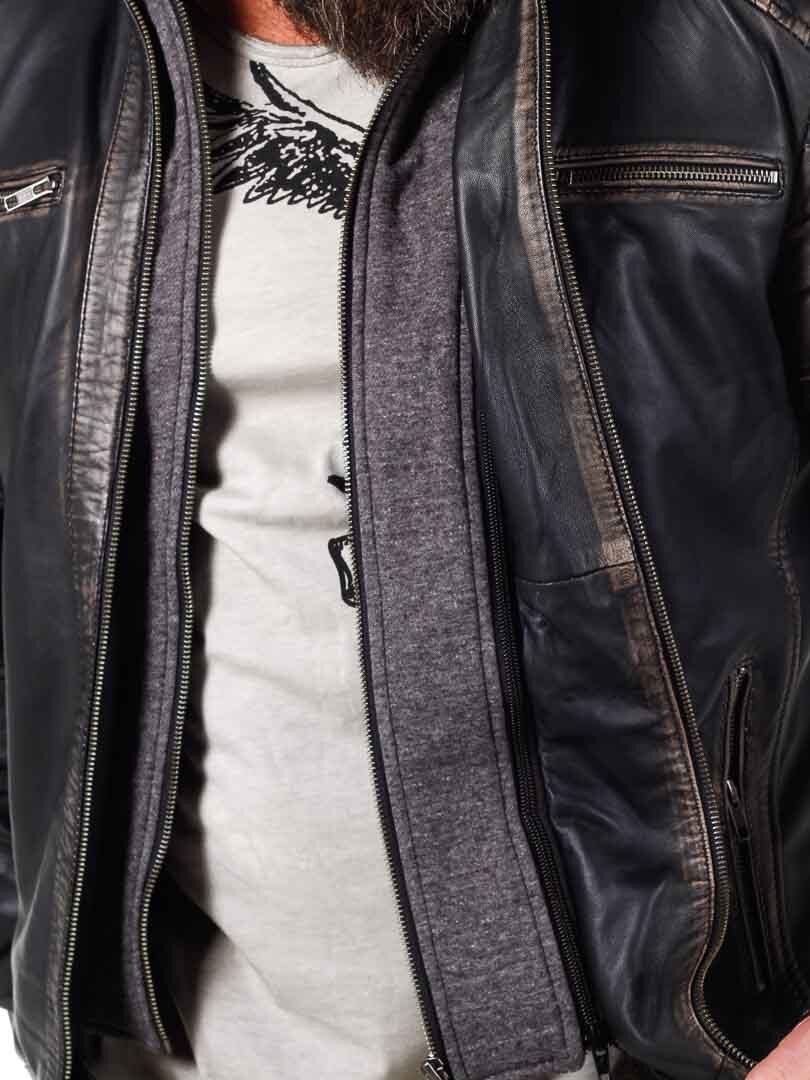 Jakke i ægte læder med et vintage look. Dette er en aftagelig hætte i et blødt sweatshirtmateriale, der er synligt langs med hele jakkens åbning. Polstret parti på ærmer og fire lommer fortil, der alle kan lukkes, samt to inderlommer. Dette er et kraftigt materiale, der gør, at den hænger flot på kroppen.