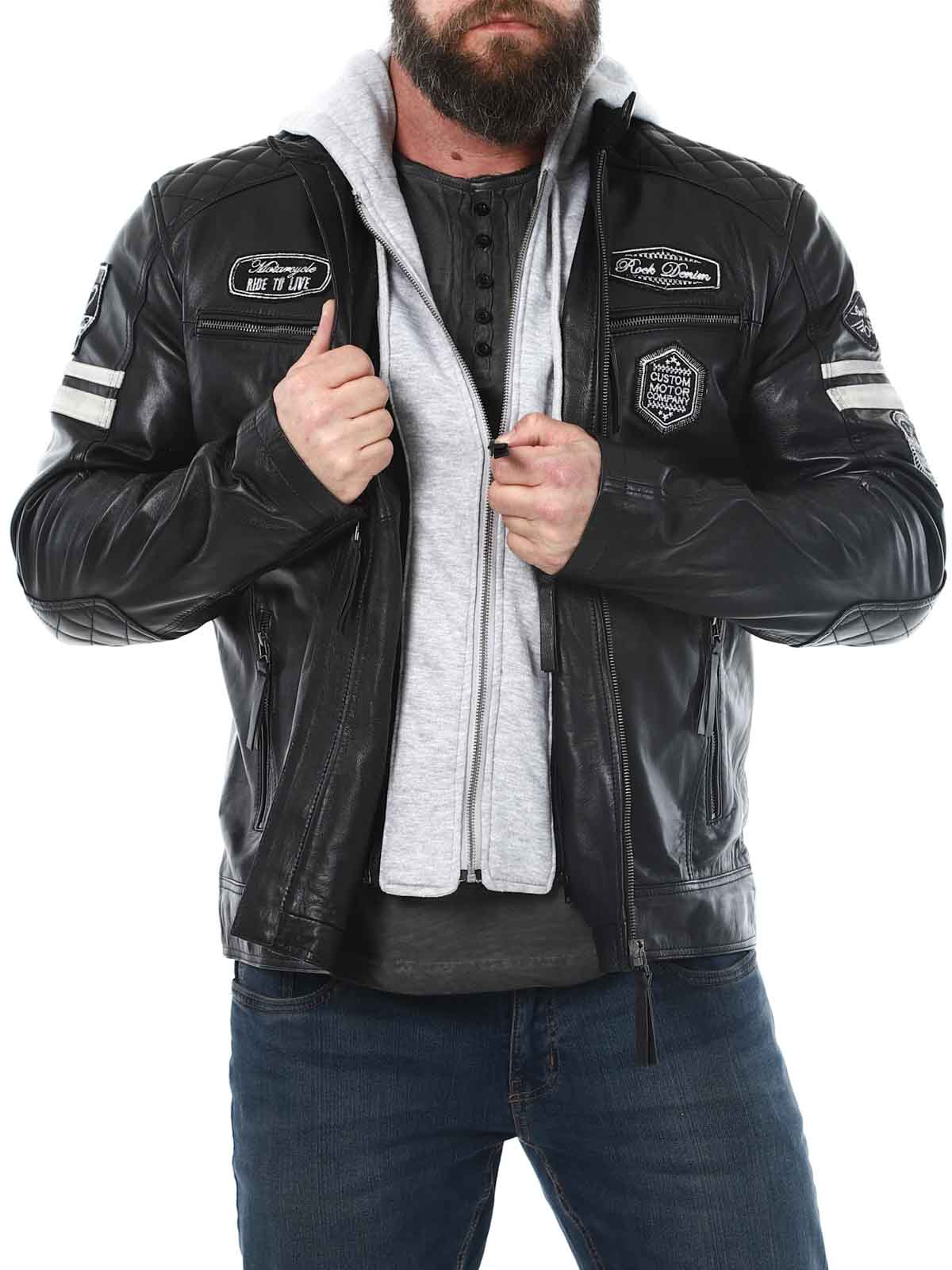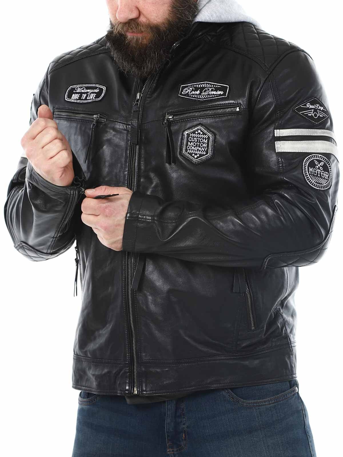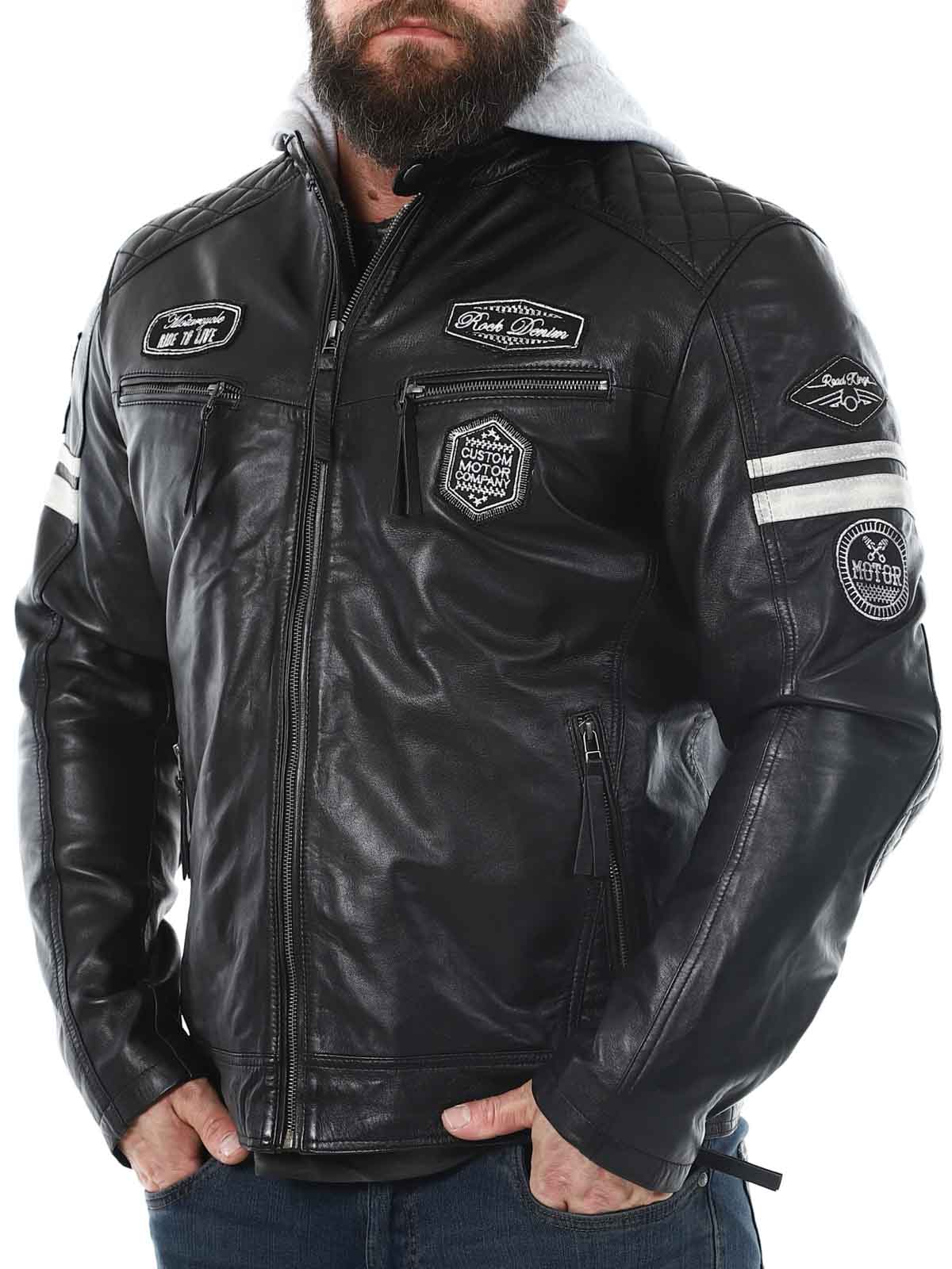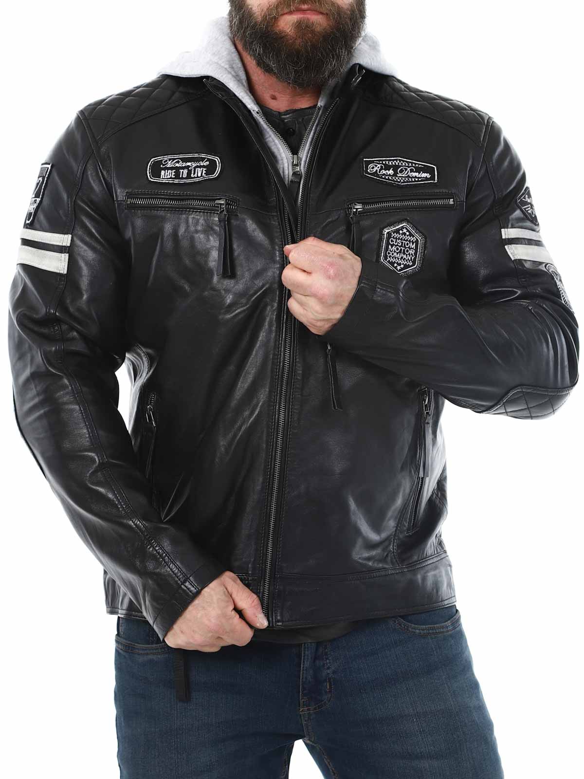 Racing-inspireret jakke i et blødt og smidigt læder. Denne jakke er designet med lapper i stof og hertil kommer en aftagelig hætte i et sweatshirtmateriale. Der findes fire lommer fortil, hvor alle er med lynlås, to lommer indvendigt og justerbare kanter for enden af ærmerne. Dette er en flot jakke, der kun fås hos RockDenim!