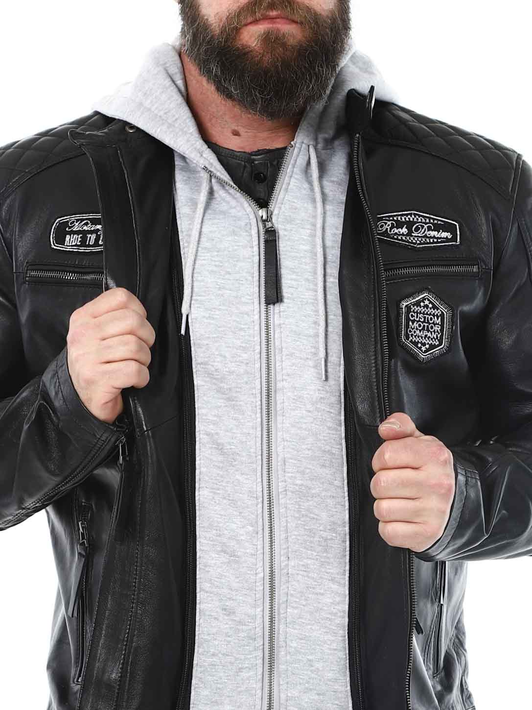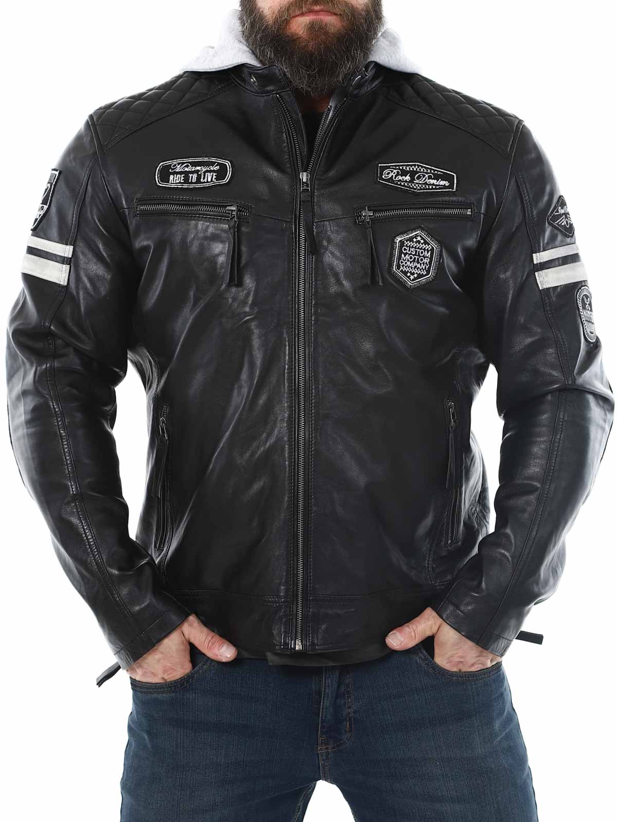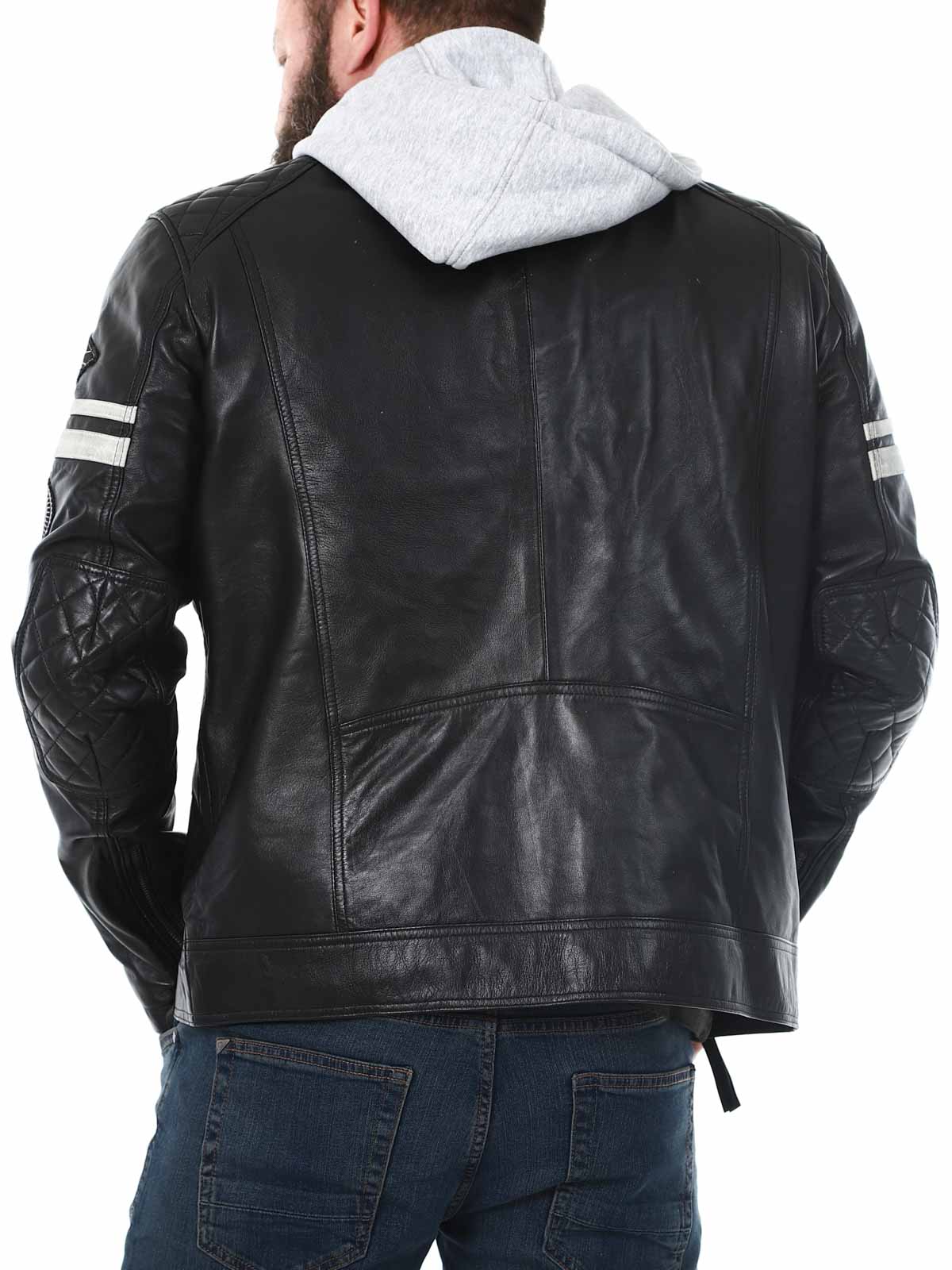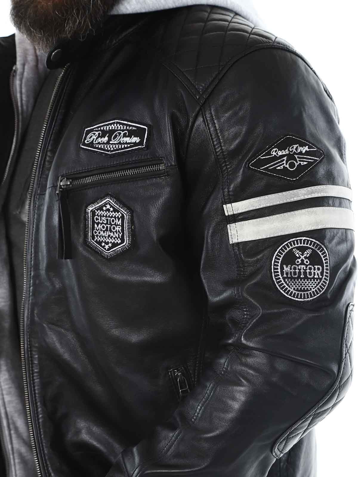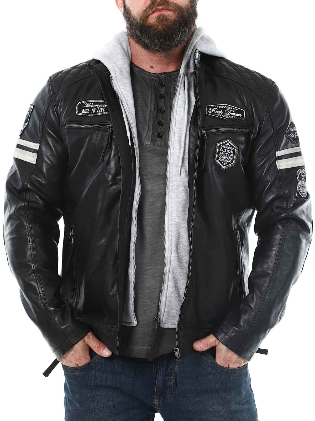 Racing-inspireret jakke i et blødt og smidigt læder. Denne jakke er designet med lapper i stof og hertil kommer en aftagelig hætte i et sweatshirtmateriale. Der findes fire lommer fortil, hvor alle er med lynlås, to lommer indvendigt og justerbare kanter for enden af ærmerne. Dette er en flot jakke, der kun fås hos RockDenim!