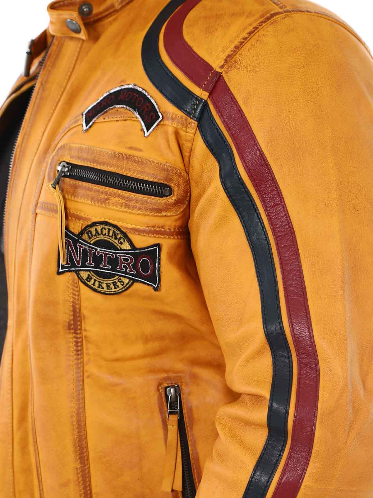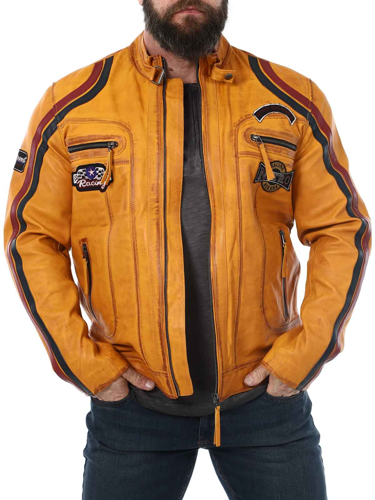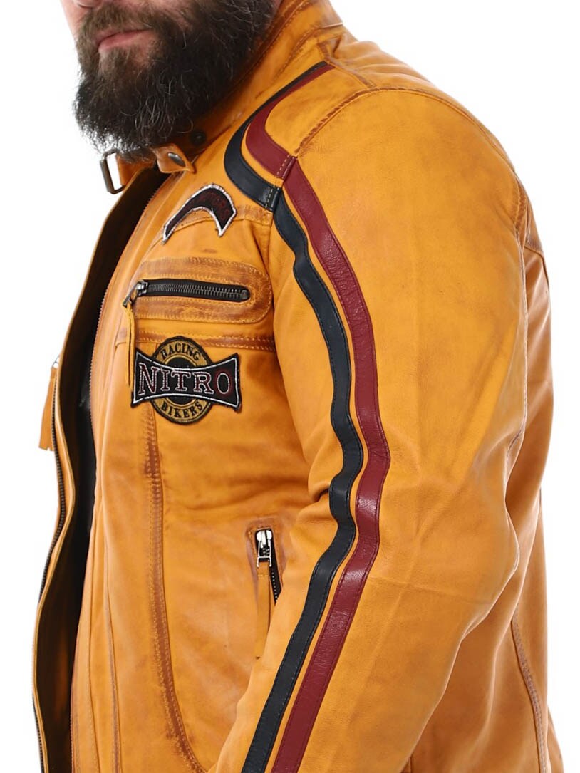 Jakke med lapper i stof og striber, der giver et stilrent racerlook. Jakken er fremstillet af et blødt og smidigt læder. Den har fire lommer fortil, hvor alle er med lynlås. Hertil kommer to lommer indvendigt og justerbare kanter for enden af ærmerne. Denne frække jakke fås kun hos RockDenim!