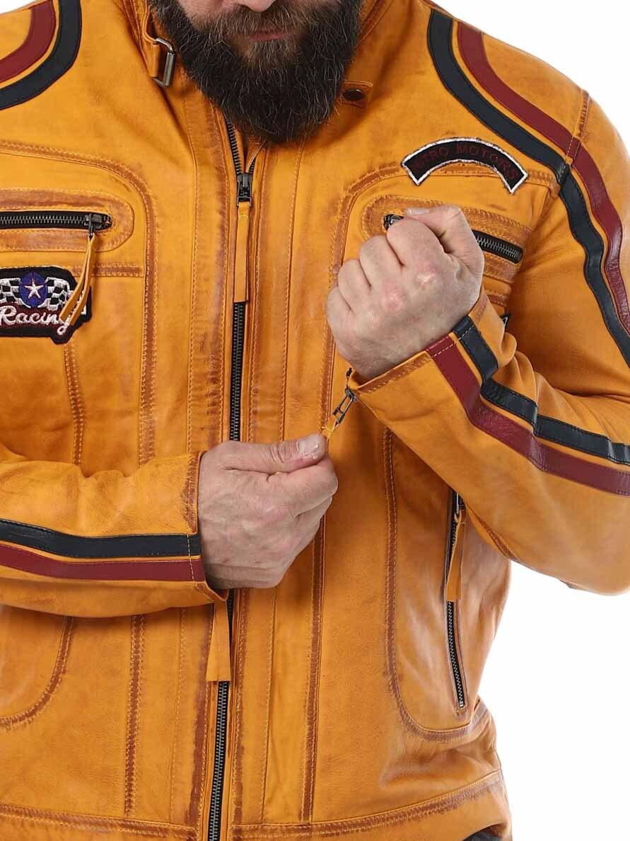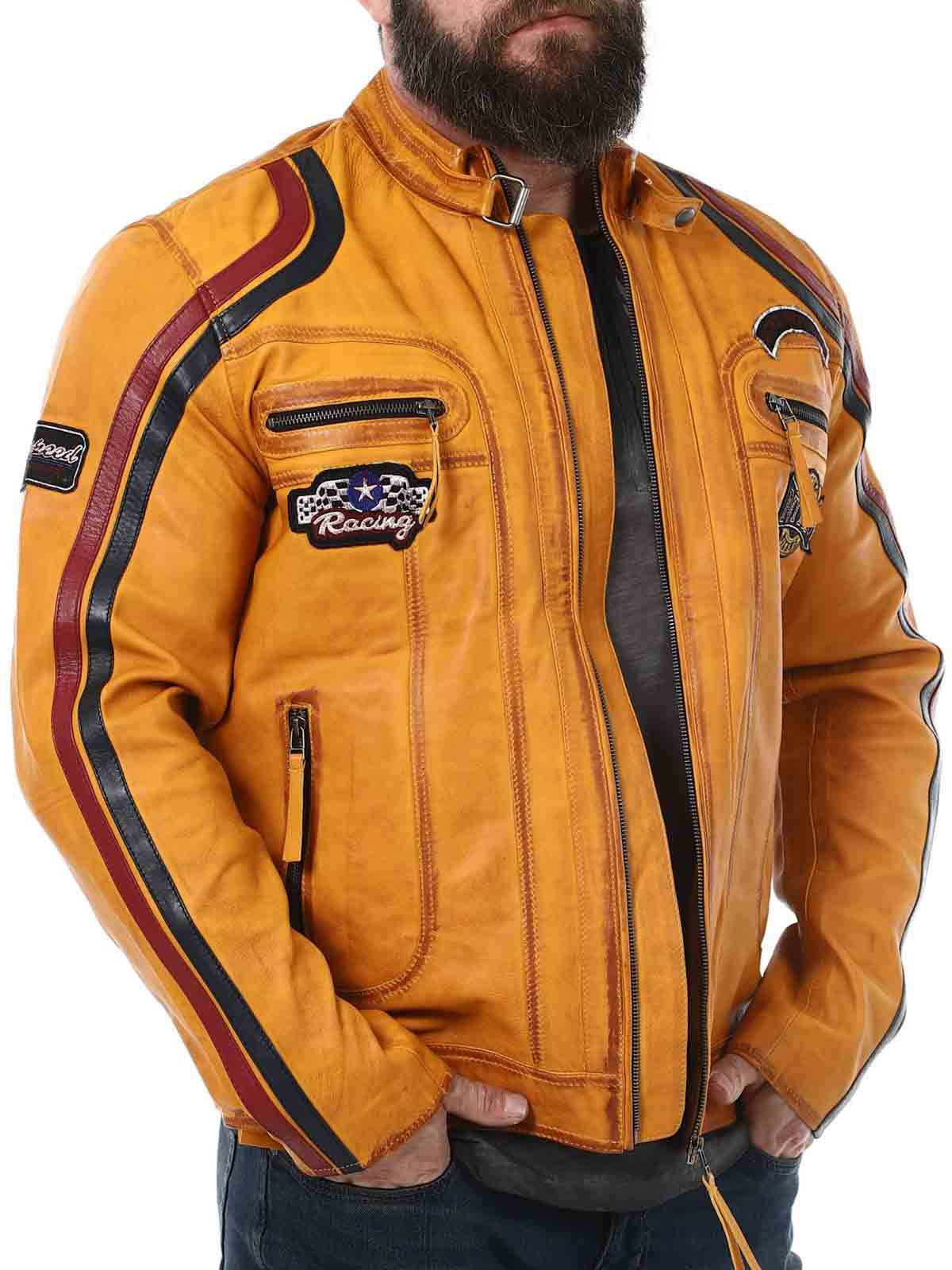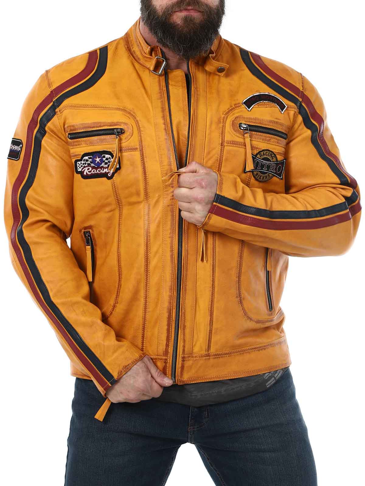 Jakke med lapper i stof og striber, der giver et stilrent racerlook. Jakken er fremstillet af et blødt og smidigt læder. Den har fire lommer fortil, hvor alle er med lynlås. Hertil kommer to lommer indvendigt og justerbare kanter for enden af ærmerne. Denne frække jakke fås kun hos RockDenim!
