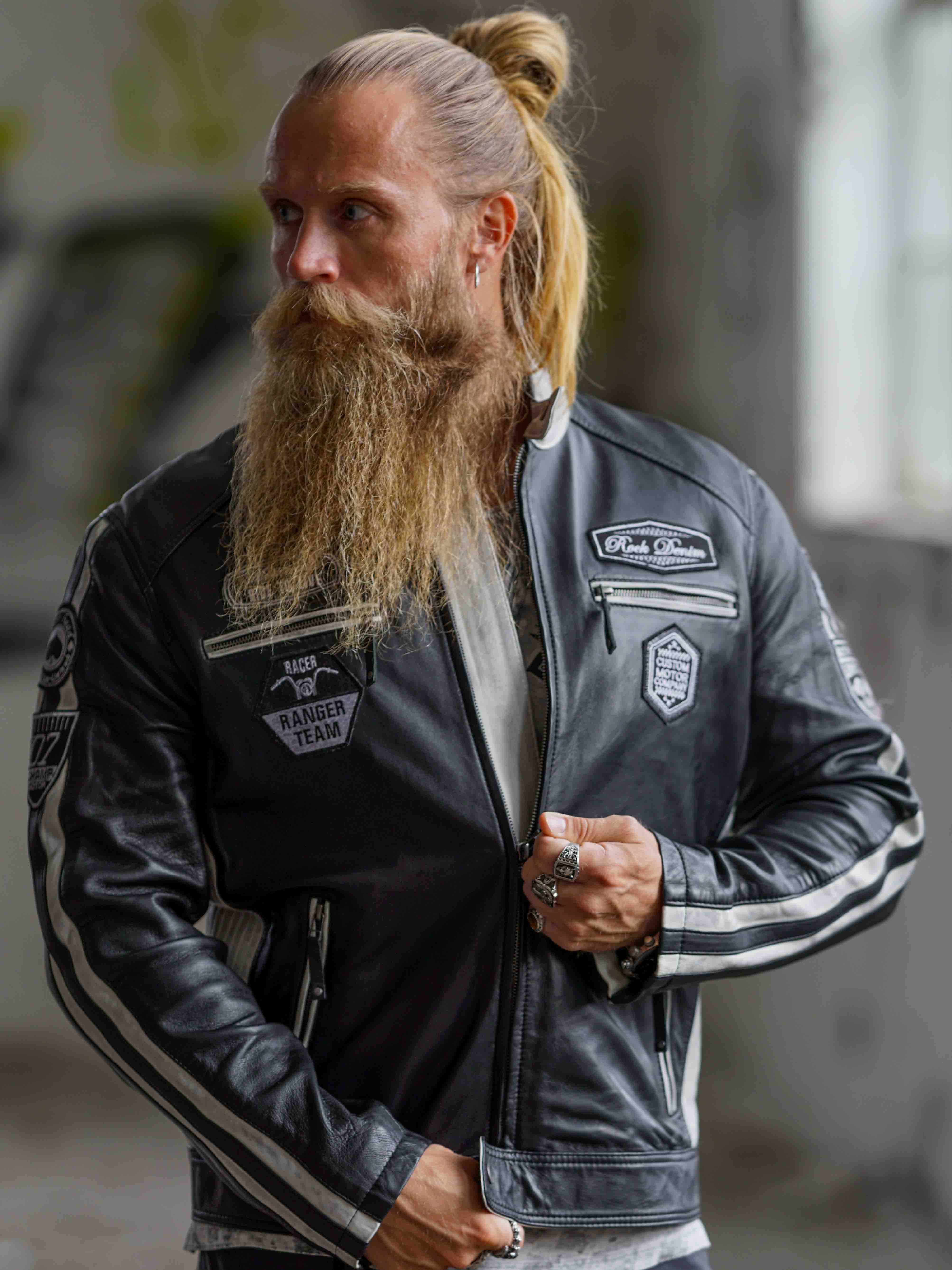 Behagelig skindjakke i et cool design med lapper og hvide striber. Den lukkes ved hjælp af en reel lynlås, og den kan knappes ved hjælp af en trykknap ved halsen, samt ved linningen forneden. Fire lommer med lynlås sidder fortil på jakken, og den har endda to lommer i det quiltede fór. Enderne af ærmerne kan gøres større!