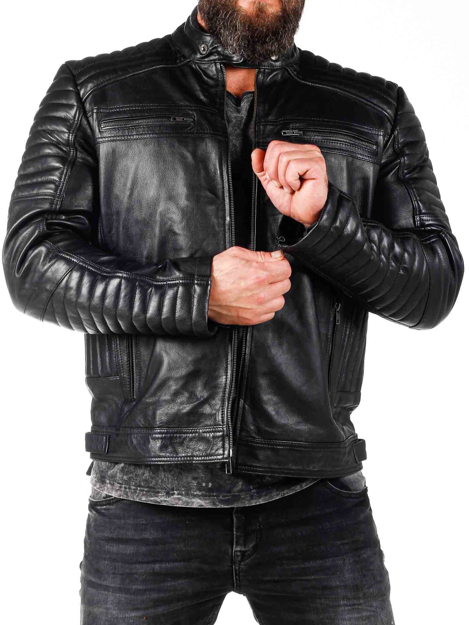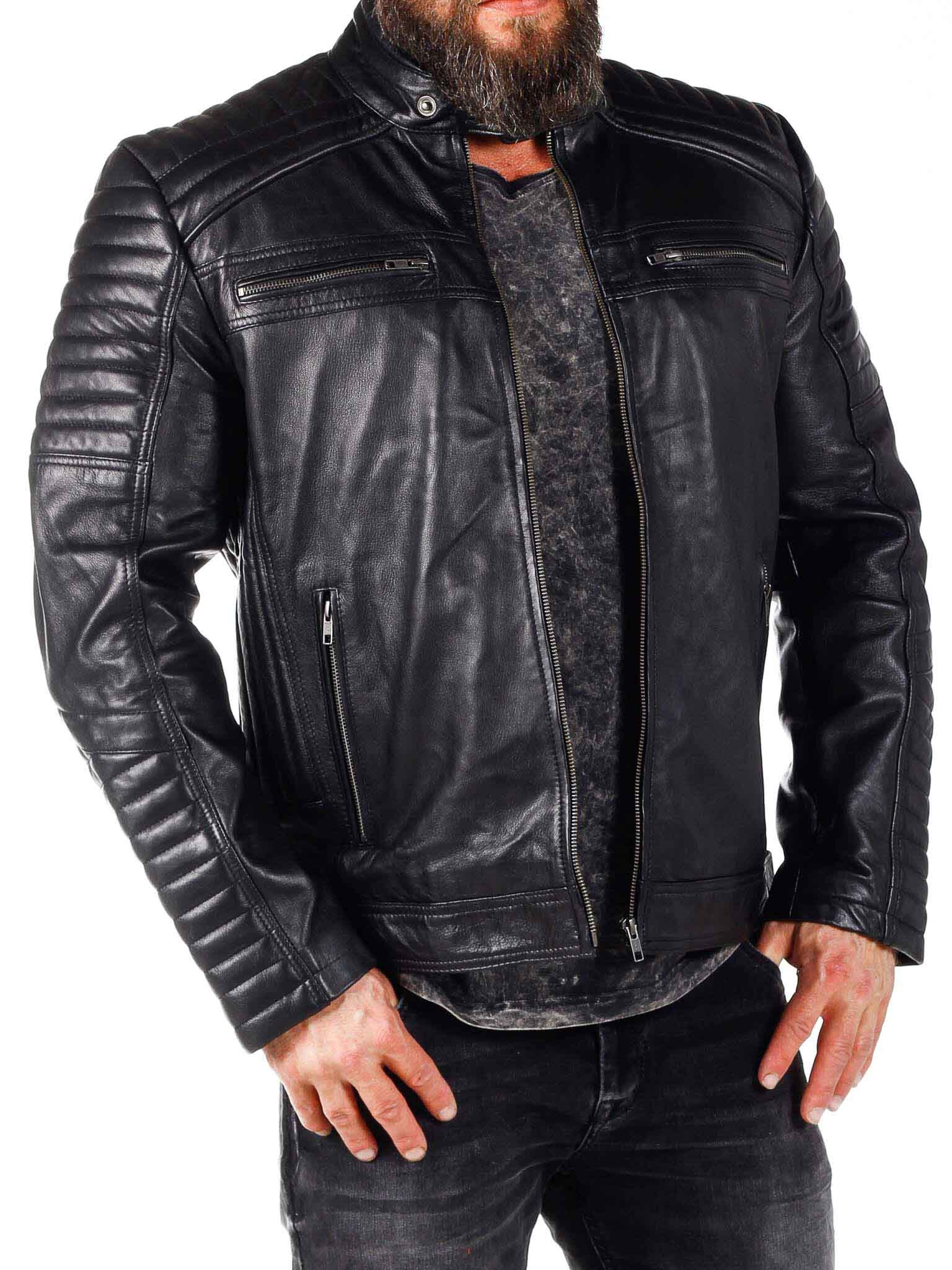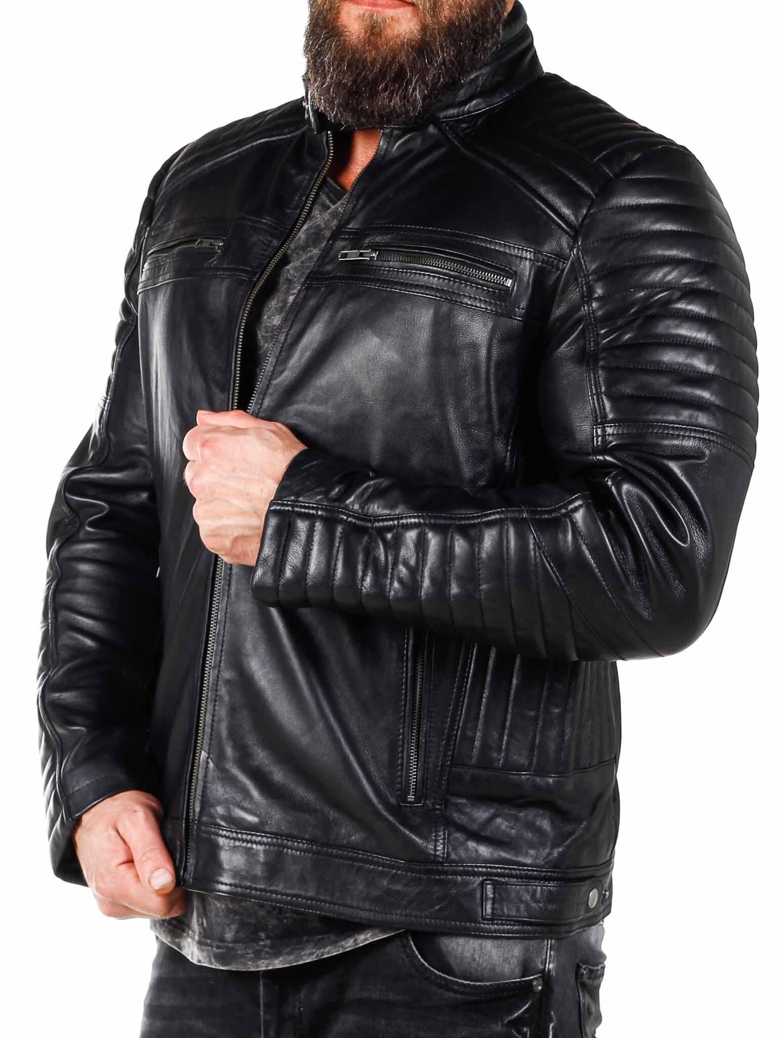 Behagelig jakke i ægte læder, der kan justeres i linningen og for enden af begge ærmer. Der findes fire lommer fortil, der alle kan lukkes, og hertil kommer to lommer indvendigt i jakken. Den kan lukkes ved hjælp af en lynlås, og den har polstrede partier. Denne jakke finder du kun hos RockDenim!