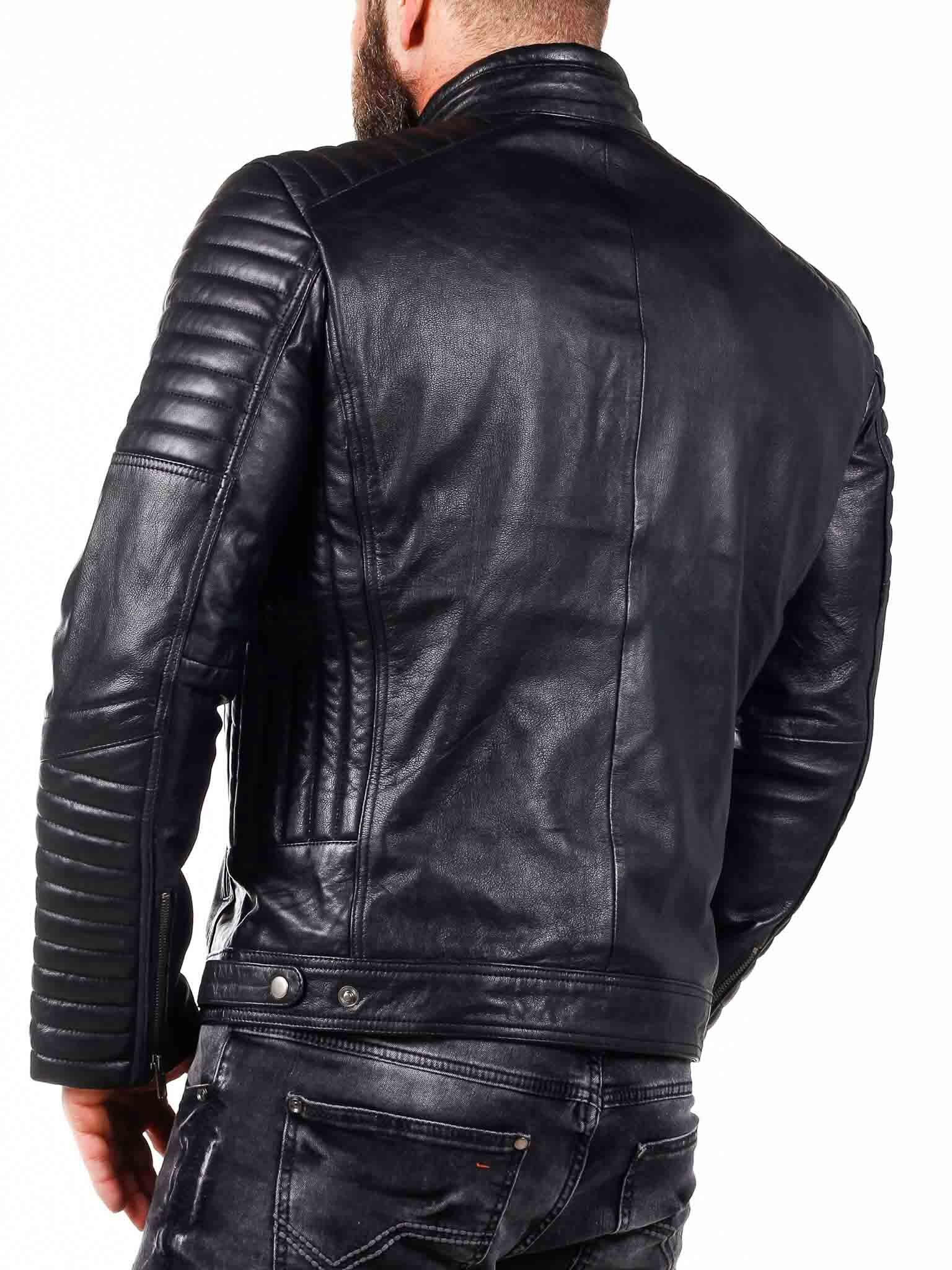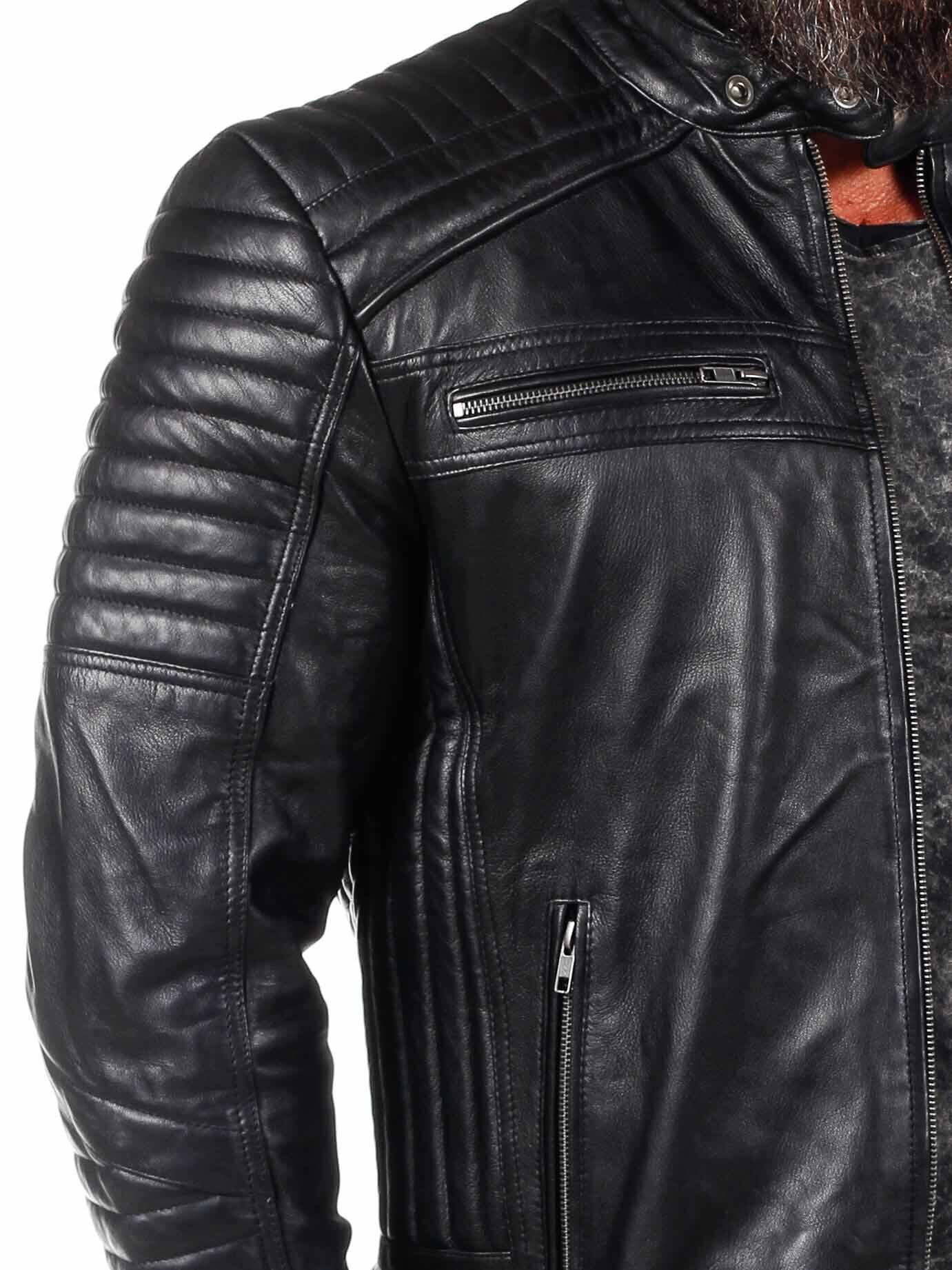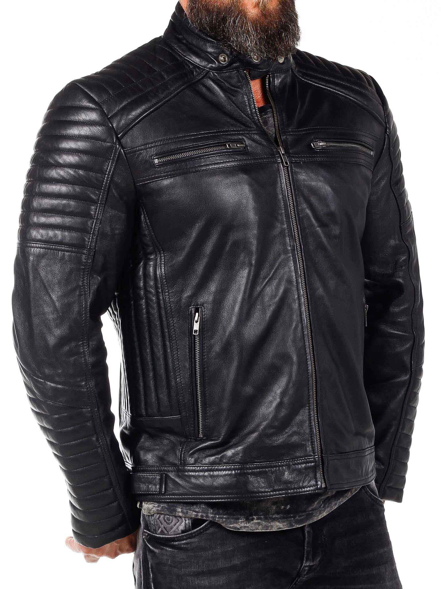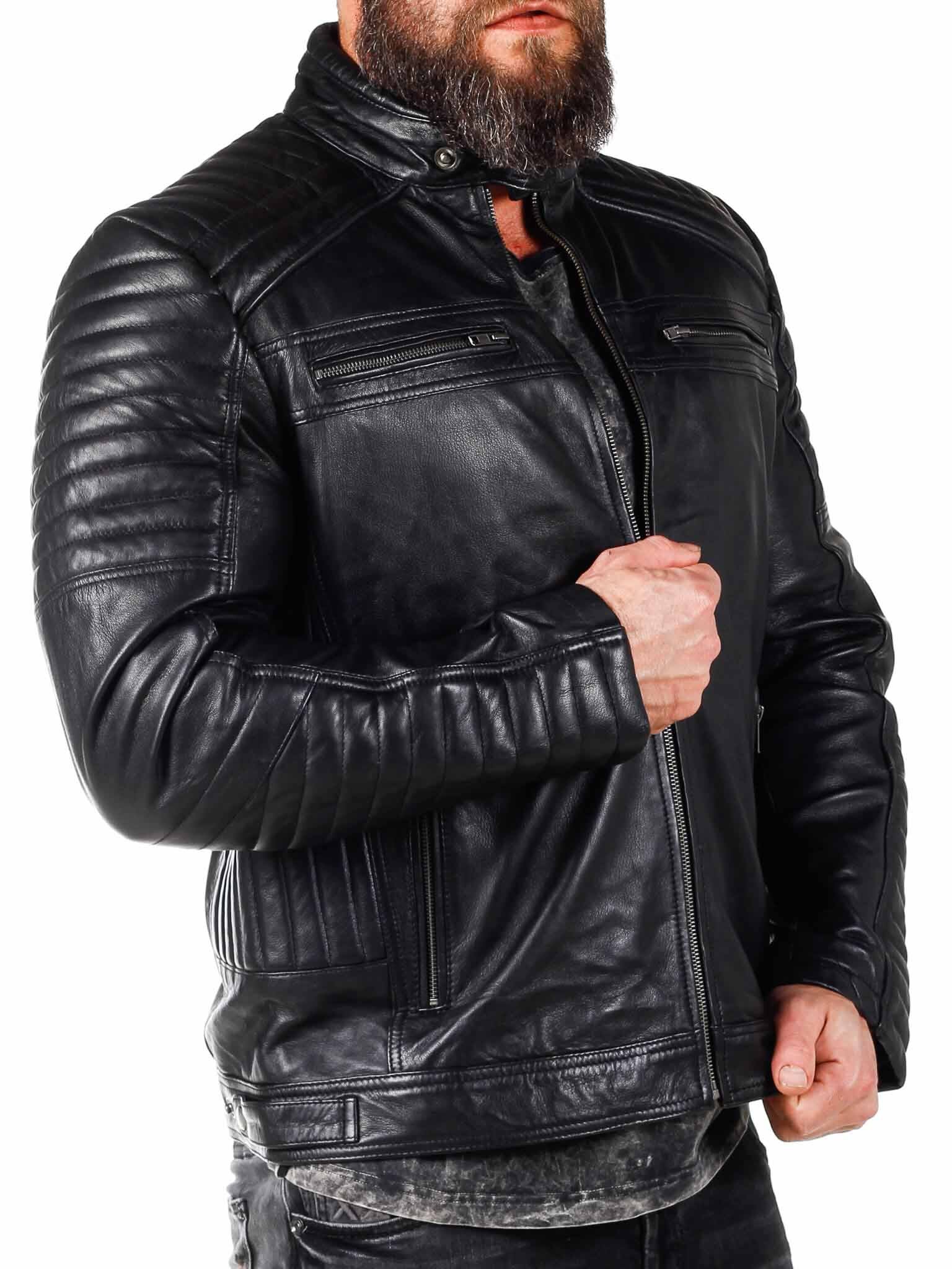 Behagelig jakke i ægte læder, der kan justeres i linningen og for enden af begge ærmer. Der findes fire lommer fortil, der alle kan lukkes, og hertil kommer to lommer indvendigt i jakken. Den kan lukkes ved hjælp af en lynlås, og den har polstrede partier. Denne jakke finder du kun hos RockDenim!