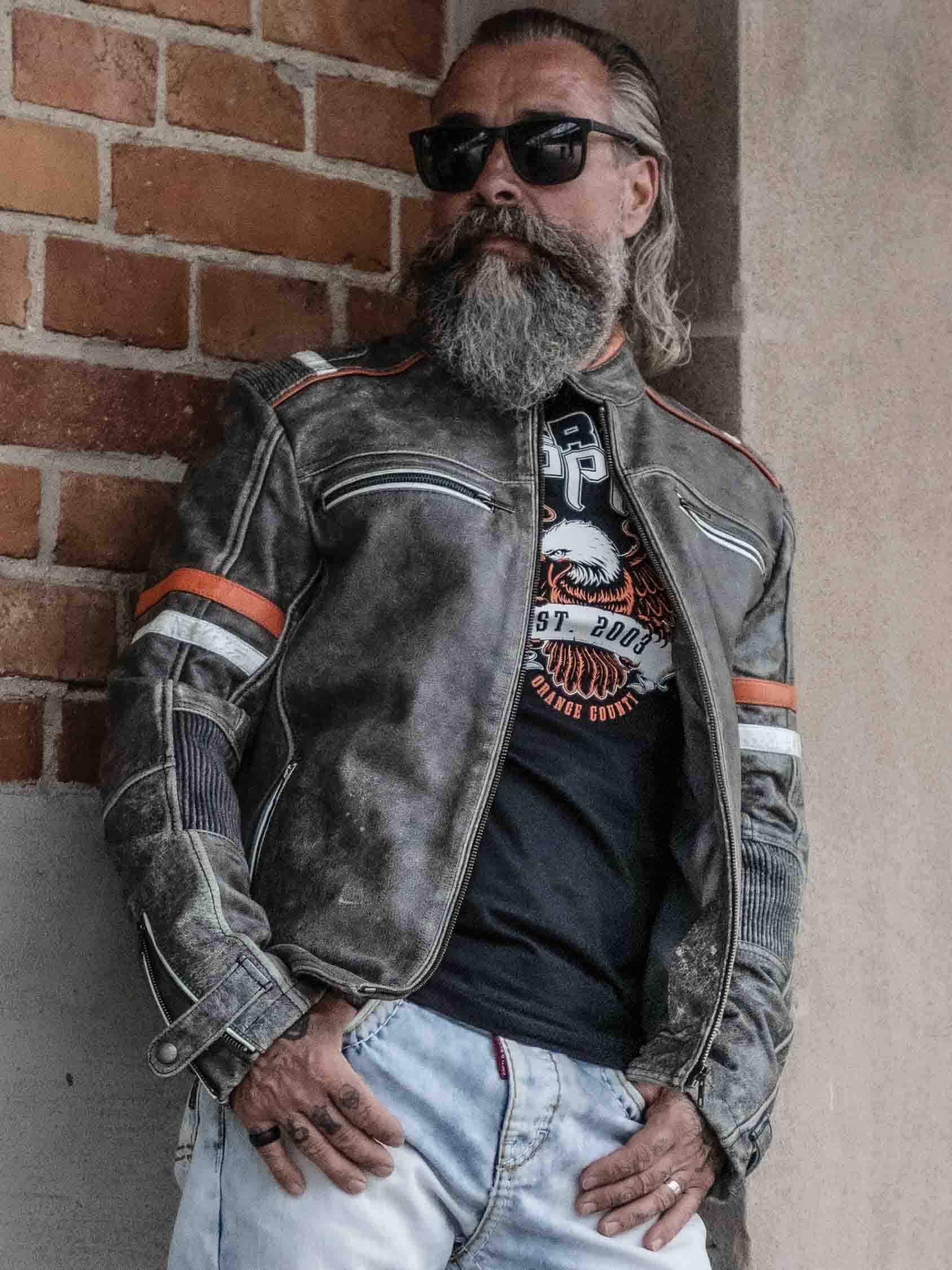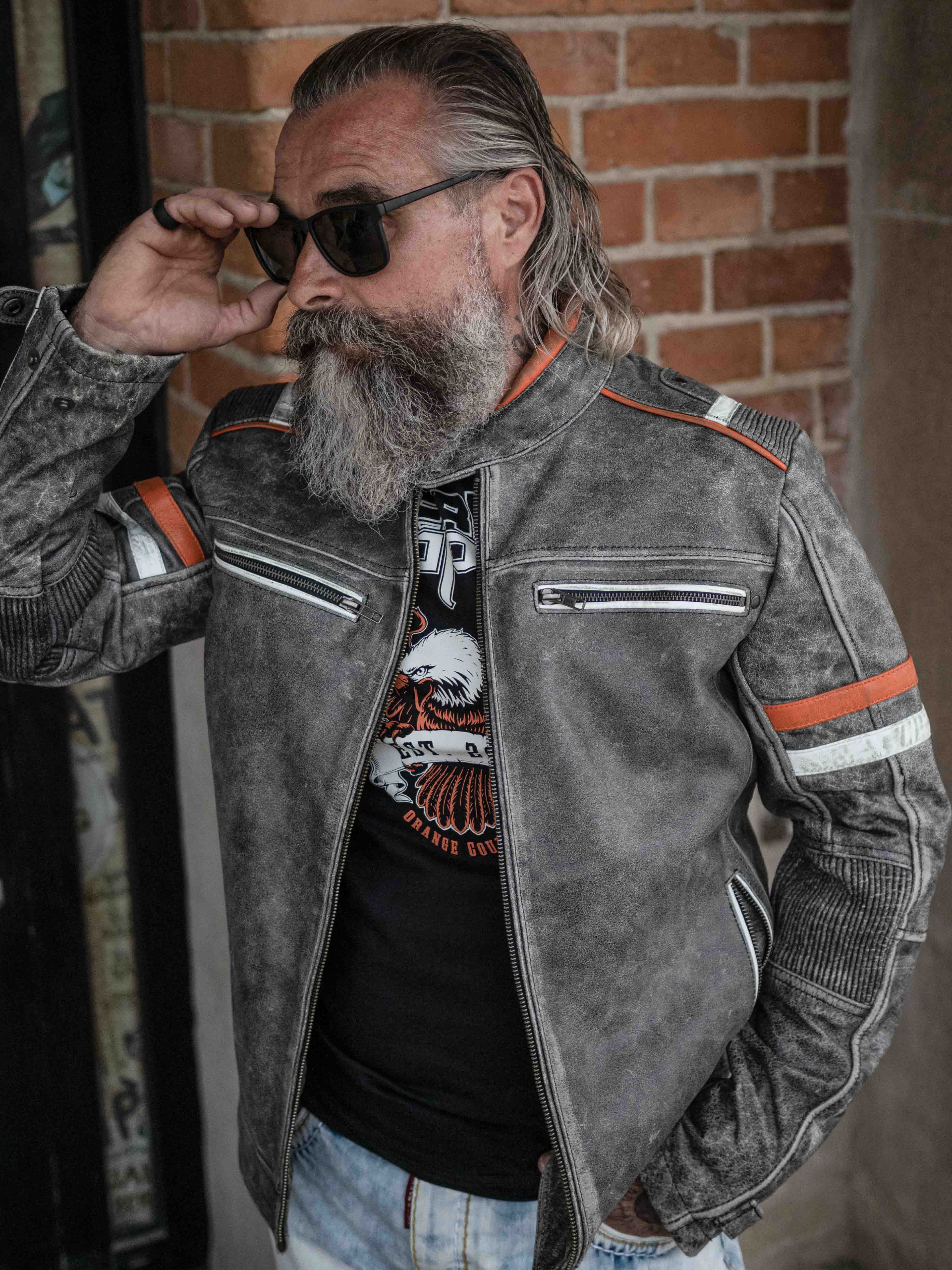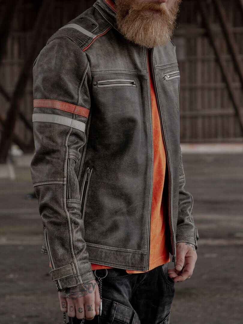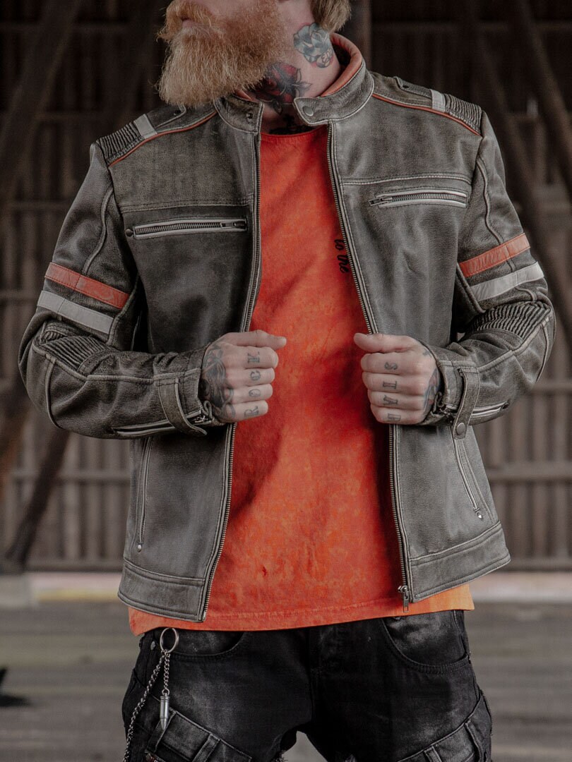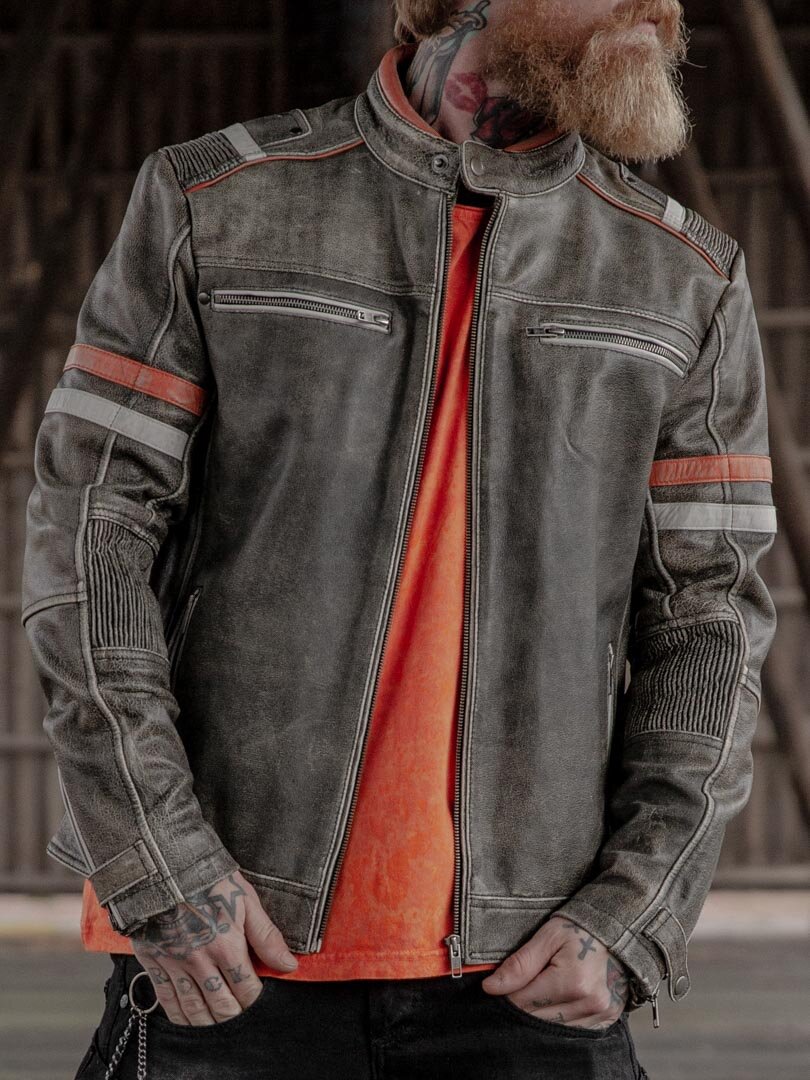 Solid skindjakke med et vintage udseende samt kontraster fra RockDenims eget mærke. Det er en skindjakke med en normal længde, samt orange og lyseblå striber på armene, samt på skuldrenne. Inspireret af motorsporten. Kvalitetslæder med en flot pasform og et hårdt design. To lommer findes på maven og to brystlommer, alle med lynlås. Én åben inderlomme og én indeerlomme med lynlås. En knap findes også i halsen. Dette er en skindjakke i en god kvalitet, som du kun finder på RockDenim.