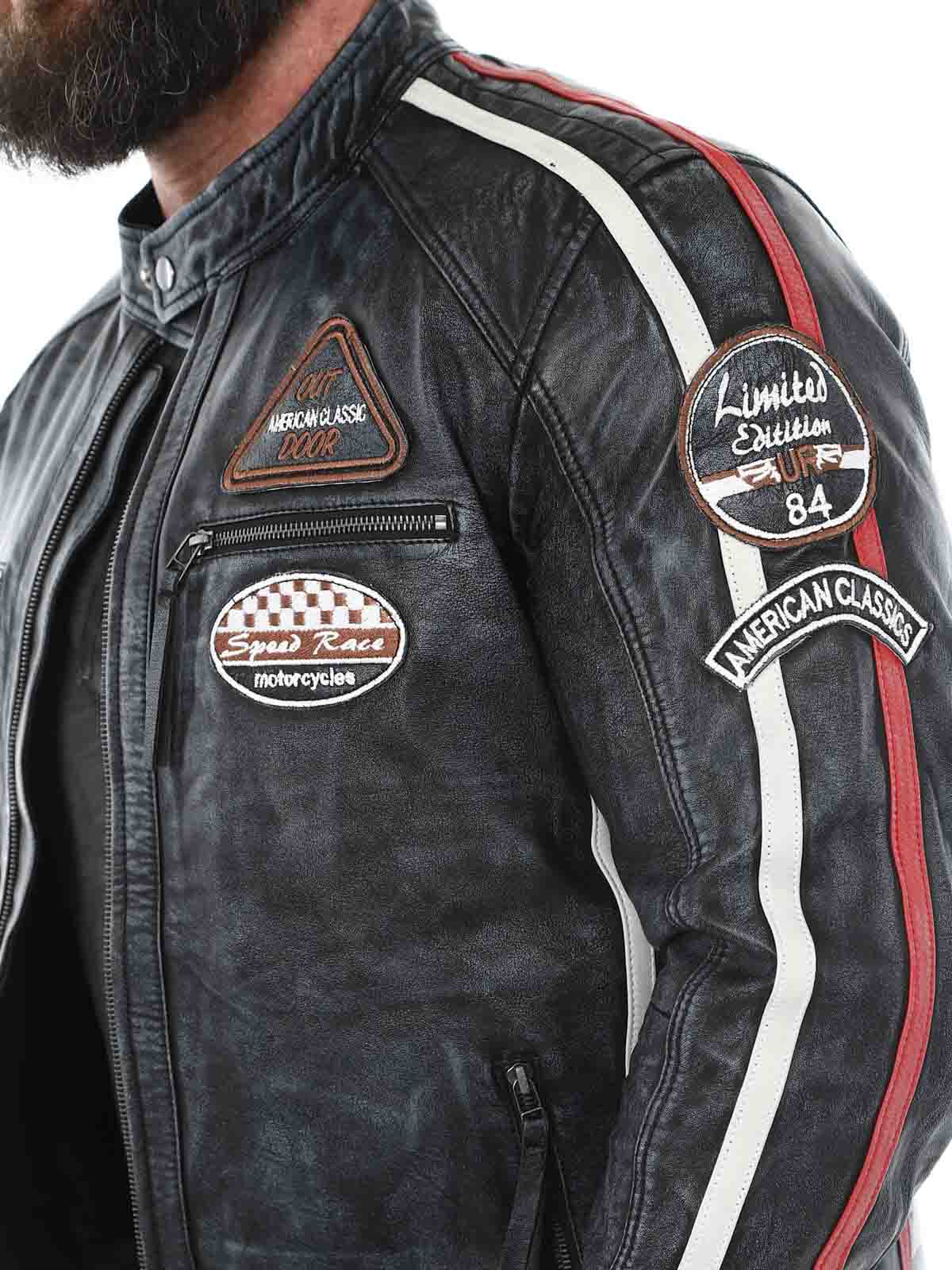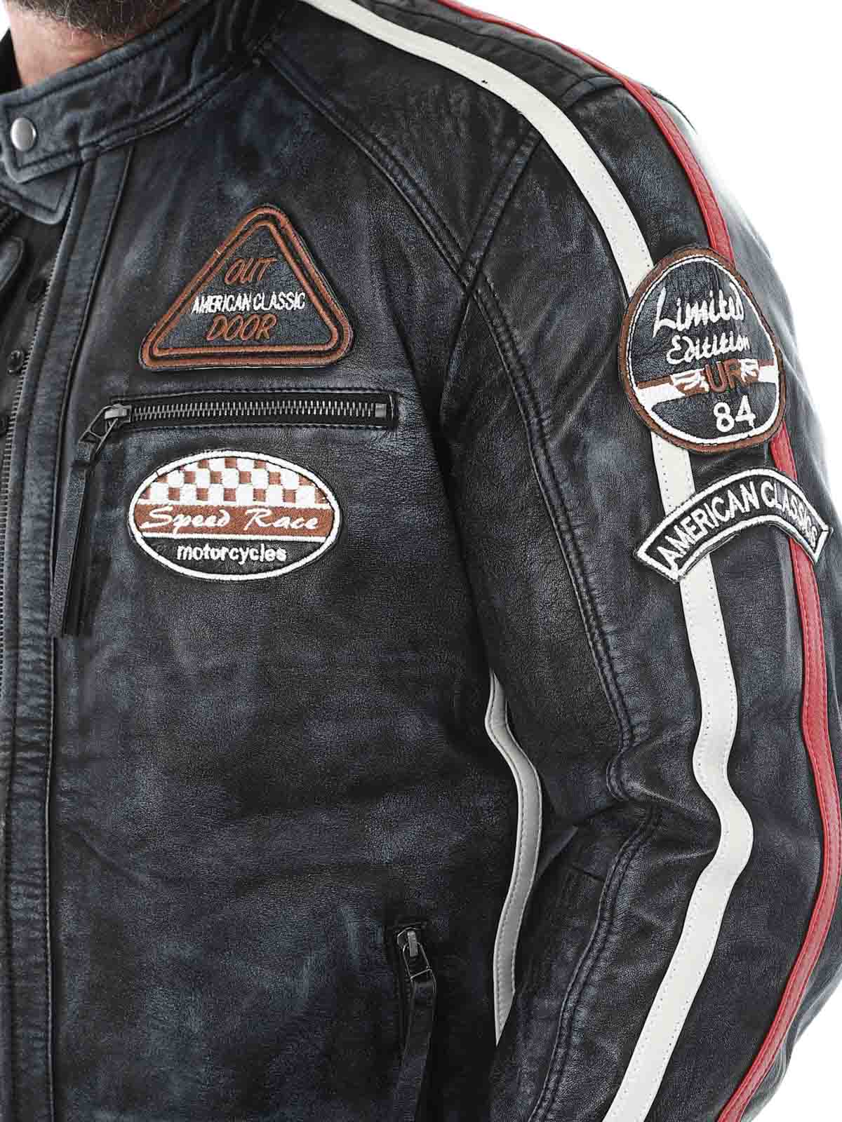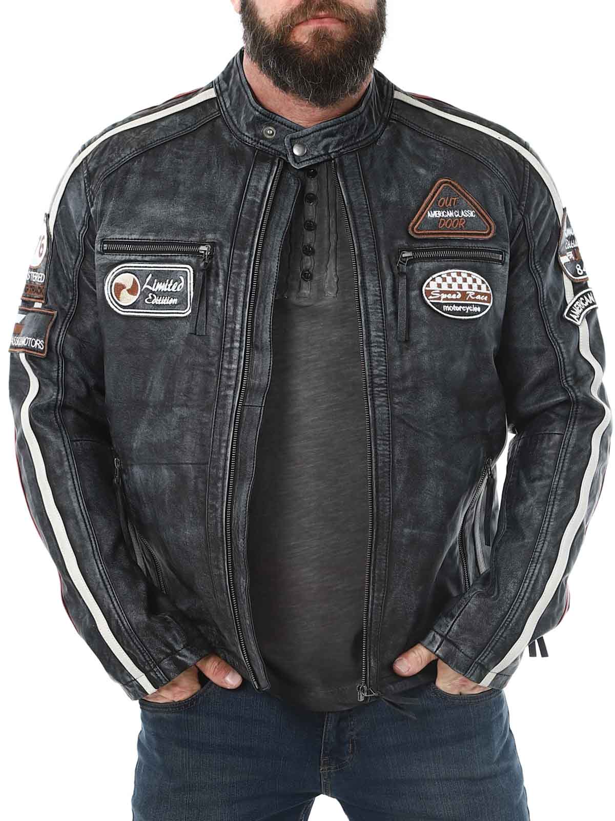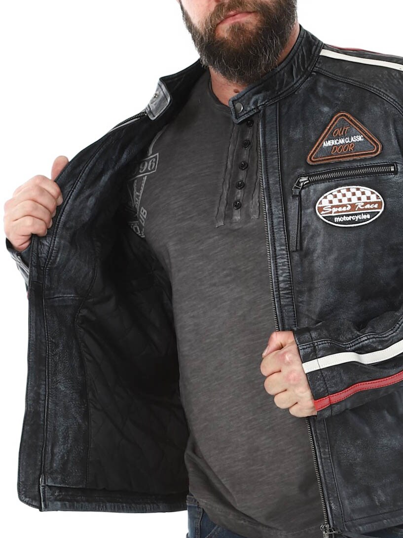Racing-inspireret jakke med lapper i stof og hertil kommer striber. Jakken er fremstillet i et blødt og smidigt læder med et vintage look. Den har fire lommer fortil, hvor alle er med lynlås, to lommer indvendigt og justerbare kanter for enden af ærmerne. Du kan kun finde denne jakke hos RockDenim!