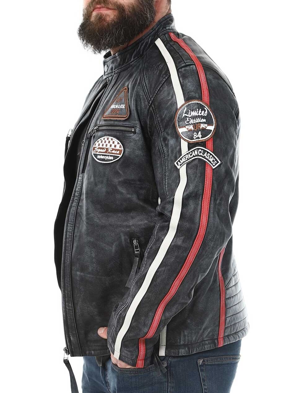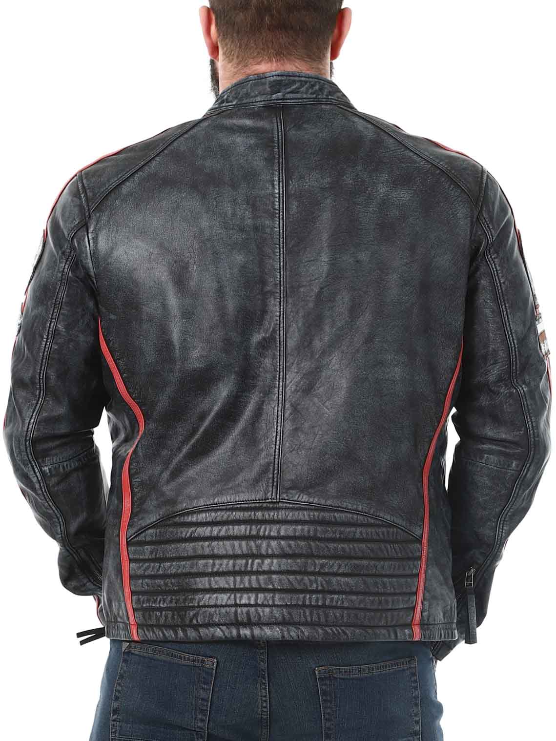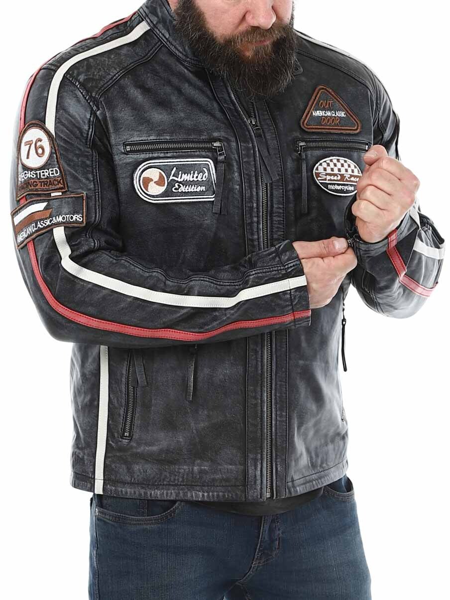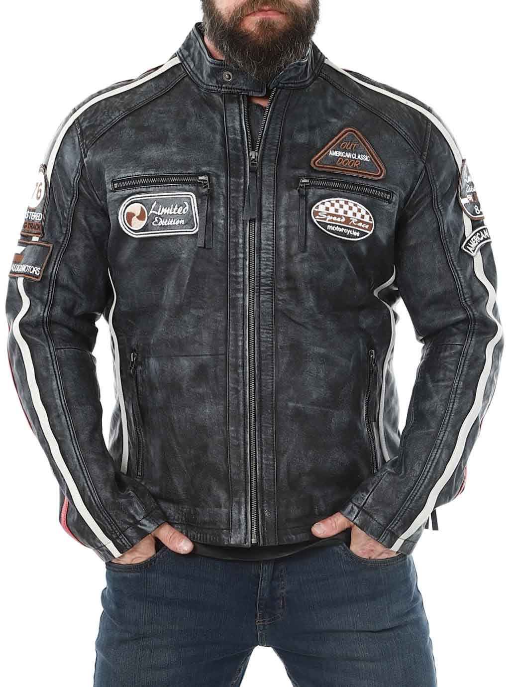 Racing-inspireret jakke med lapper i stof og hertil kommer striber. Jakken er fremstillet i et blødt og smidigt læder med et vintage look. Den har fire lommer fortil, hvor alle er med lynlås, to lommer indvendigt og justerbare kanter for enden af ærmerne. Du kan kun finde denne jakke hos RockDenim!