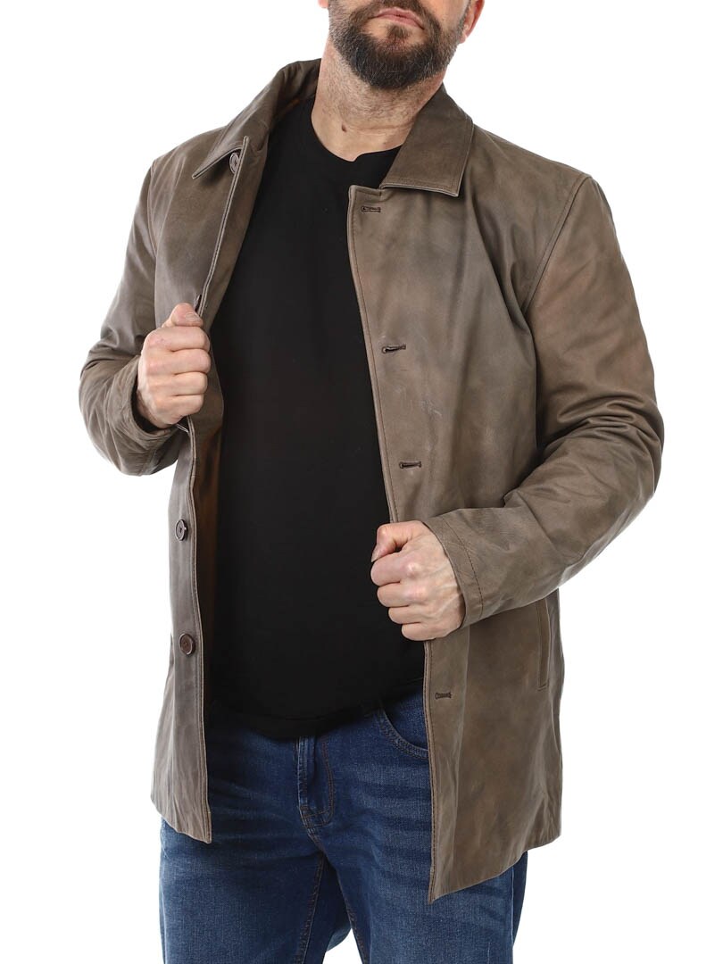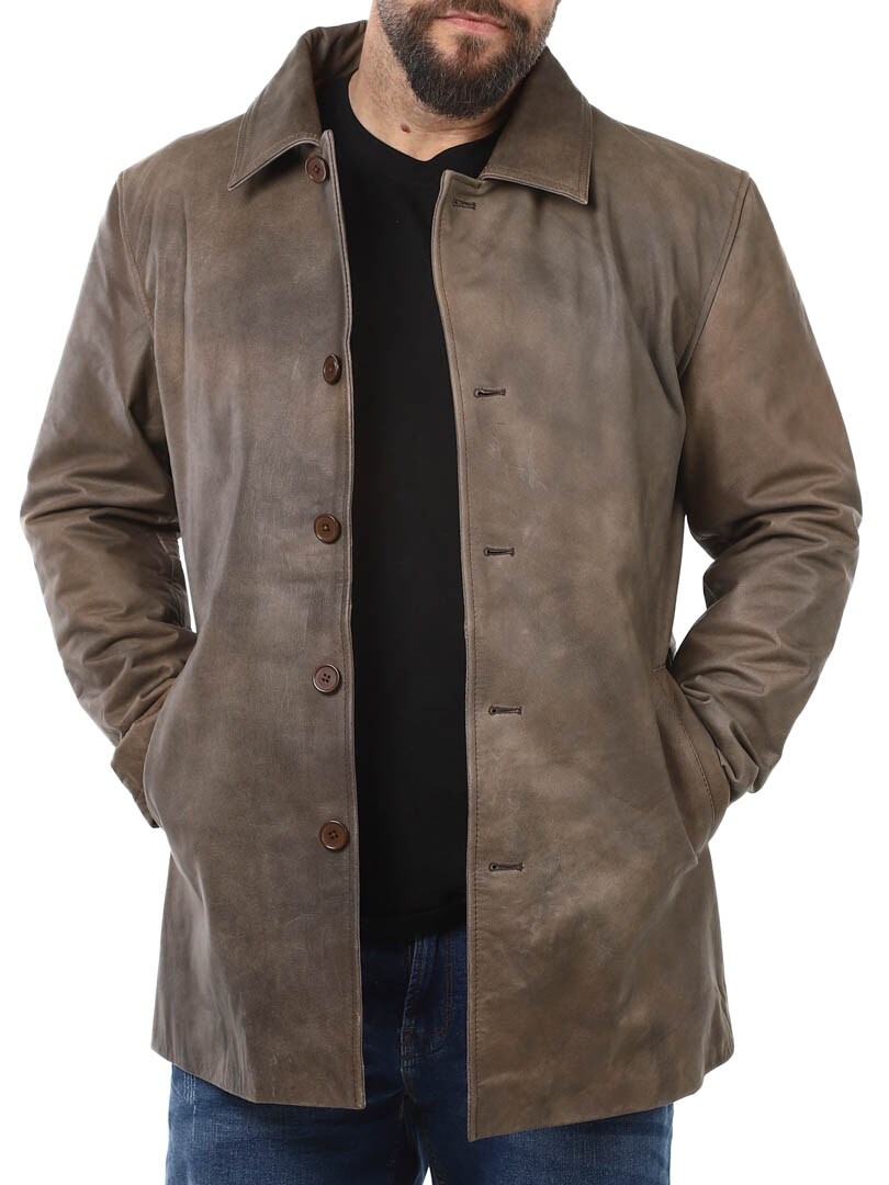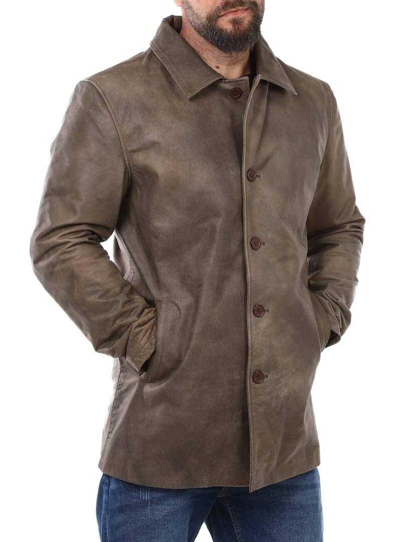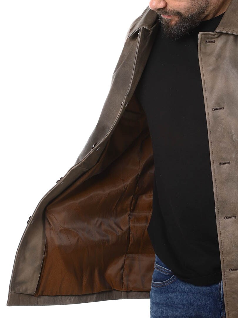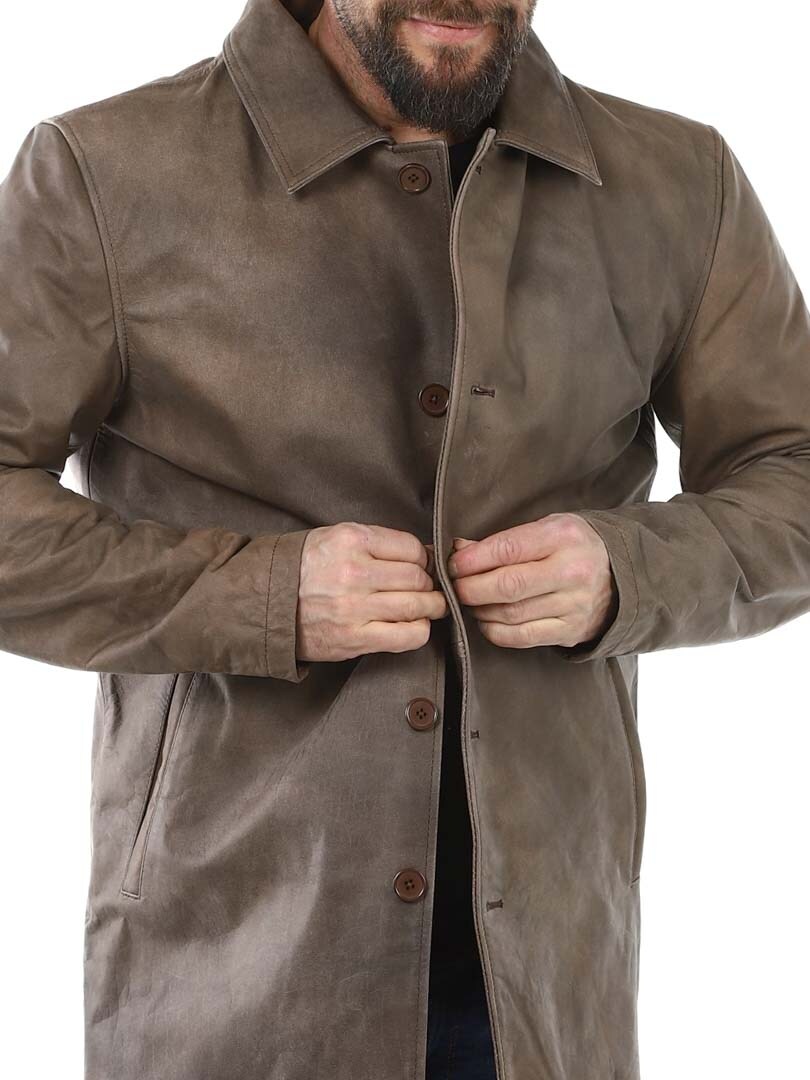 Stilfuld frakke i brun med fire lommer fortil samt to indvendige lommer. Den har krave og lukkes ved hjælp af knapper. Giv din garderobe en elegant opgradering med denne brune læderfrakke, som du kun kan finde hos RockDenim!