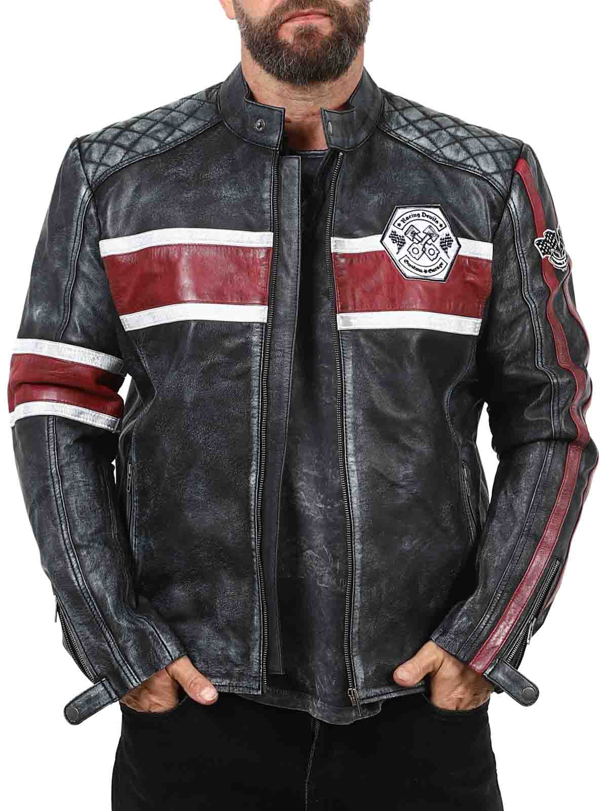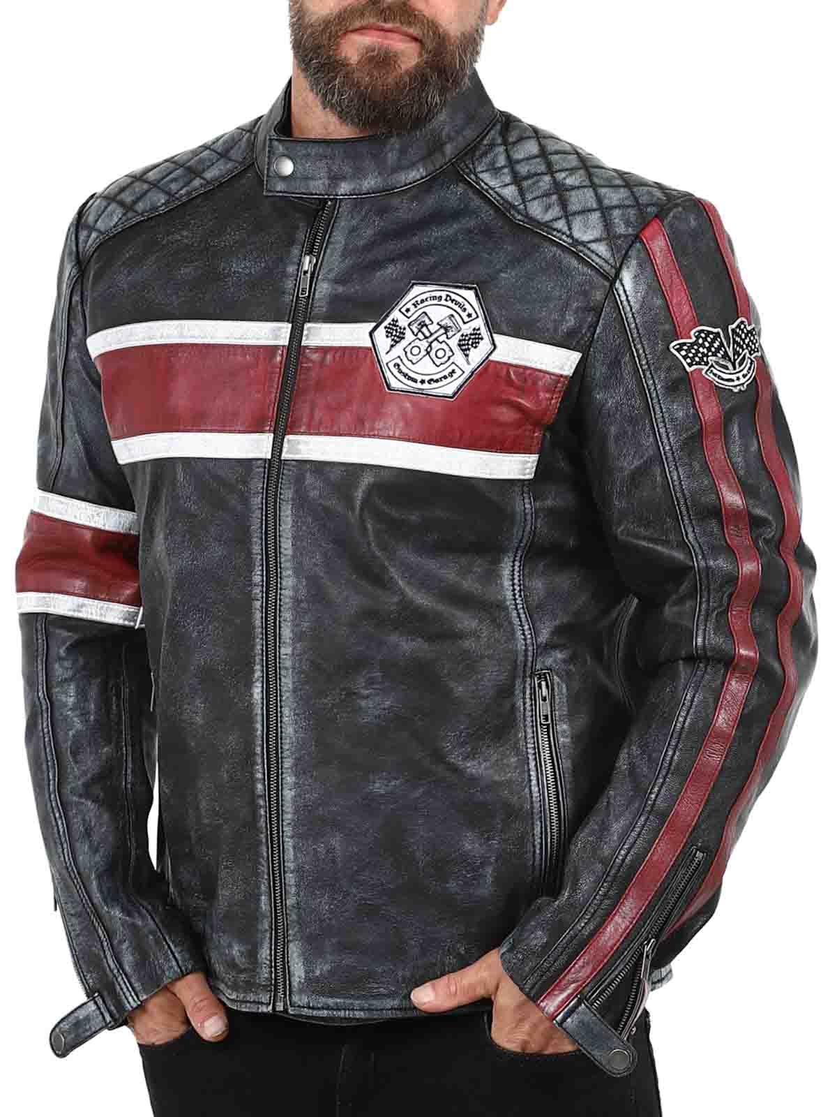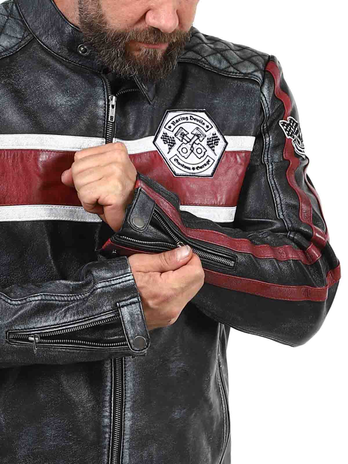 Denne jakke i ægte fåreskind har et råt og vintage-inspireret look, der fanger øjet. De markante røde og hvide striber giver en sporty følelse, mens den slidte finish fremhæver jakkens karakter. Med detaljer som lapper i stof, robuste lynlåse og forstærkede sektioner er dette den perfekte jakke til dem, der ønsker at kombinere en klassisk biker-stil med et cool twist!