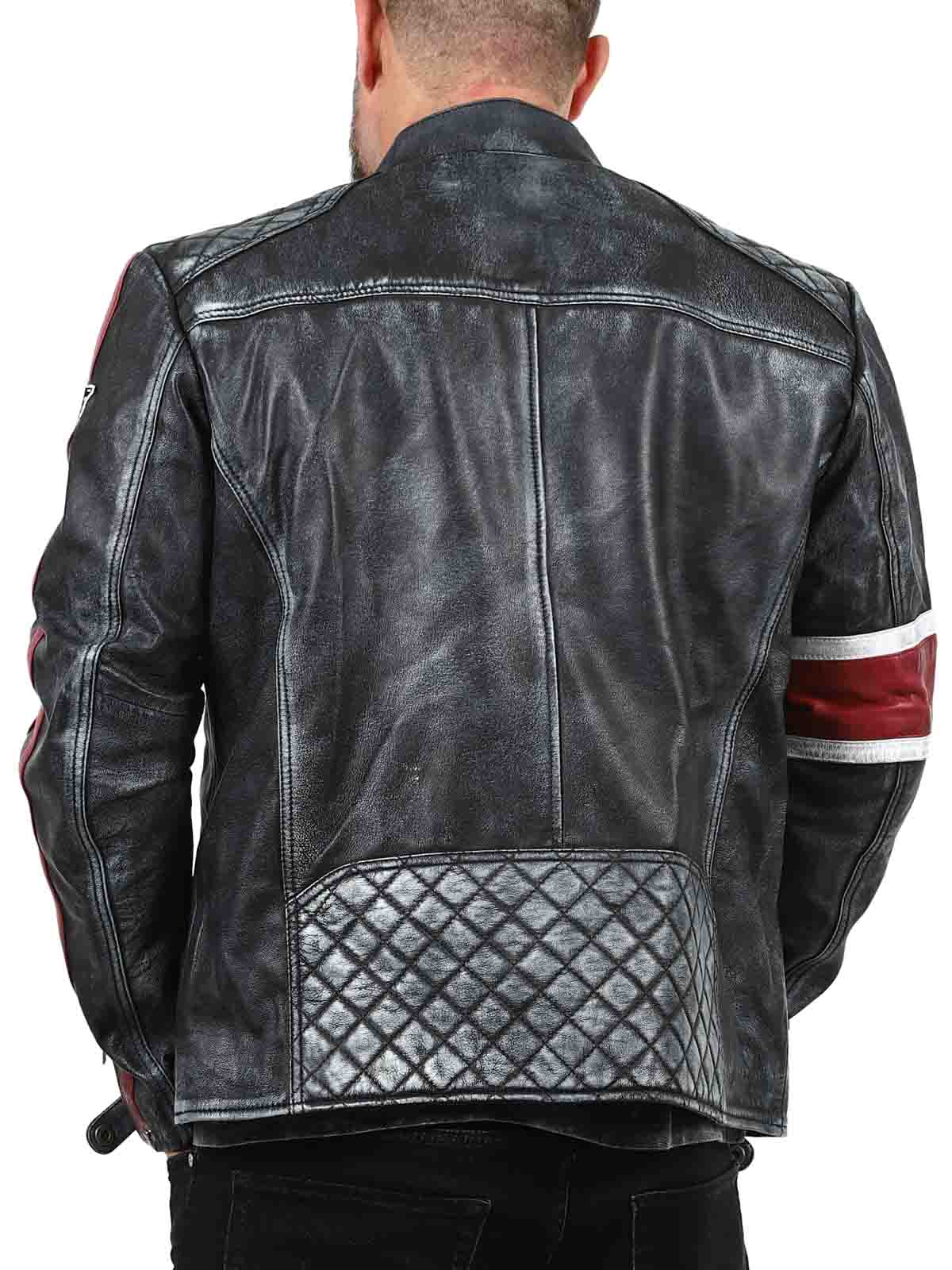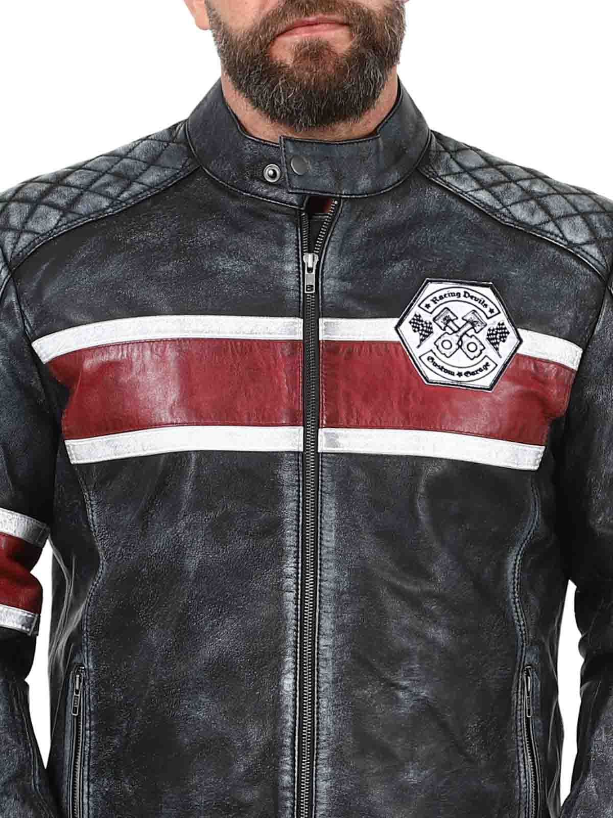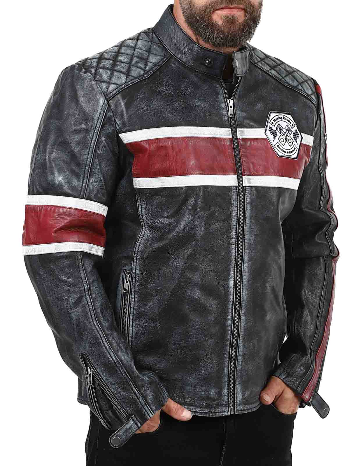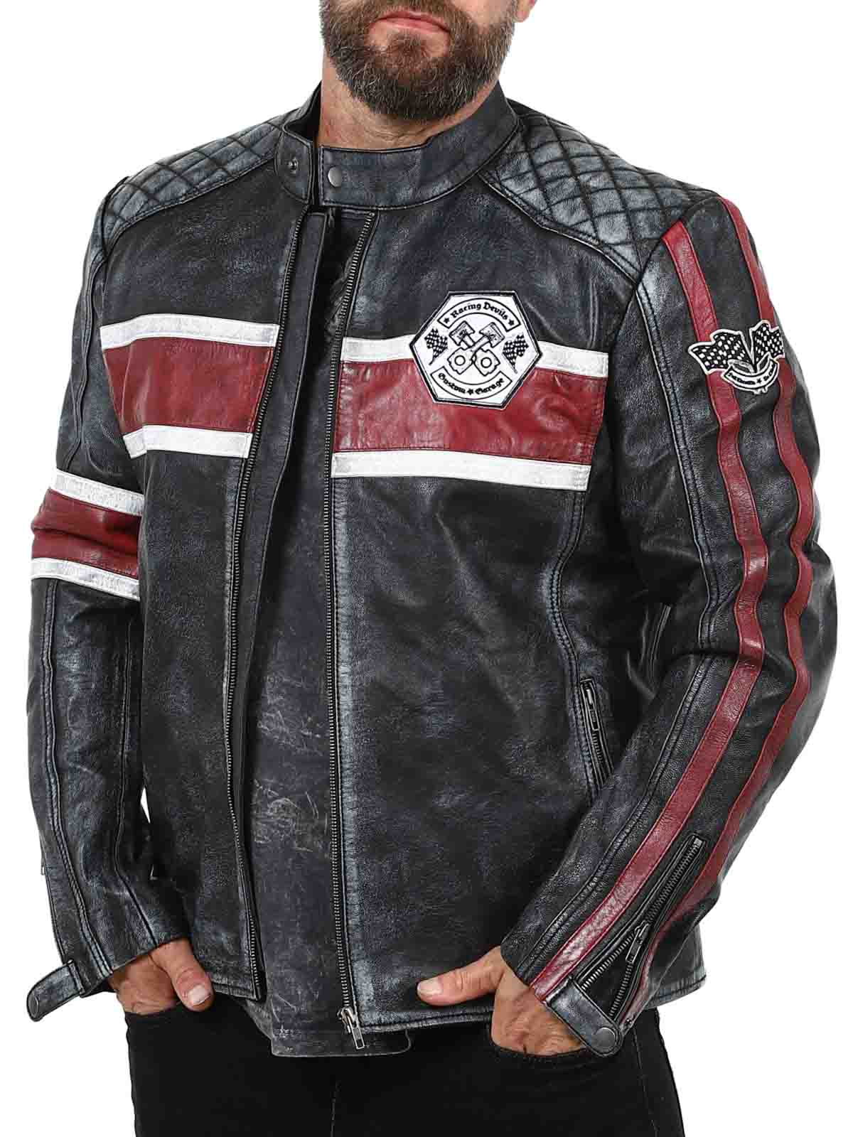 Denne jakke i ægte fåreskind har et råt og vintage-inspireret look, der fanger øjet. De markante røde og hvide striber giver en sporty følelse, mens den slidte finish fremhæver jakkens karakter. Med detaljer som lapper i stof, robuste lynlåse og forstærkede sektioner er dette den perfekte jakke til dem, der ønsker at kombinere en klassisk biker-stil med et cool twist!