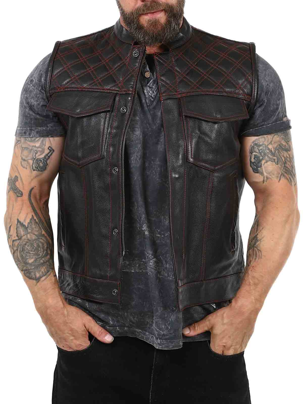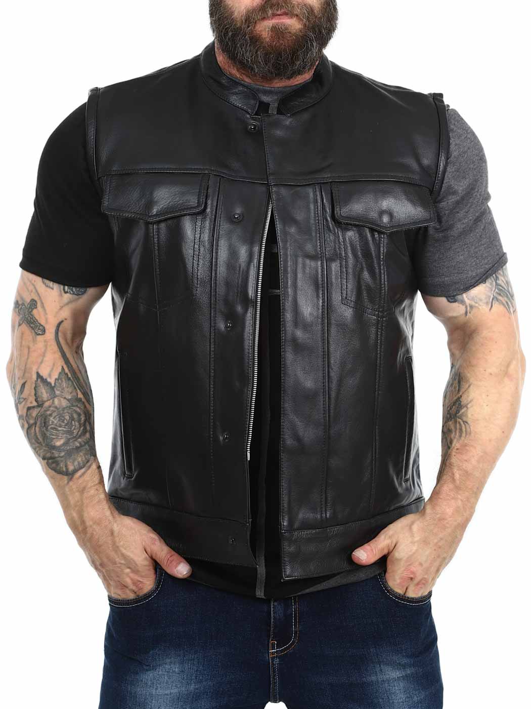 Solid lædervest i ægte læder med en lav krave. Der er to lommer på brystet, der begge kan lukkes, to åbne lommer på maven og to åbne lommer indvendigt. Vesten lukkes med både lynlås og knapper. Du kan kun finde denne vest hos RockDenim!