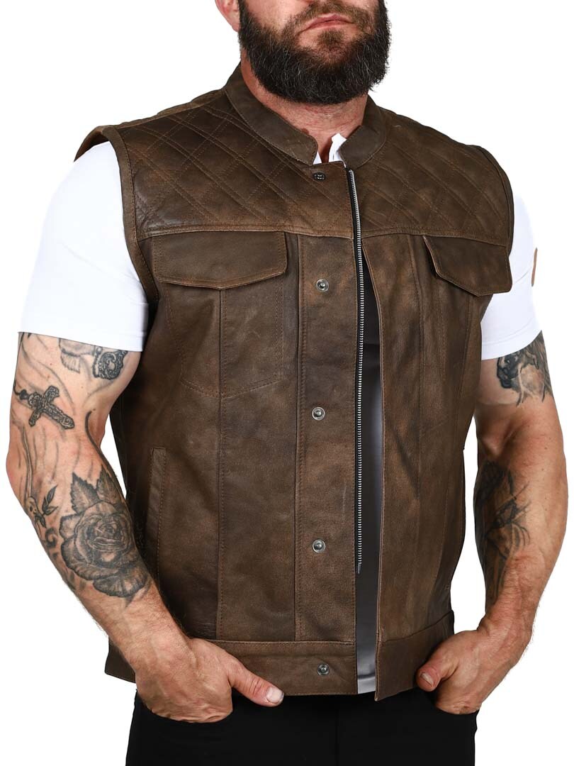 Solid lædervest i ægte læder med en lav krave. Der er to lommer på brystet, der begge kan lukkes, to åbne lommer på maven og to åbne lommer indvendigt. Vesten lukkes med både lynlås og knapper. Du kan kun finde denne vest hos RockDenim!