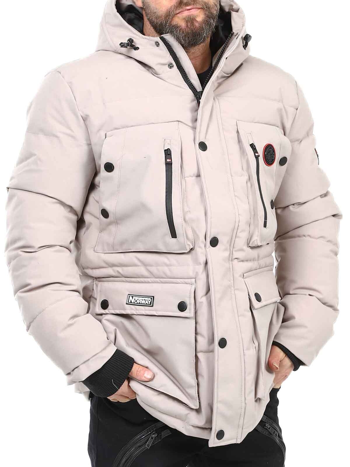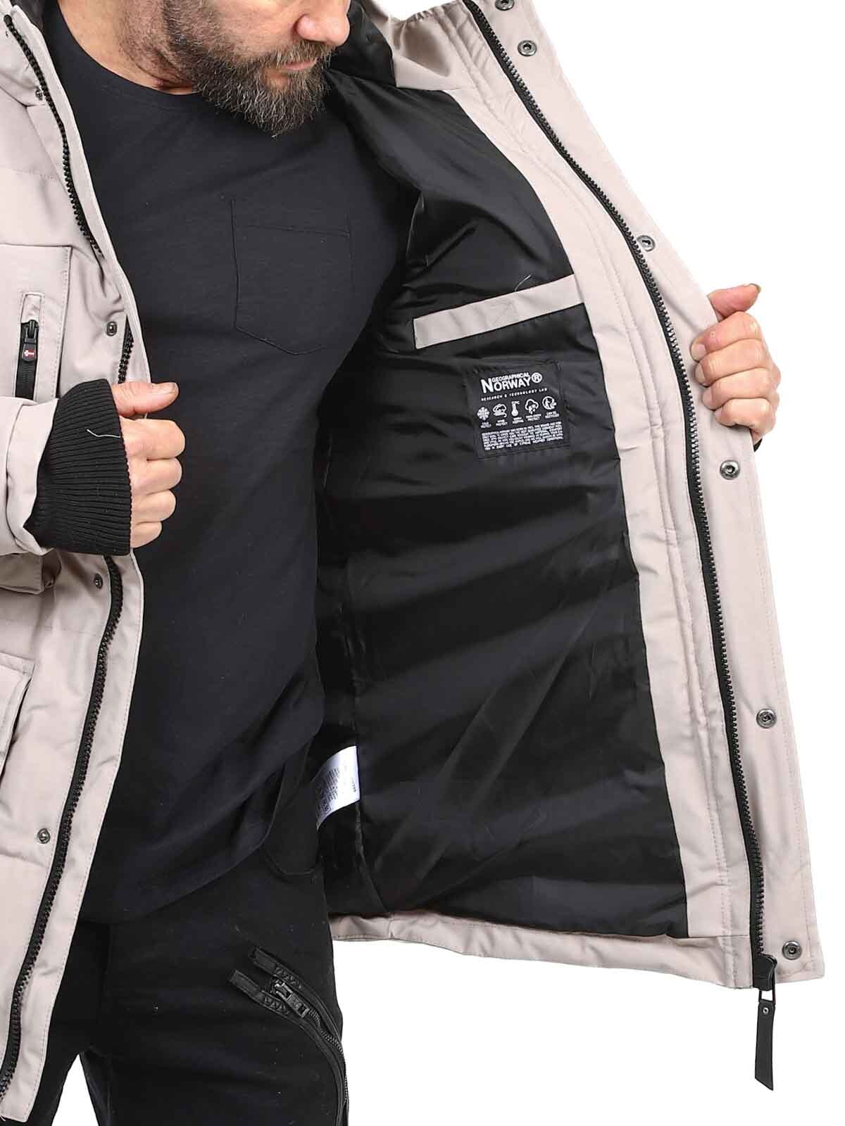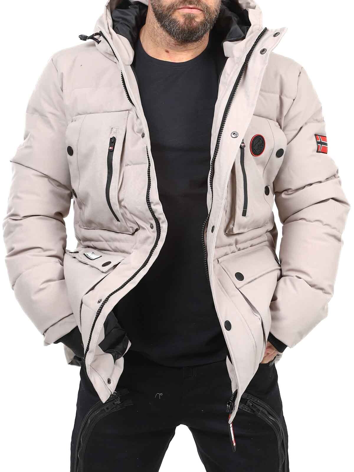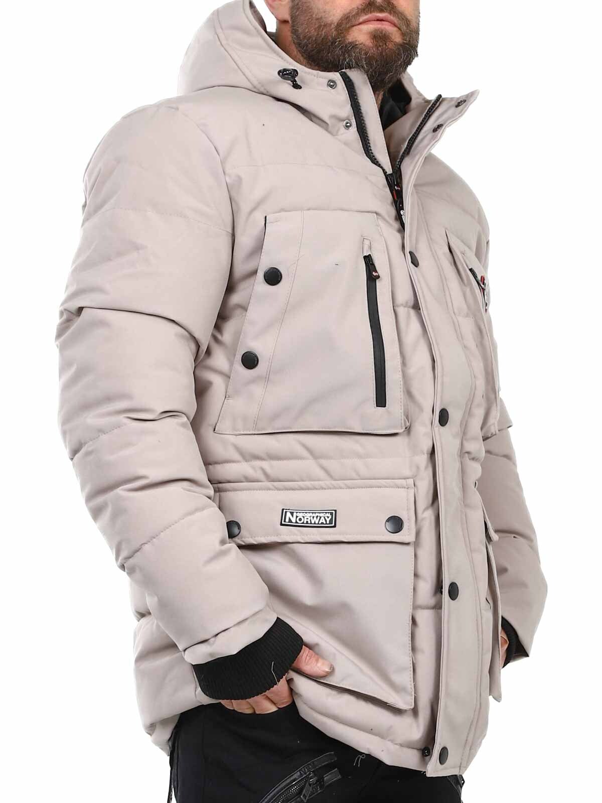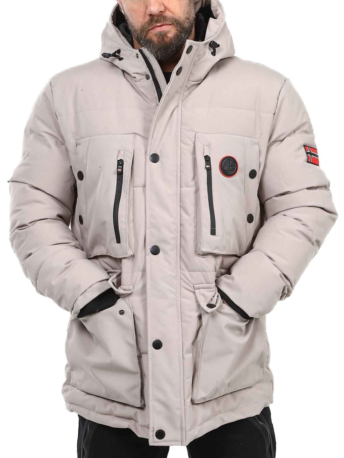 Flot vinterjakke i en længre model med et vamrt fór. Den har en hætte med en lukkemekaniske, en ribstrikket kant for enden af ærmerne, samt flere lommer, der kan lukkes. Jakke kan lukkes med både lynlås og knapper.