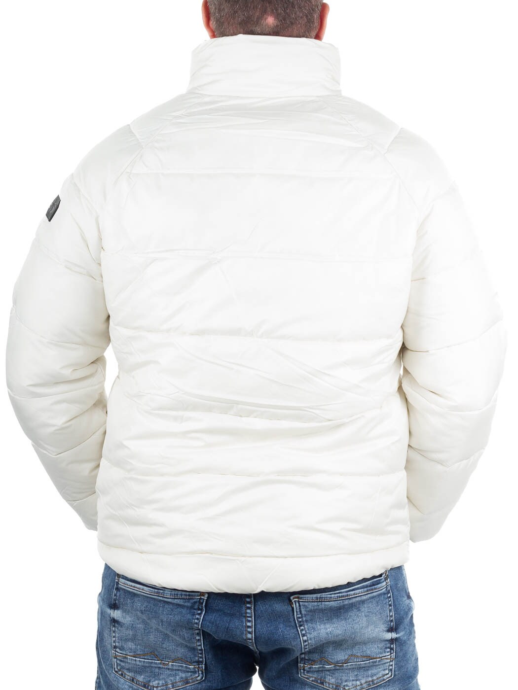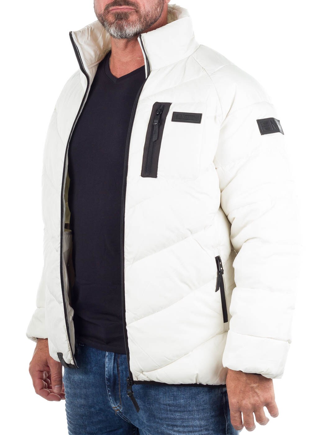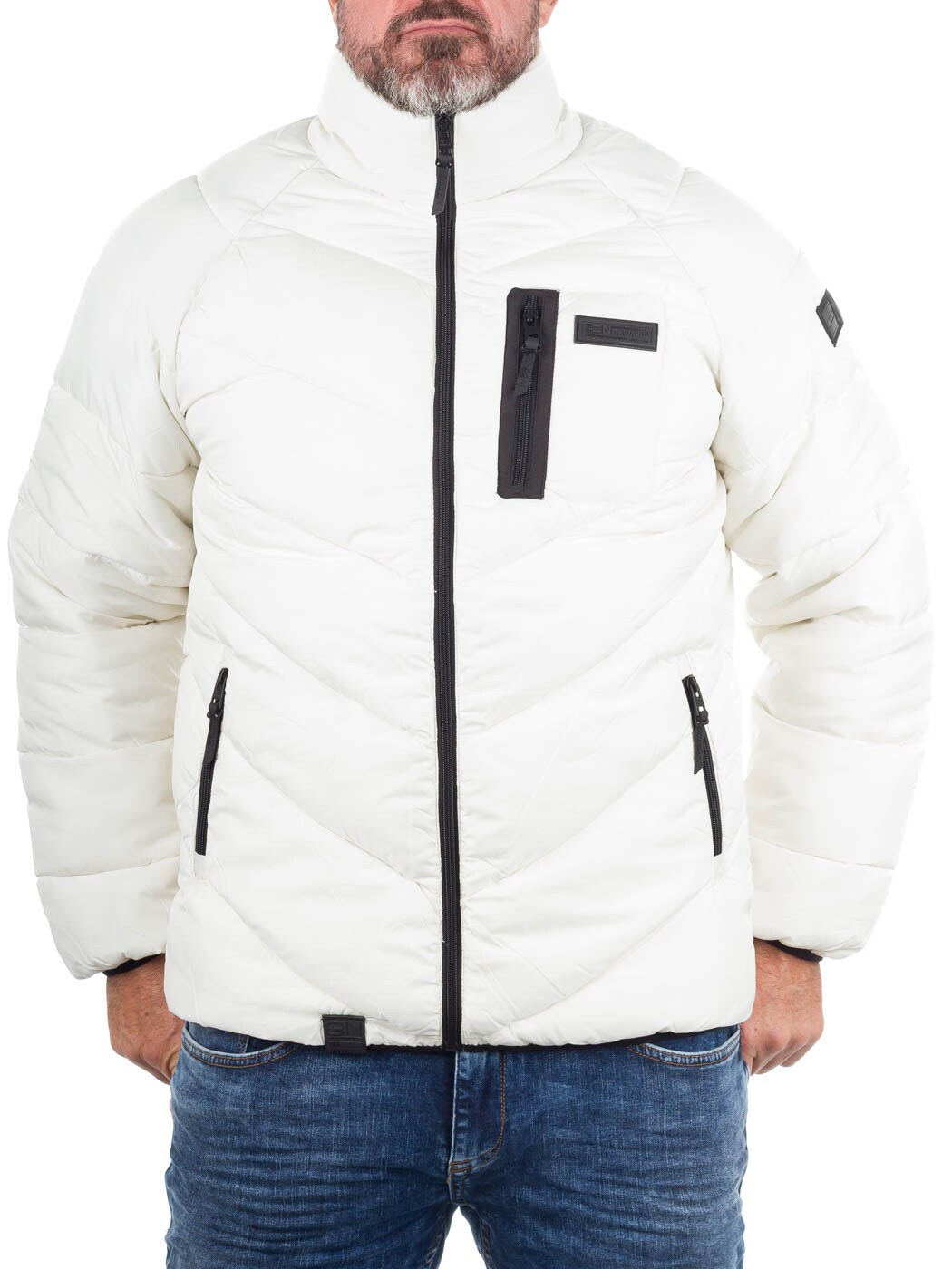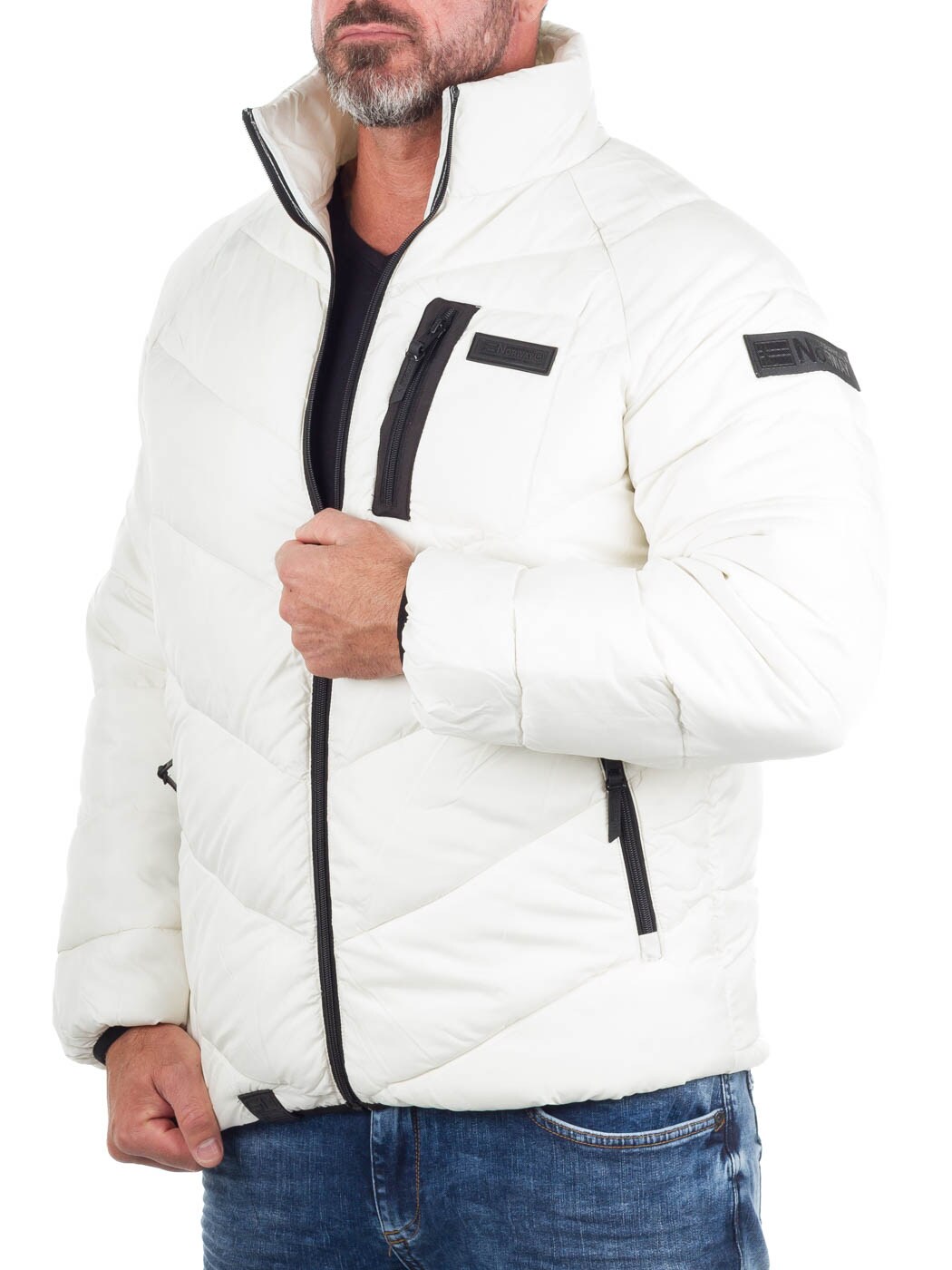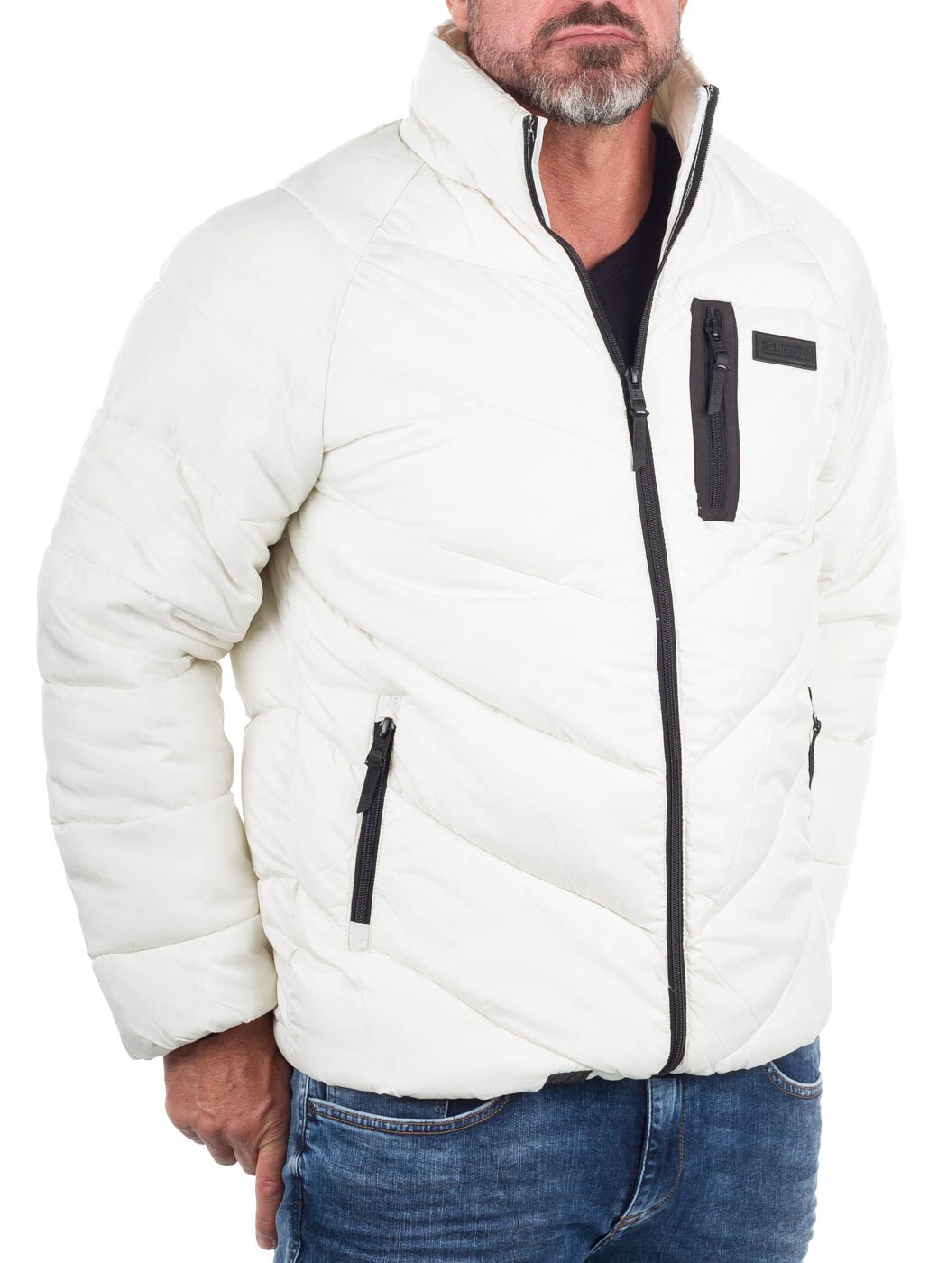 Vatteret jakke i hvid med sorte kontrastdetaljer. Den er let og behagelig at have på, samtidig med at den giver god varme på kolde dage. Designet har høj krave, lynlåslukning og flere praktiske lynlåslommer.