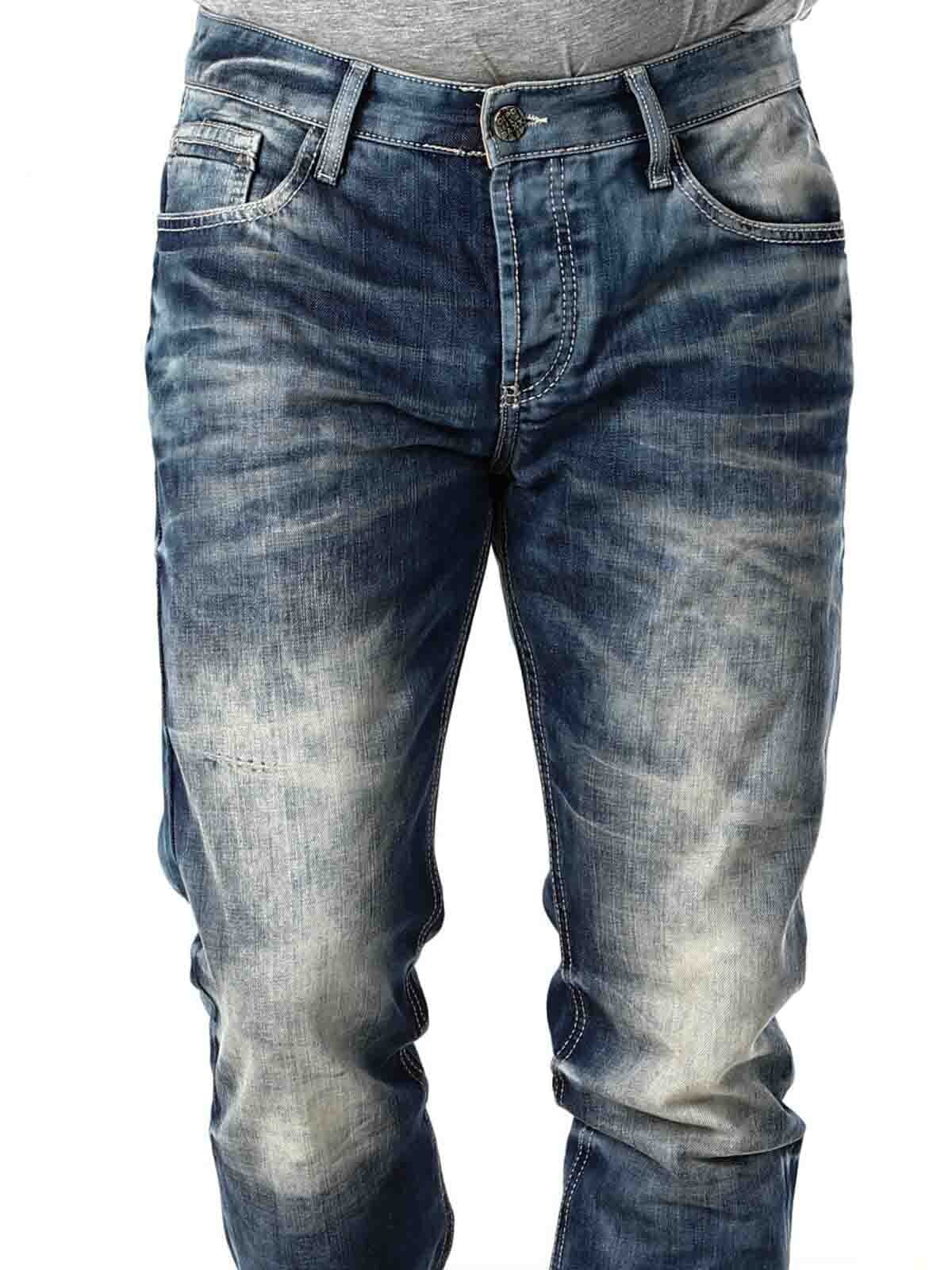 Blå jeans med et stenvasket design. De har stropper i taljen til livremmen. Hertil kommer fem lommet samt en ekstra lille lomme, hvor der er en knap på den ene baglomme. De er detaljerede med sømme i en kontrastfarve.