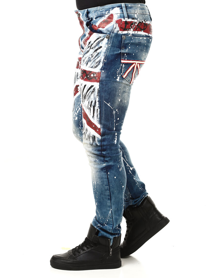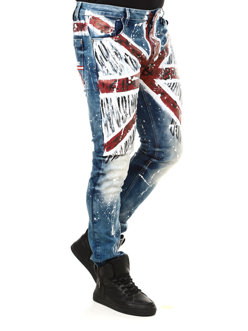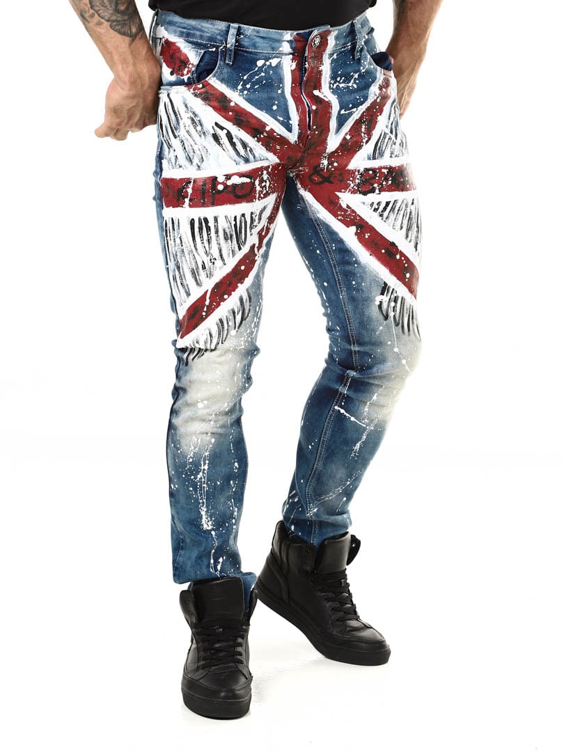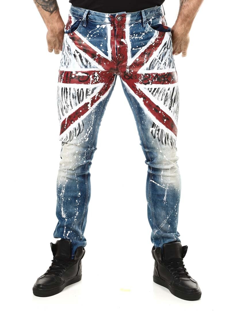 Rigtig cool og unikke jeans med påmalede effekter. De er detaljerede med et britiskt motiv fortil, farvestænk bagtil samt et logo. De har tre lommer foran, to lommer bagpå og remme til bæltet i taljen. Vil du være unik og skille dig ud er disse jeans de helt rigtige for dig!