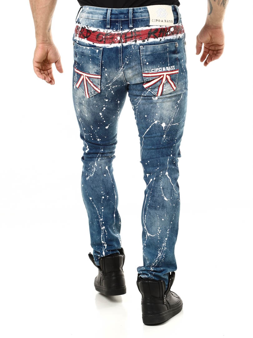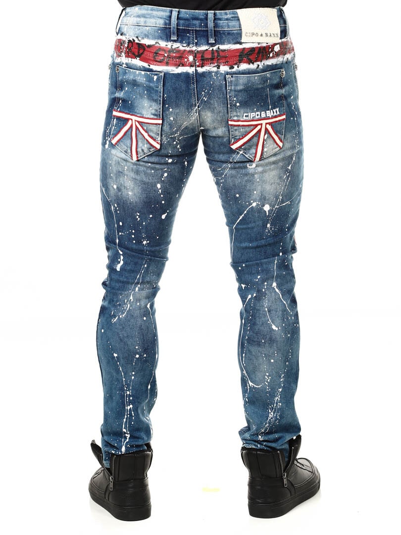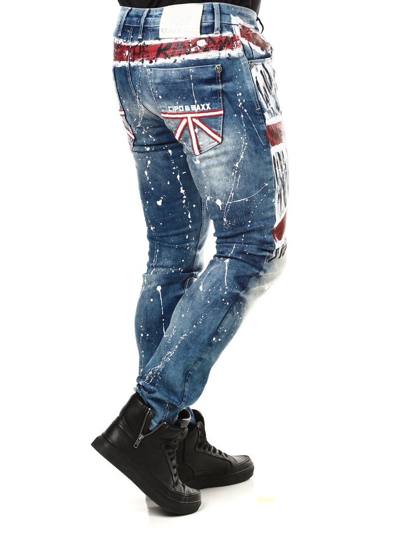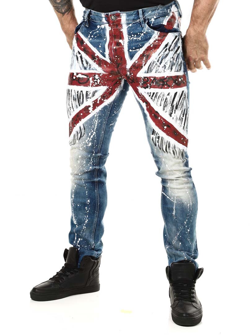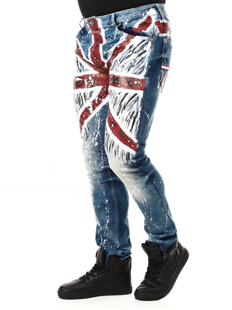 Rigtig cool og unikke jeans med påmalede effekter. De er detaljerede med et britiskt motiv fortil, farvestænk bagtil samt et logo. De har tre lommer foran, to lommer bagpå og remme til bæltet i taljen. Vil du være unik og skille dig ud er disse jeans de helt rigtige for dig!