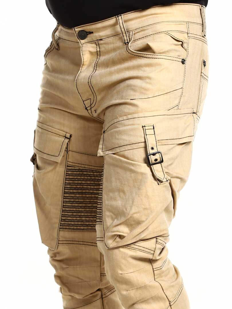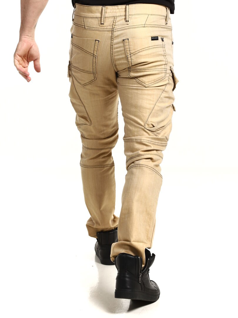Produceret i en fin bomuld med en normal pasform og ben der bliver noget smallere ned mod anklerne. Disse bukser har sorte sømme og cargolommer som er fremhævet.