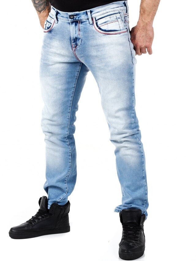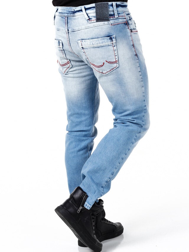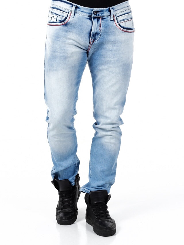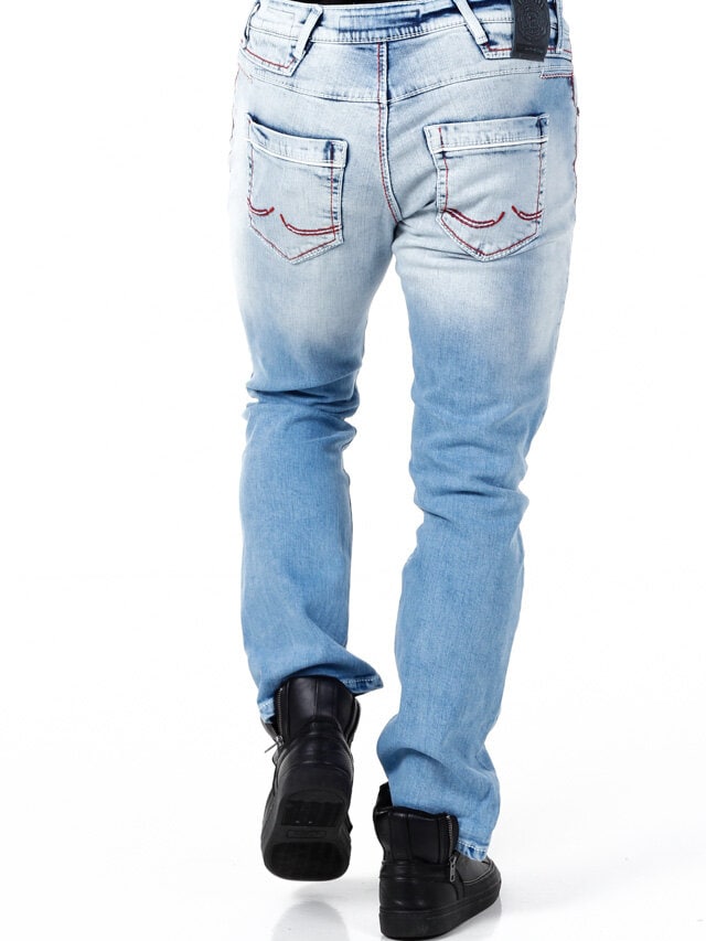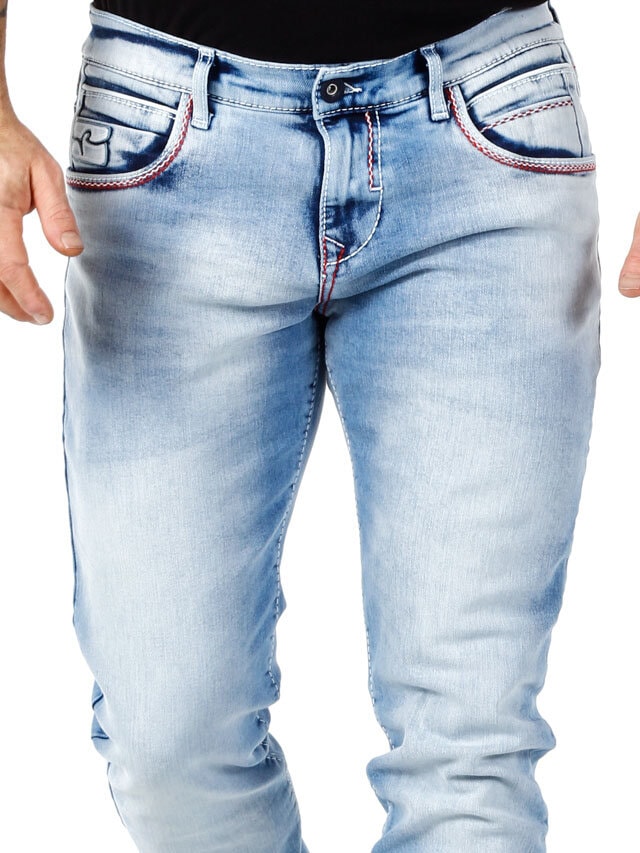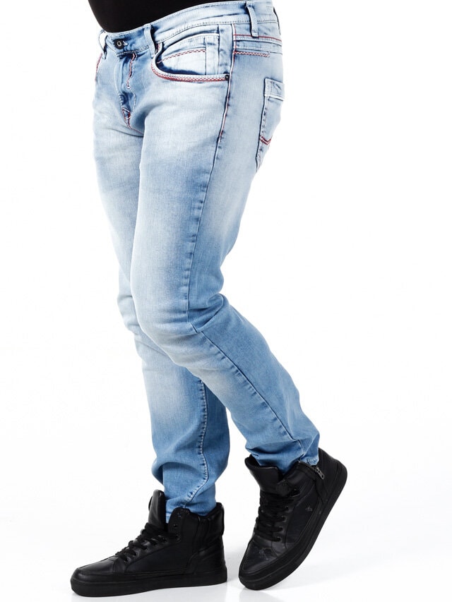 Dejlige bukser i denim med grove sømme i kontrastfarver. Dette er en elastisk model med en klassisk pasform. Der findes seks lommer fortil og to lommer bagpå.