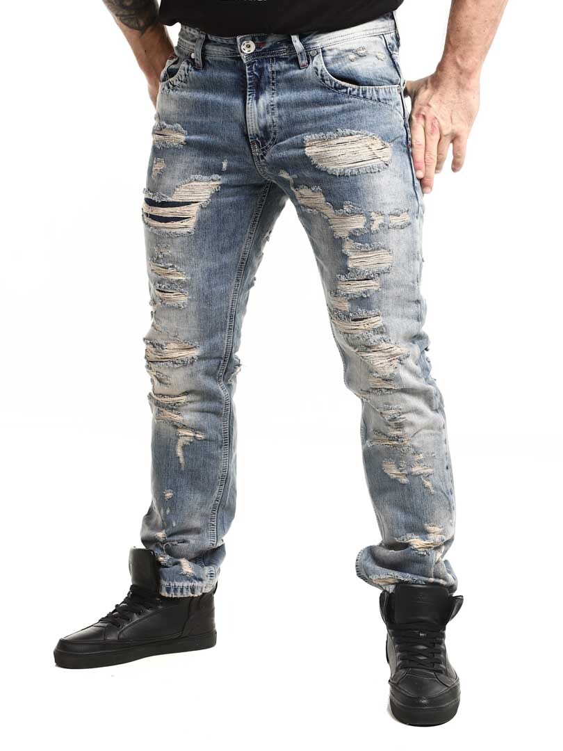 Cool jeans detaljerede med meget slitage både fortil og bagpå. De har fem lommer, stropper i taljen til bæltet samt sømme der kommer i en kontrastfarve. Disse jeans er fremstillet i 100 % bomuld.