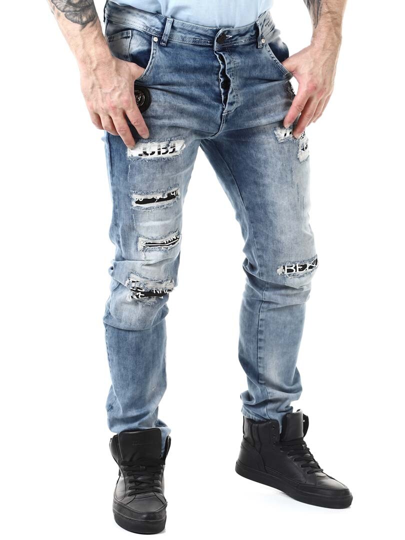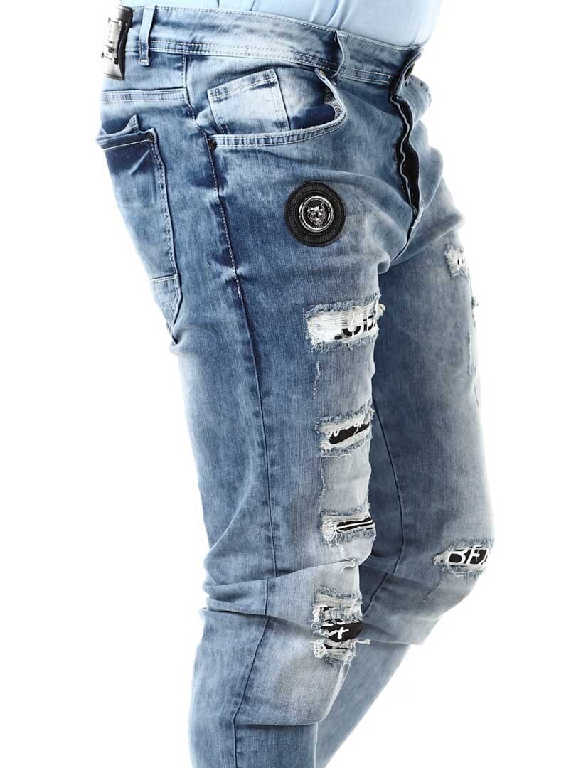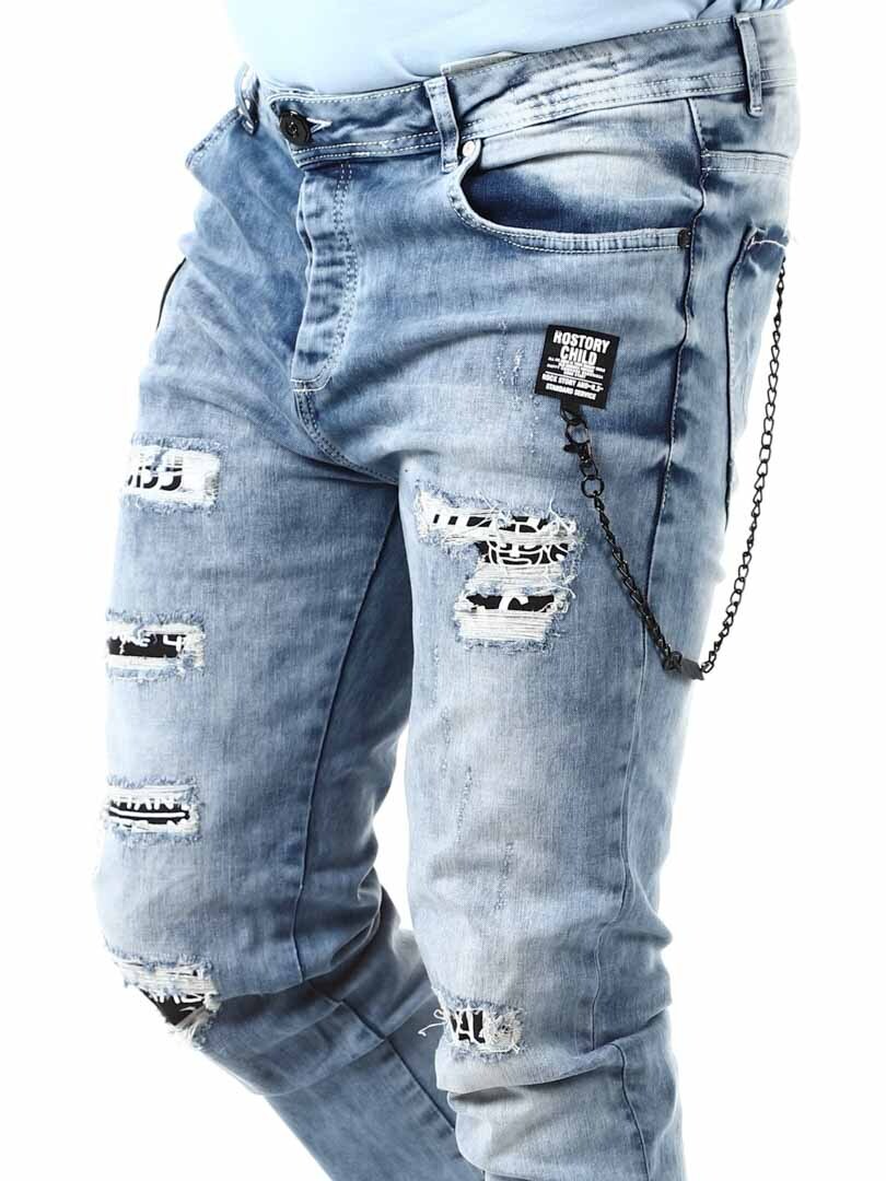 Bukser i en blød denim med aftagelig kæde og rummelige lommer. Hårdt design med slitager, revner, kontraststof og lapper af stof.