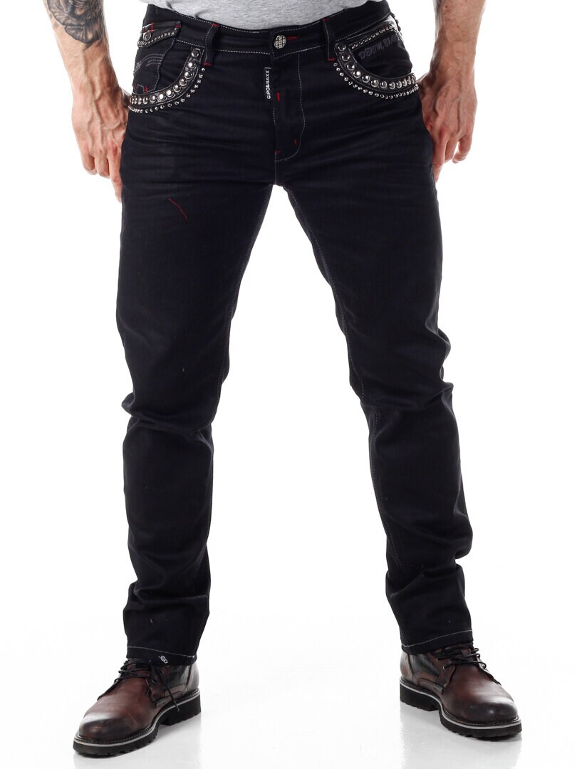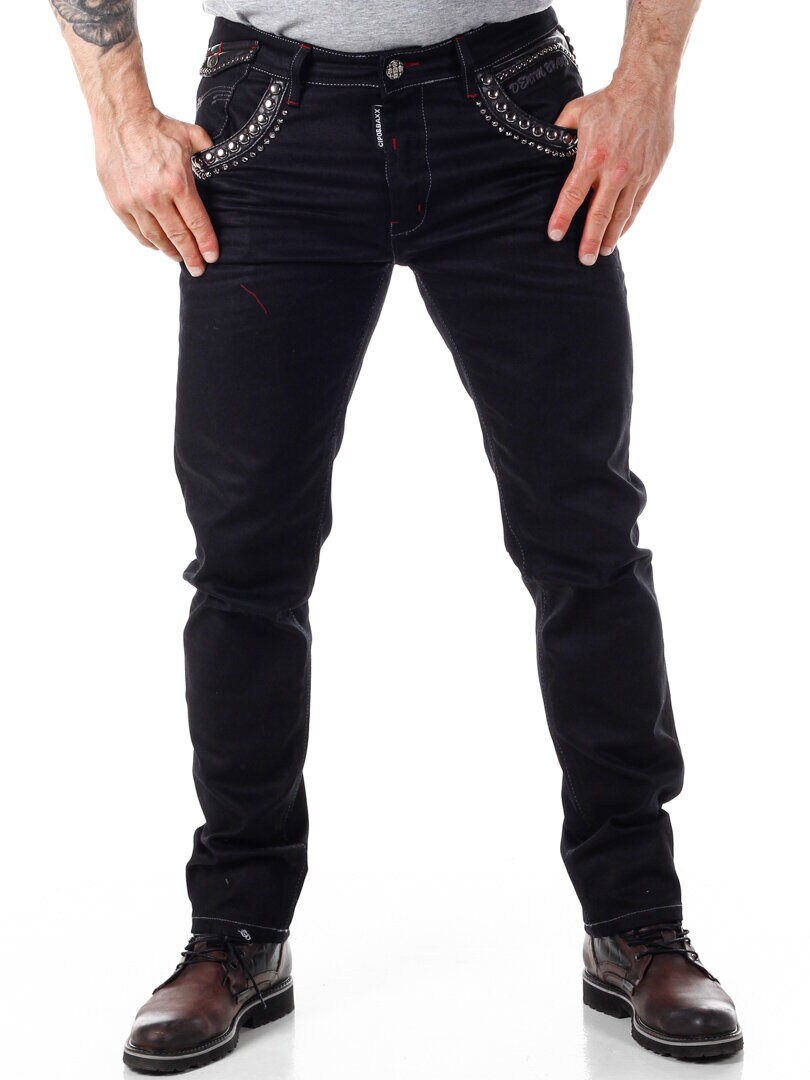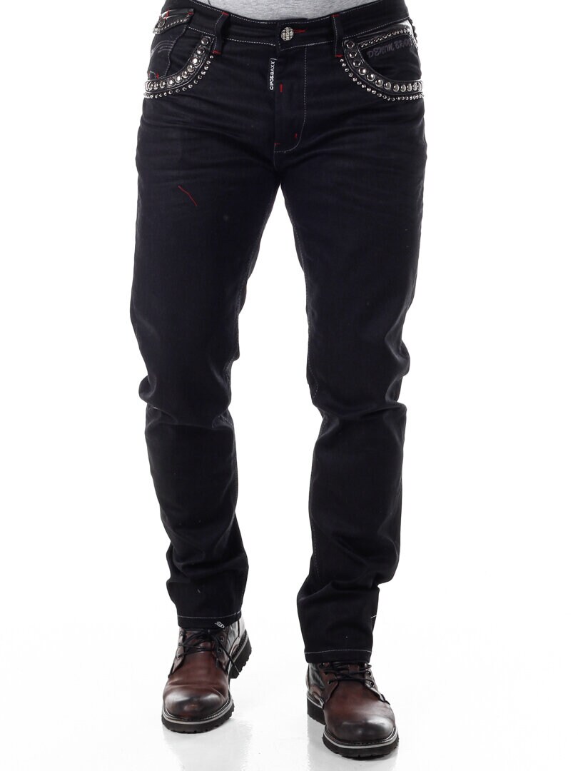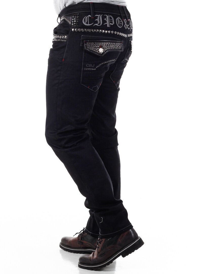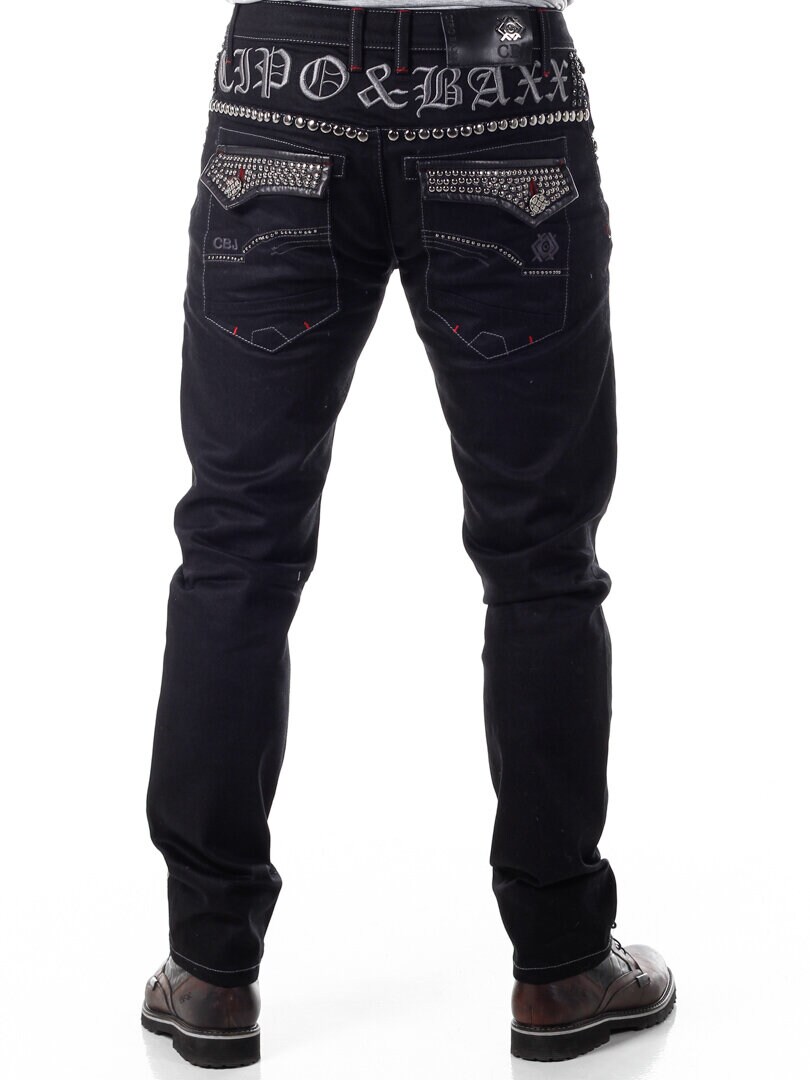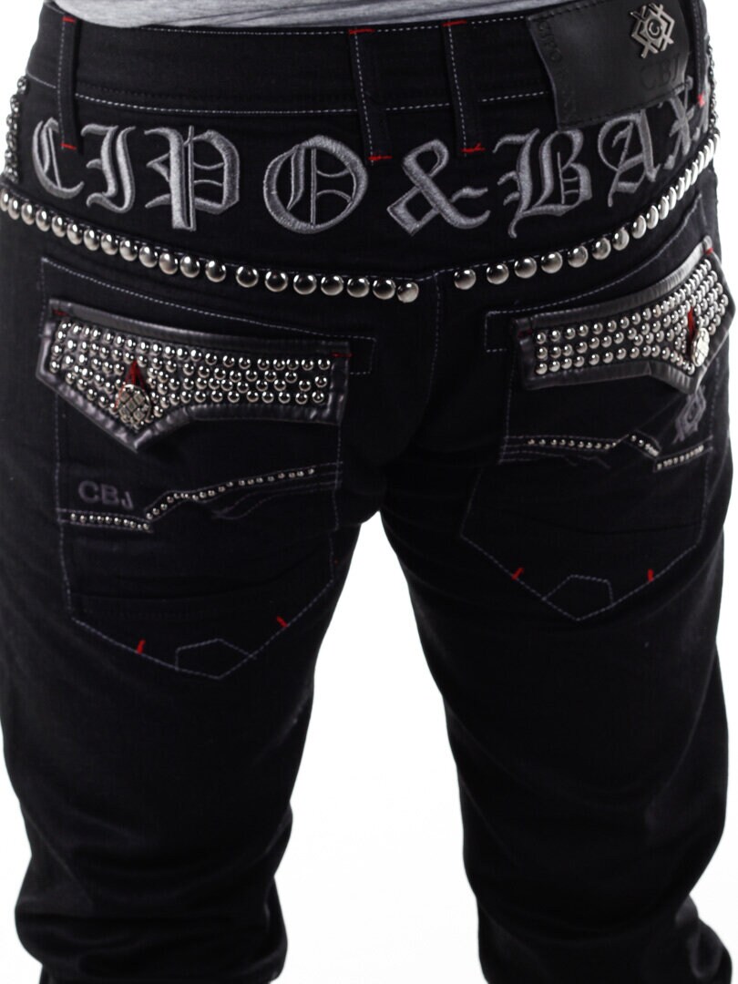 Bukser med en hård attitude i sort denim og skinnende nitter. 5-lommersmodel, hvor tre af dem kan lukkes. Bukserne er designede med lyse sømme og detaljer, der kommer, i en skindimitation. Hertil findes et skræddersyet logo bagtil. De er noget elastiske.