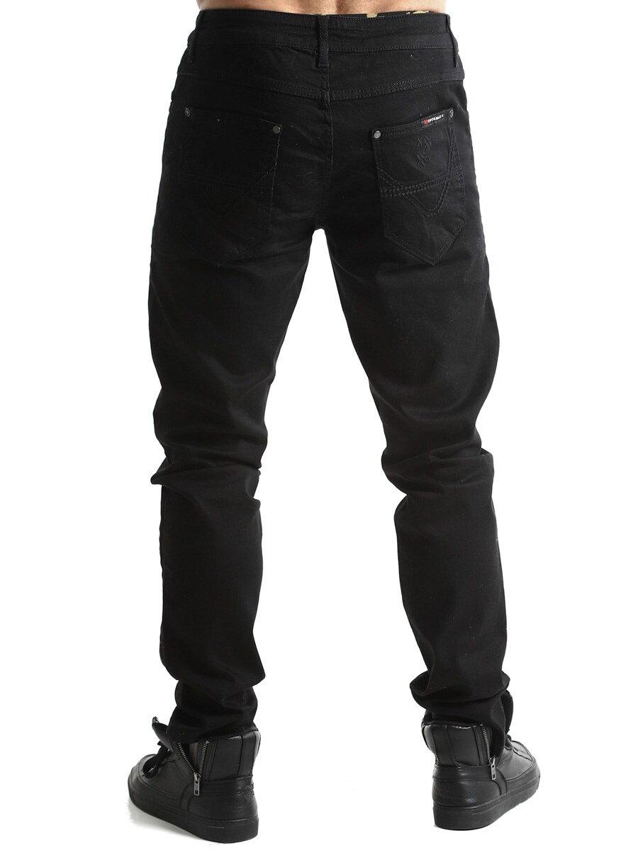 Bløde jeans med meget stretch i, som gør den behagelig at bevæge sig i. Der er to lommer fortil, og hertil kommer to baglommer med mønster på.