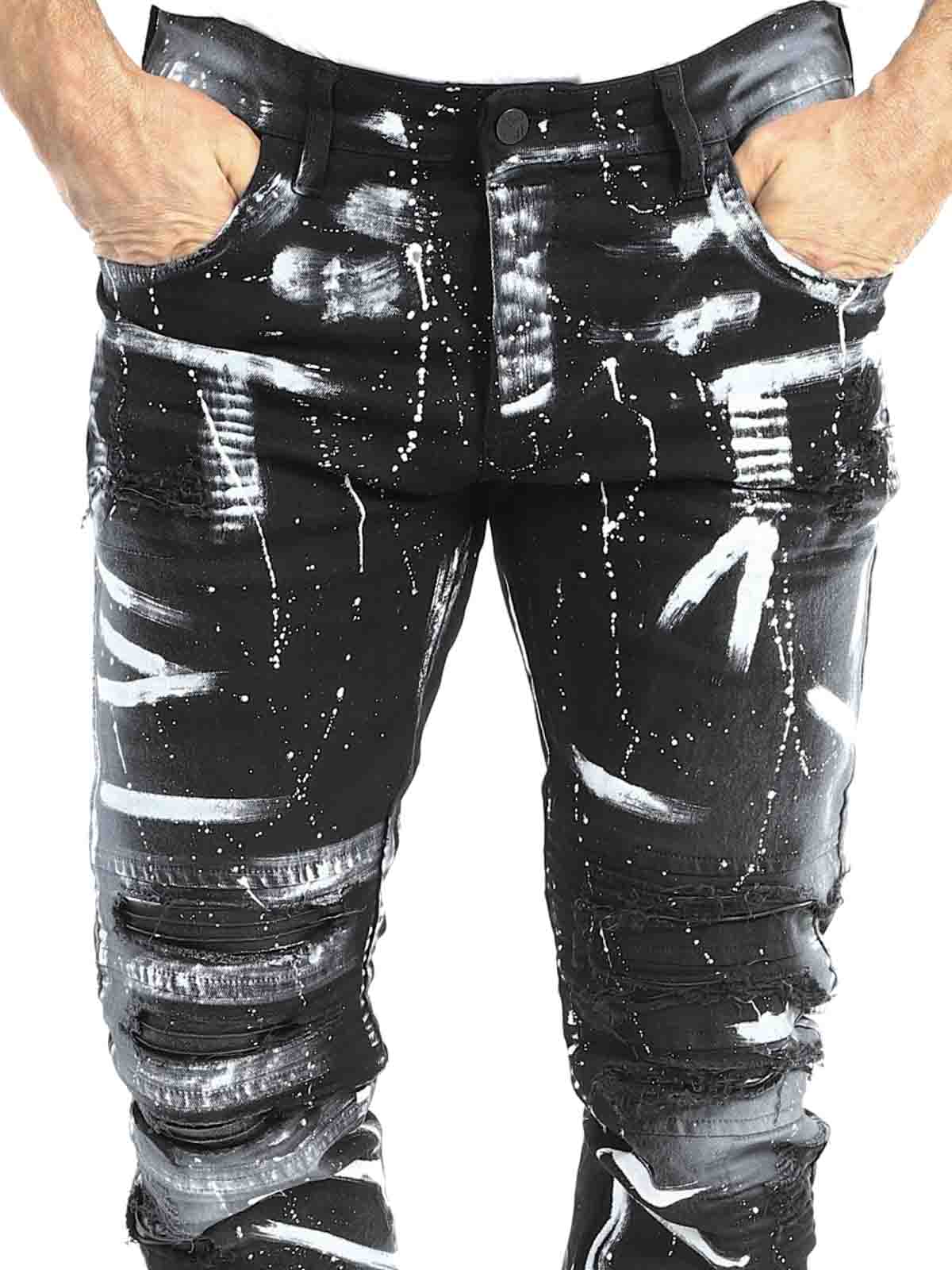Jeans i en behagelig og stretchy denim. De er cool designet med rifter i et imiteret læder og malede effekter. Fem-lommers model med stropper til bæltet og en lap i linningen bagpå. Jeans skabt til at give dit outfit en fræk og unik kant!