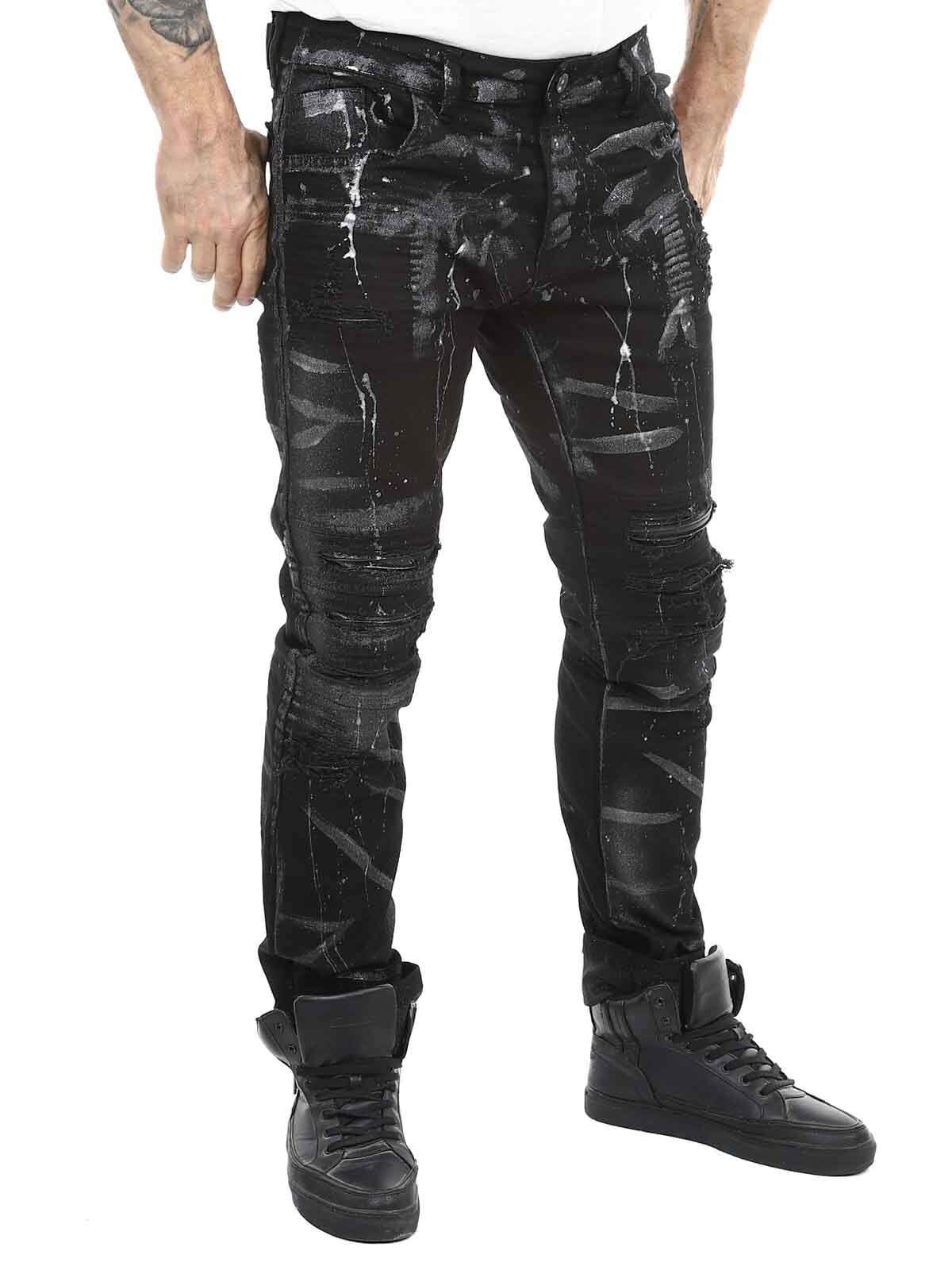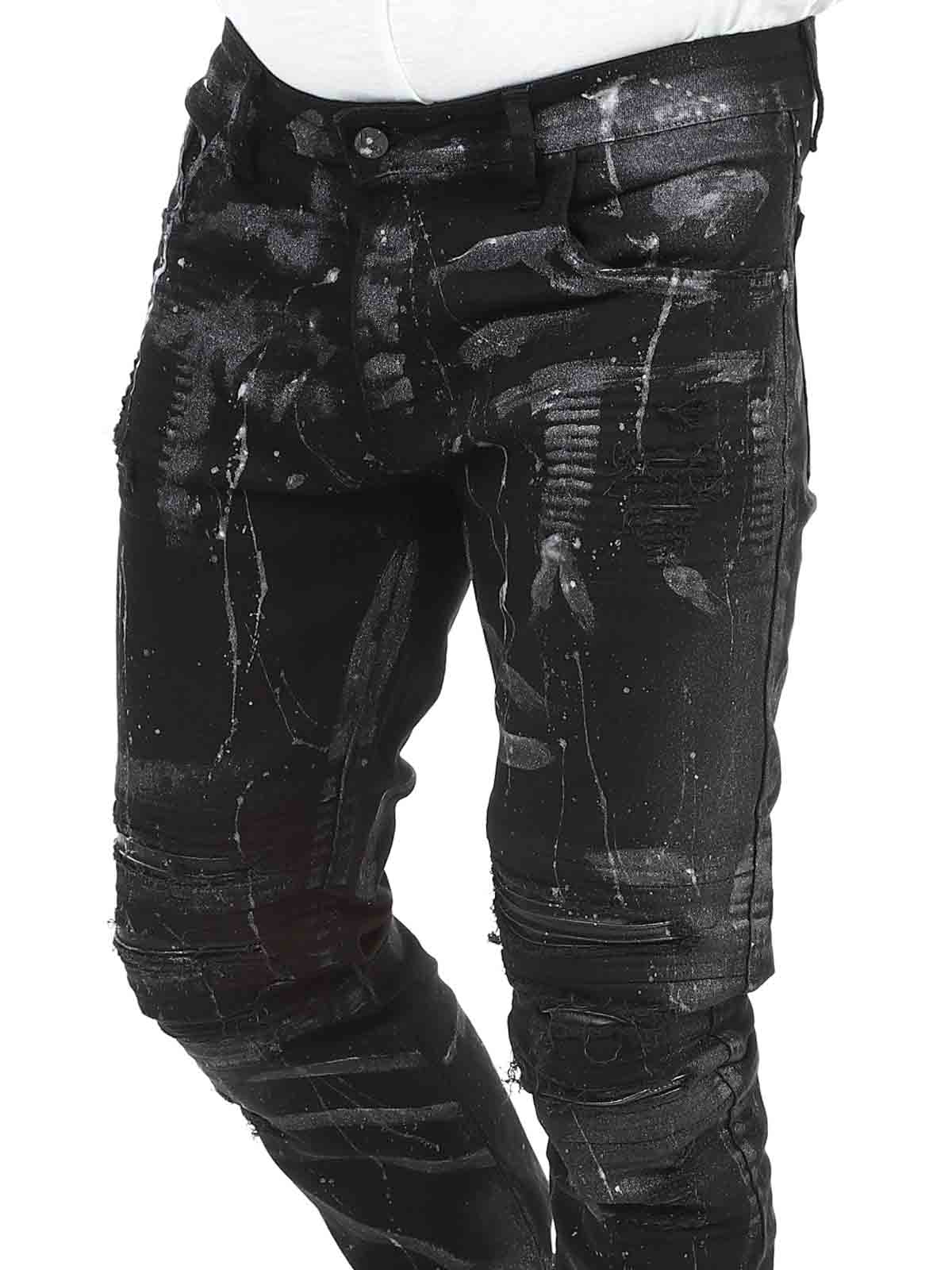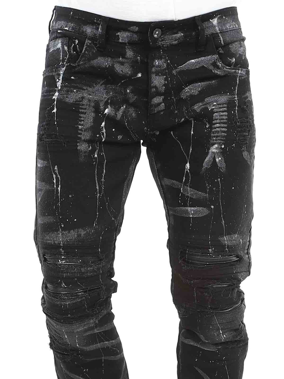 Jeans i en behagelig og stretchy denim. De er cool designet med rifter i et imiteret læder og malede effekter. Fem-lommers model med stropper til bæltet og en lap i linningen bagpå. Jeans skabt til at give dit outfit en fræk og unik kant!