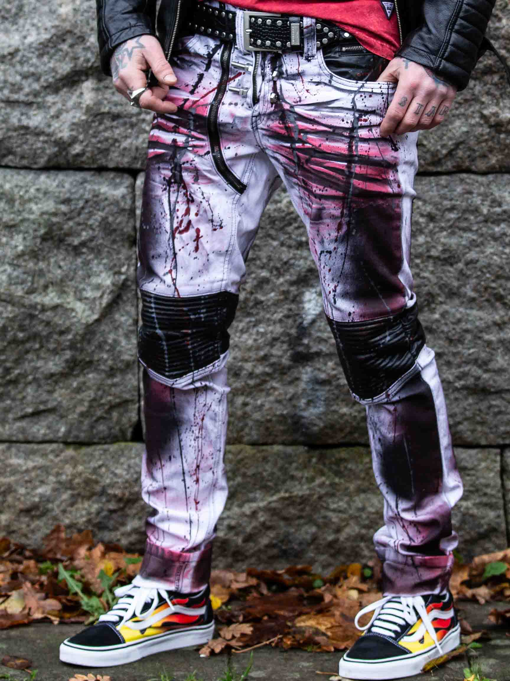 Unikke bukser i en farvet denim med knæ og lommer i en sort skindimitation. Smal pasform med sølvskinnende bolte som markerer gylpen og baglommer som lukkes ved hjælp af lynlåse i et sølvskinnende materiale. Disse jeans lukkes med en separat lynlås, der findes til højre om knappen i taljen.