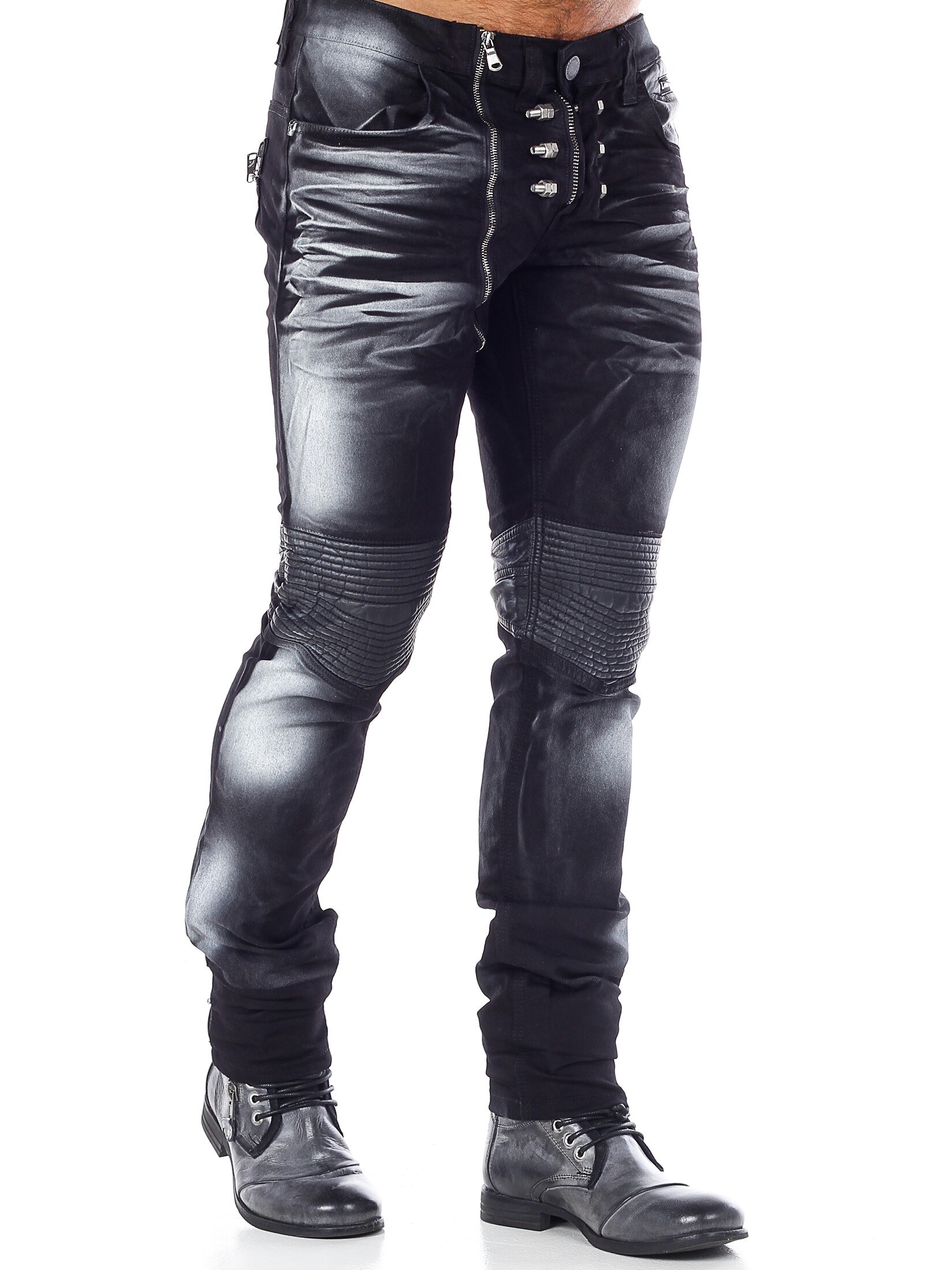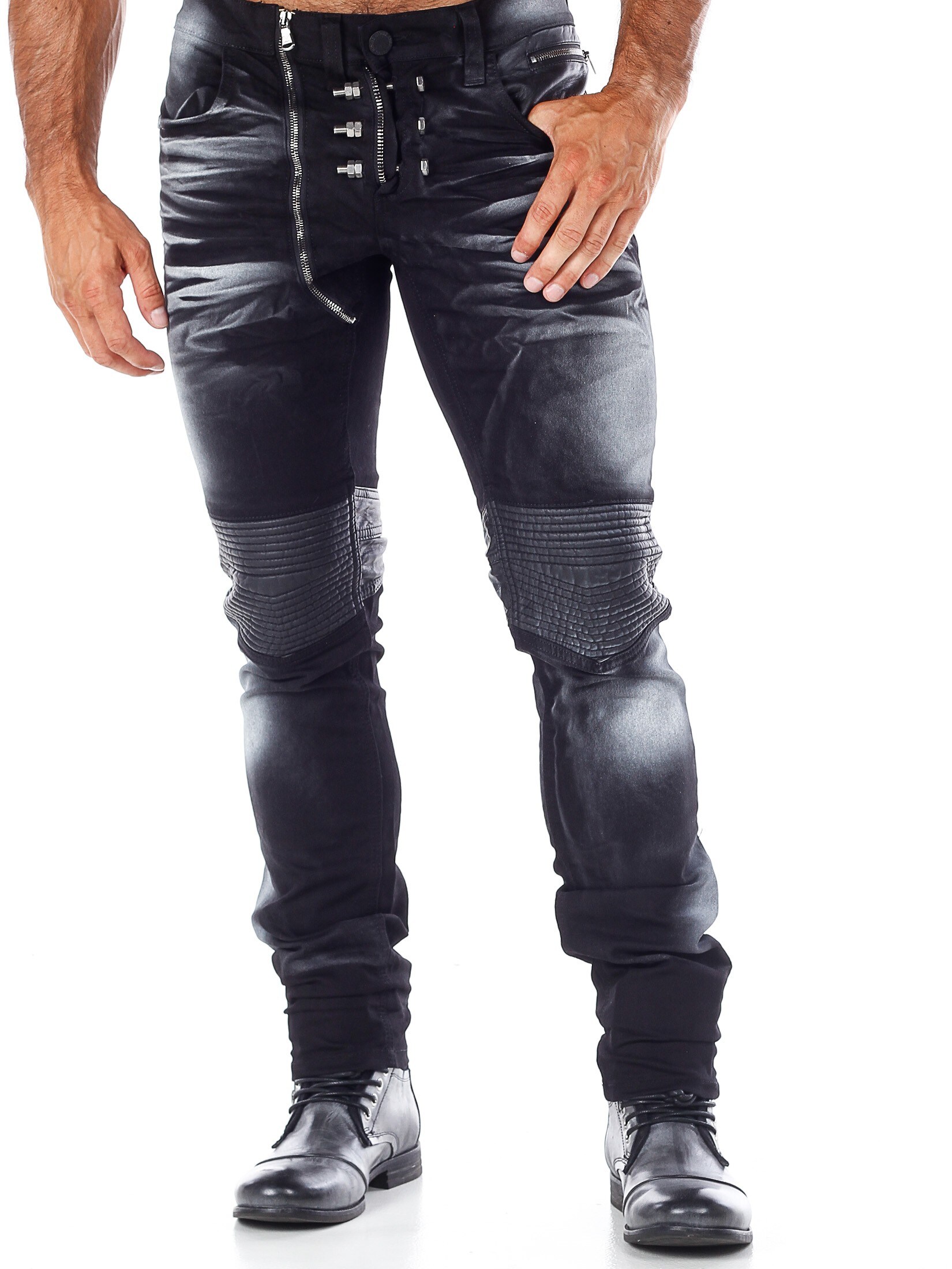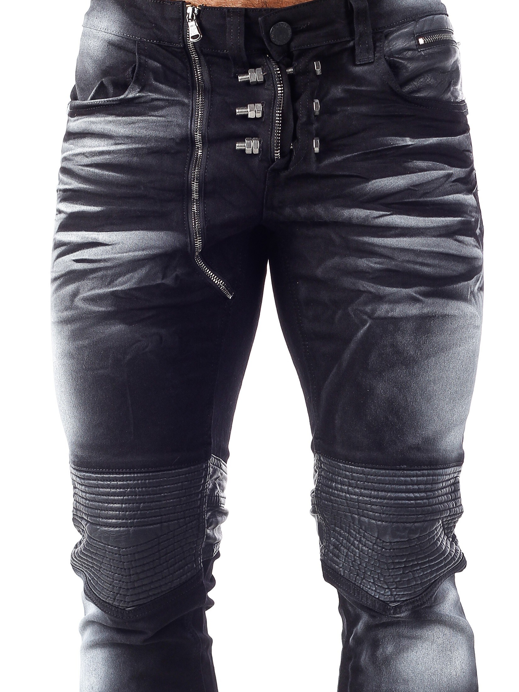 Sorte jeans med et unikt design fra Kingz. Bukserne har en sort basisfarve med farvede detaljer i hvidt. Gylpen har tre store metaldele, som kan tages af. Bukserne åbnes ved hjælp af en lynlås, som sidder på højre side af gylpen. Detaljer i kunstigt skind over knæene og på baglommerne giver bukserne et maskulint udseende. Disse jeans er Limited Edition, hvilket betyder, at vi kun får et begrænset antal ind af dem.