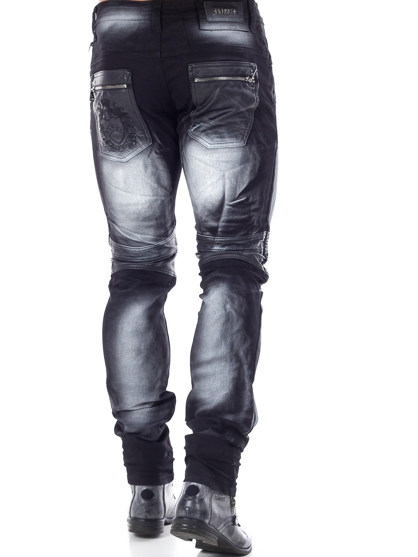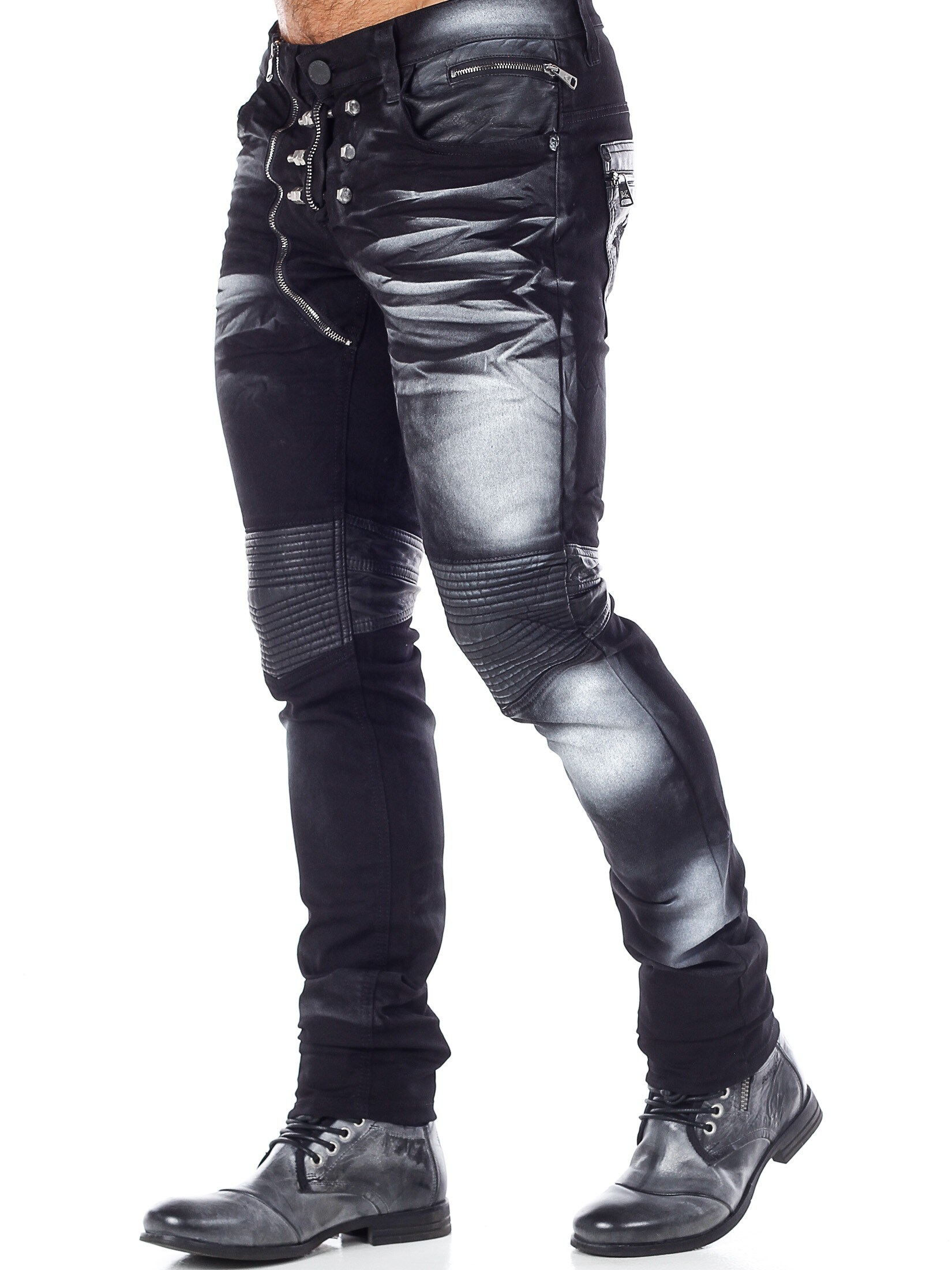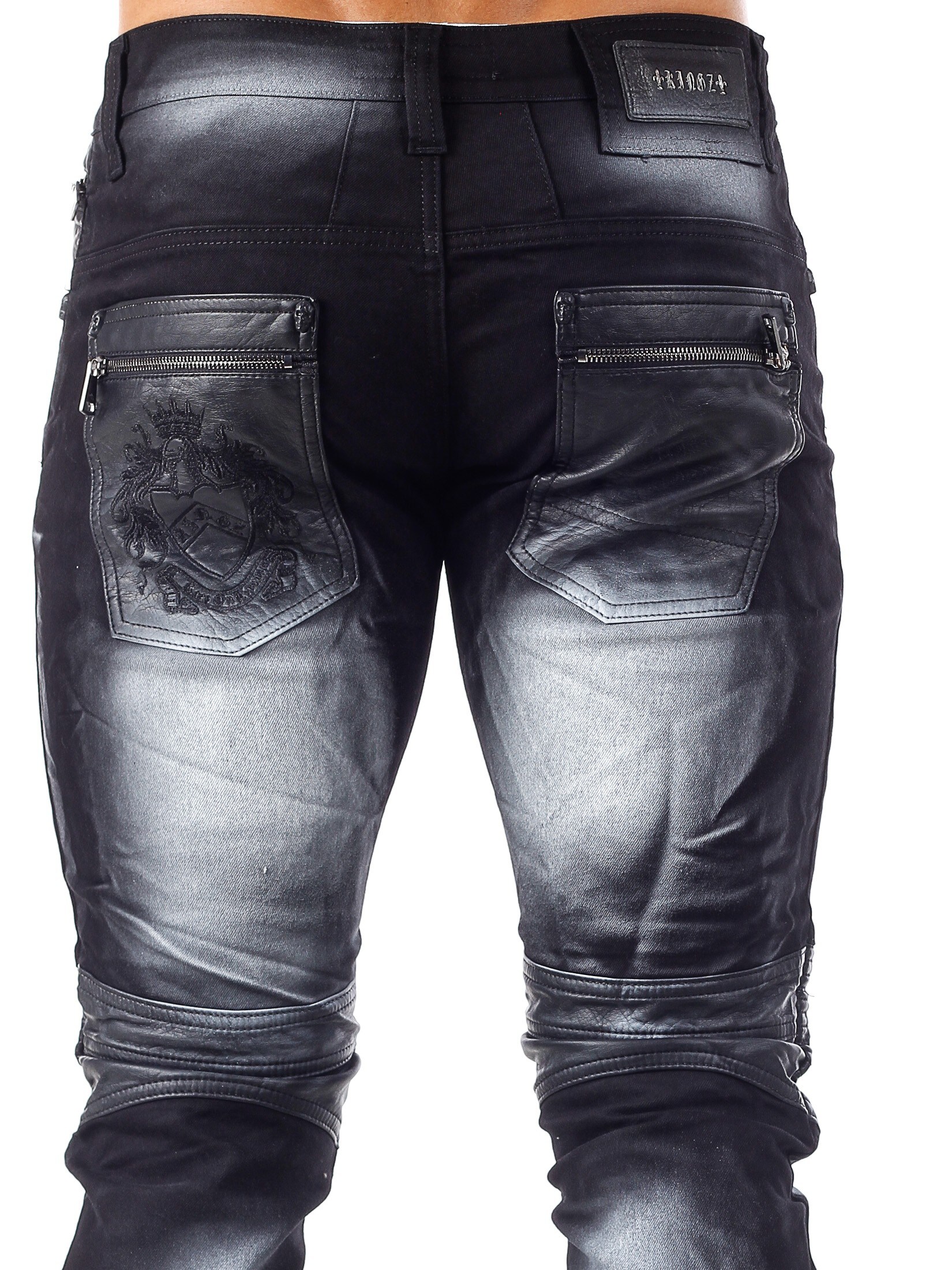 Sorte jeans med et unikt design fra Kingz. Bukserne har en sort basisfarve med farvede detaljer i hvidt. Gylpen har tre store metaldele, som kan tages af. Bukserne åbnes ved hjælp af en lynlås, som sidder på højre side af gylpen. Detaljer i kunstigt skind over knæene og på baglommerne giver bukserne et maskulint udseende. Disse jeans er Limited Edition, hvilket betyder, at vi kun får et begrænset antal ind af dem.
