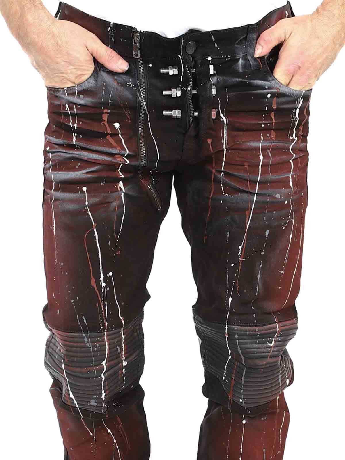 Unikke bukser i en farvet denim med knæ og lommer i en sort skindimitation. Smal pasform med sølvskinnende bolte som markerer gylpen og baglommer som lukkes ved hjælp af lynlåse i et sølvskinnende materiale. Disse jeans lukkes med en separat lynlås, der findes til højre om knappen i taljen.