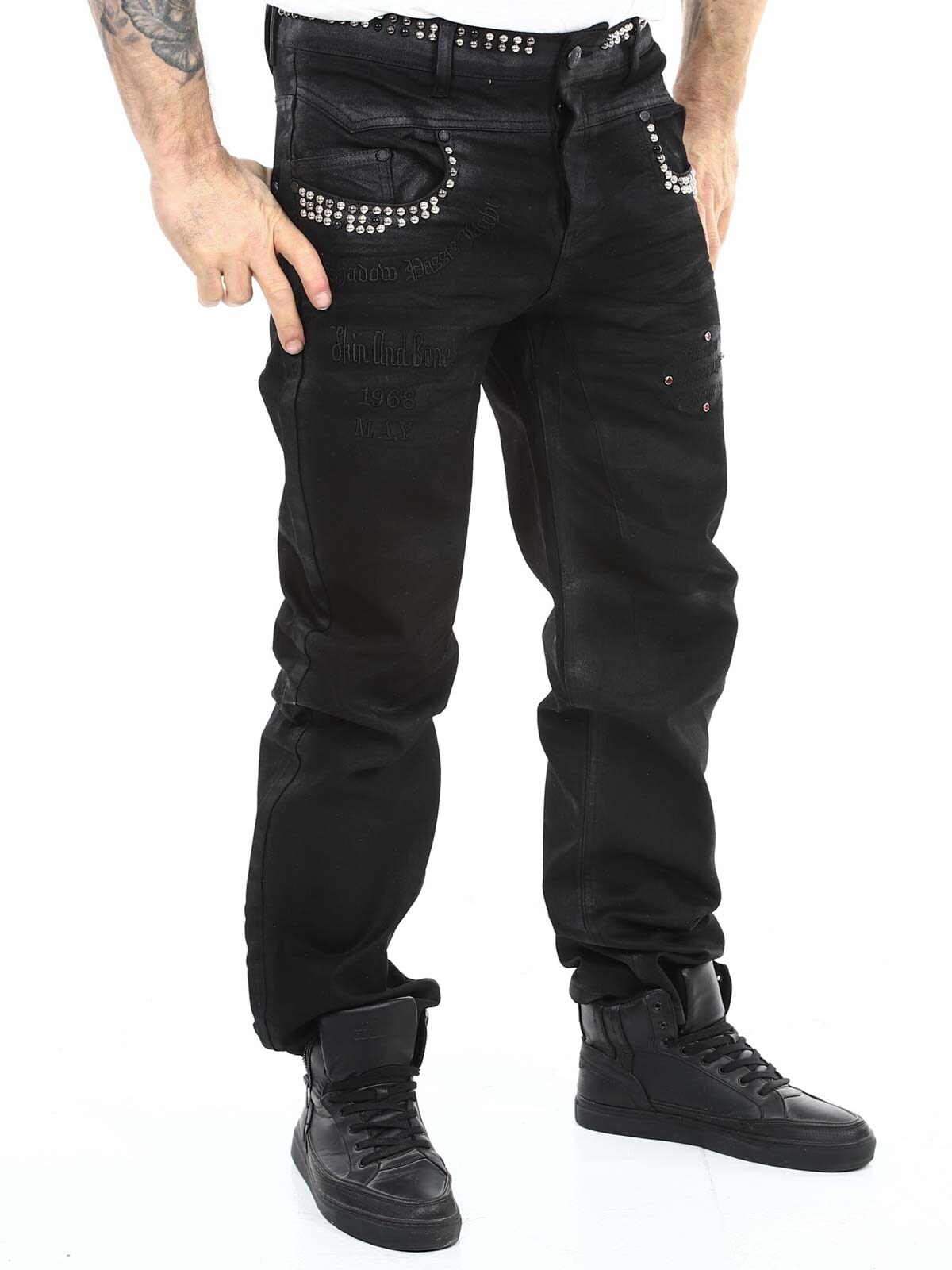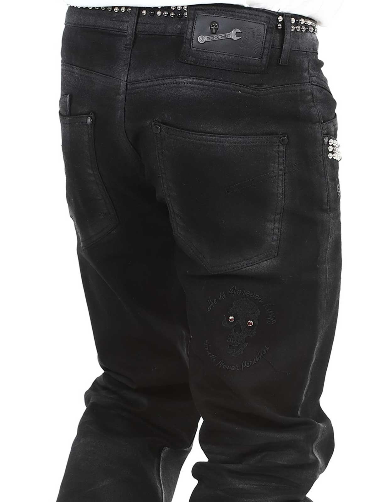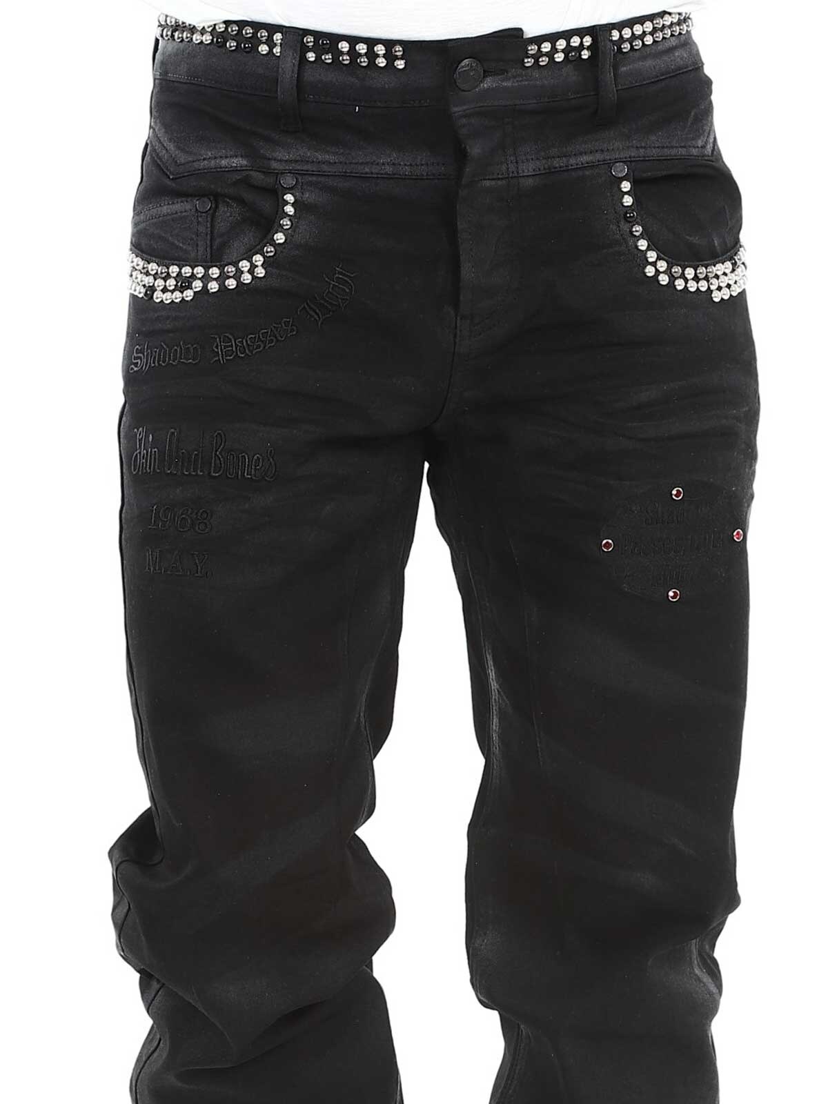 Jeans i elastiskt materiale med et iøjnefaldende design. De har stropper til bæltet, tre lommer fortil og tre lommer bagpå. Hårdt detaljeret med nitter og et fastsyet tryk. Hvis du vil være unik og skille dig ud, er disse jeans lige noget for dig!
