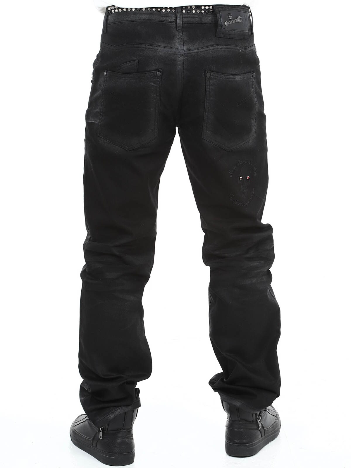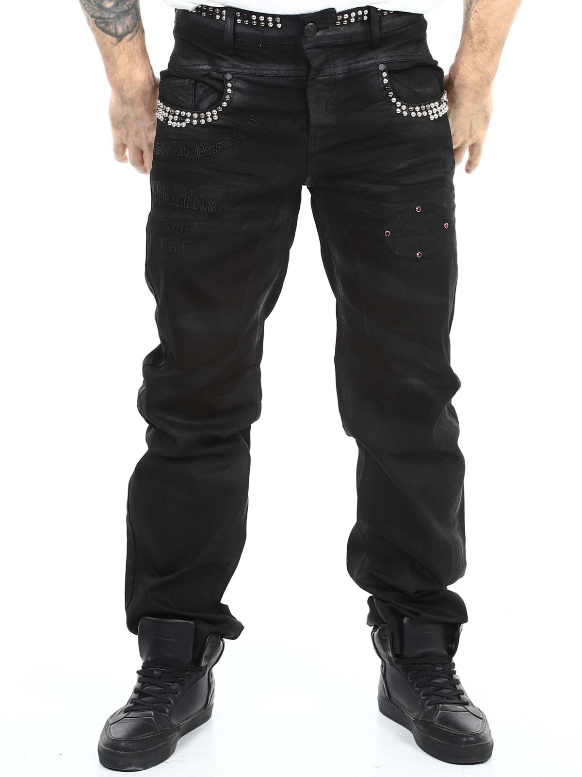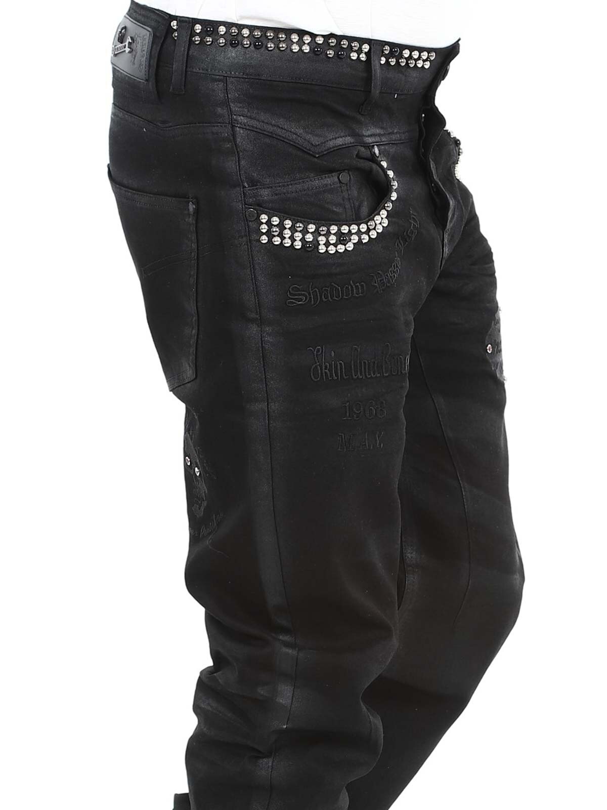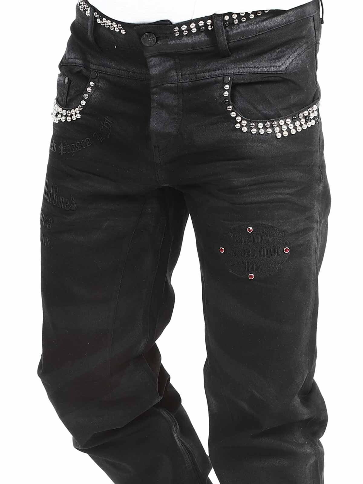 Jeans i elastiskt materiale med et iøjnefaldende design. De har stropper til bæltet, tre lommer fortil og tre lommer bagpå. Hårdt detaljeret med nitter og et fastsyet tryk. Hvis du vil være unik og skille dig ud, er disse jeans lige noget for dig!