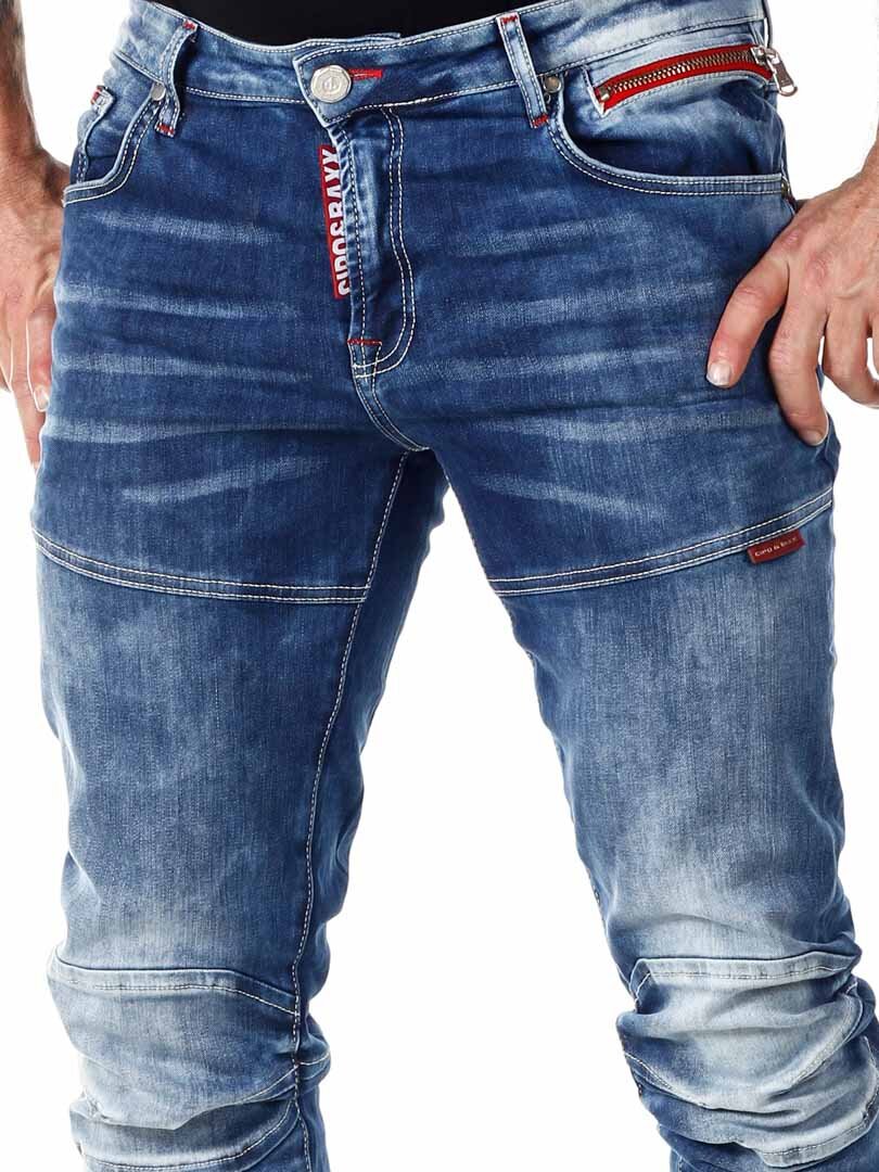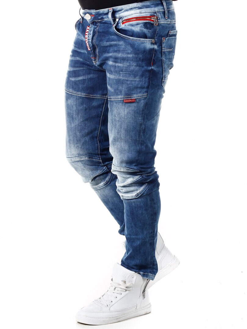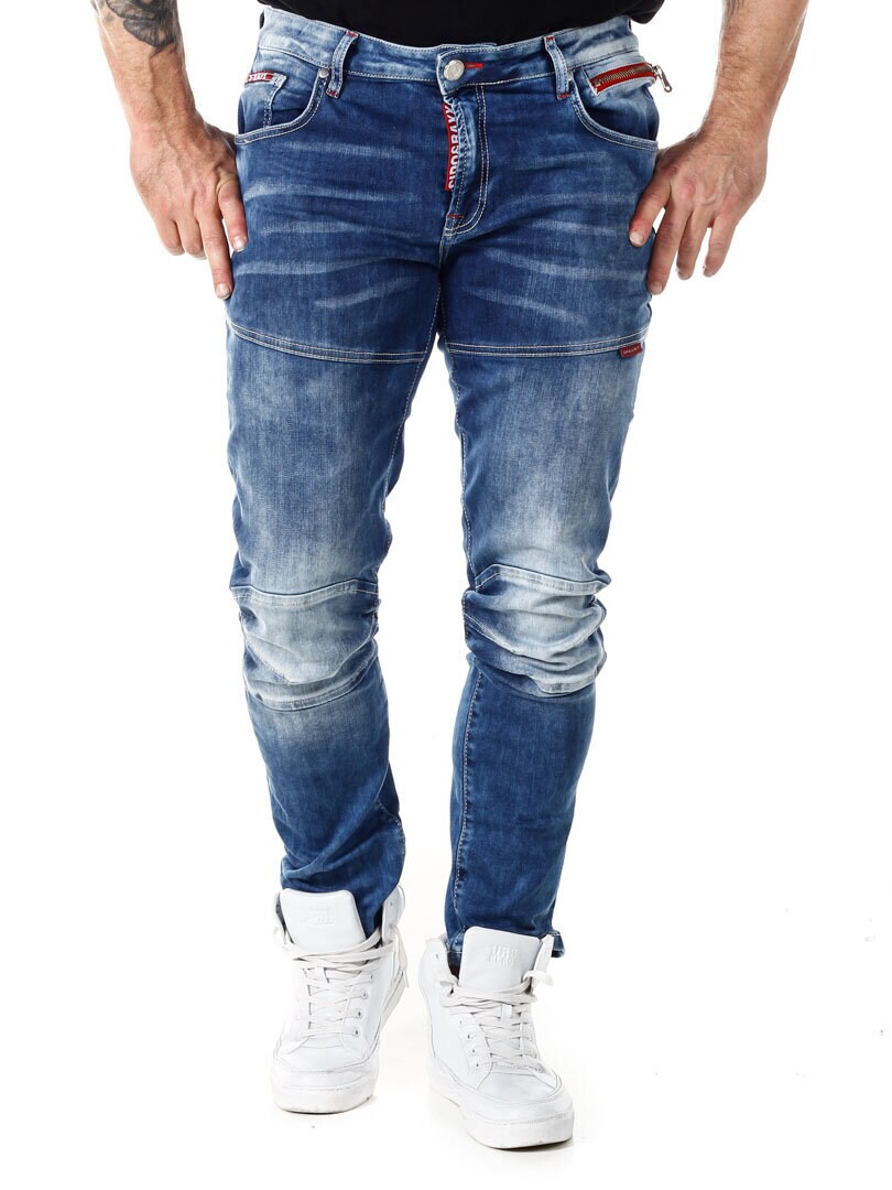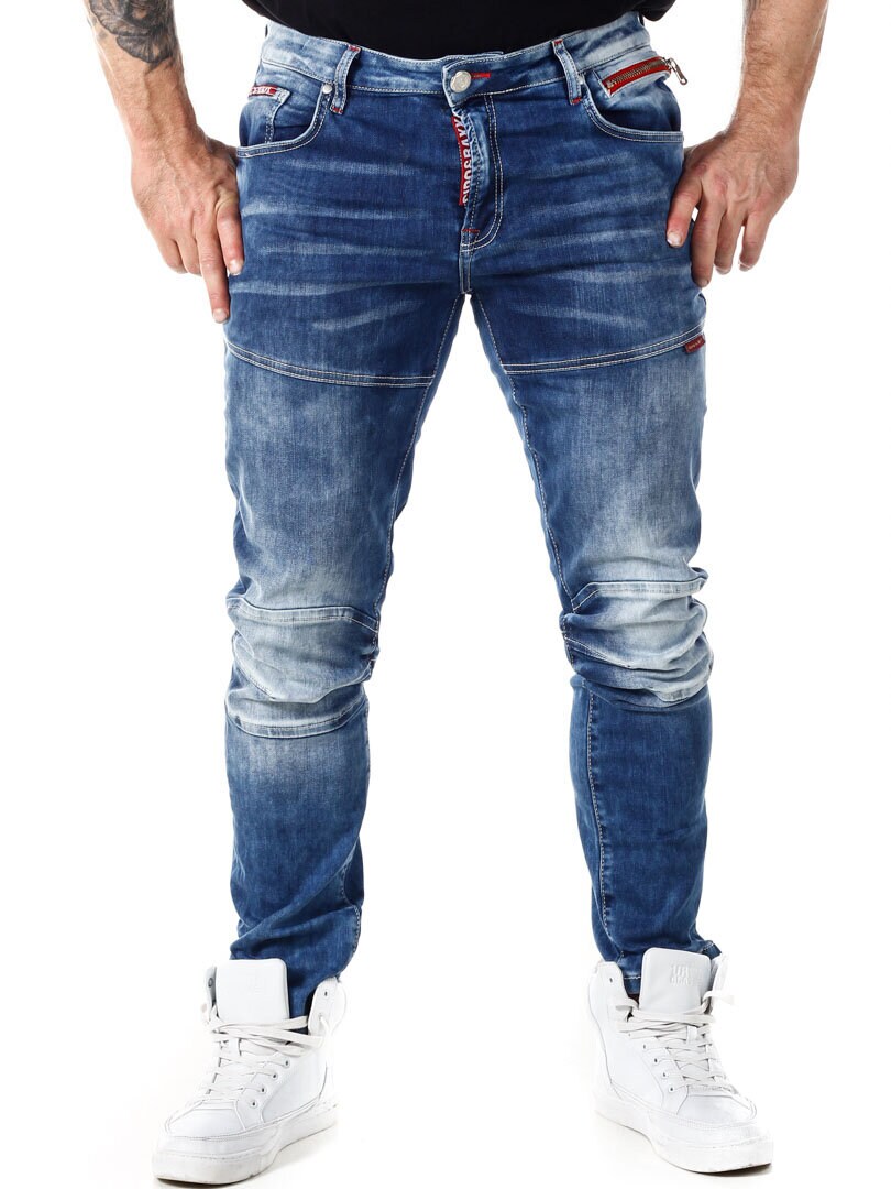 Bukser i en elastisk denim med ekstra sømme fortil ved lårene og på knæene. Der findes fire lommer bagtil samt fire lommer foran på bukserne, hvoraf den ene lomme har en lynlås. Røde detaljer er med til at give et flot look!