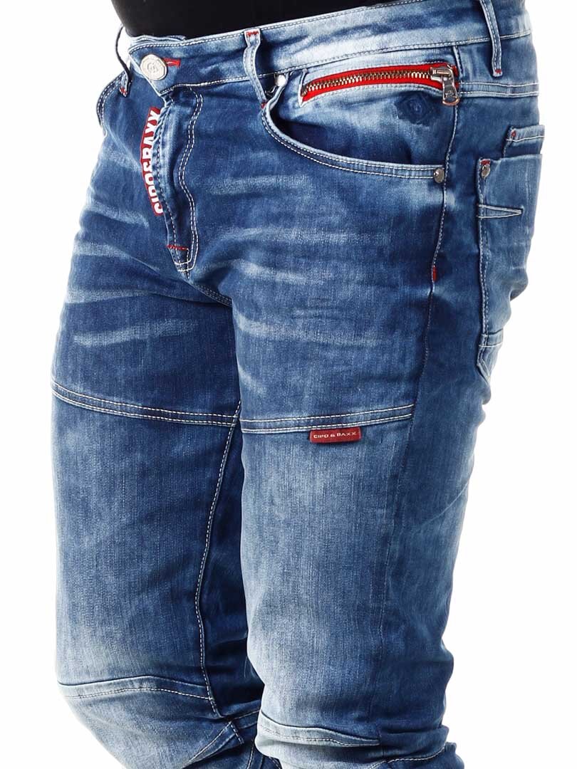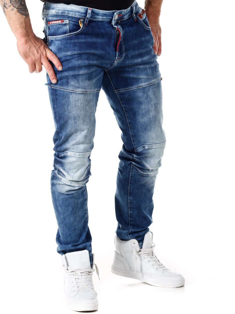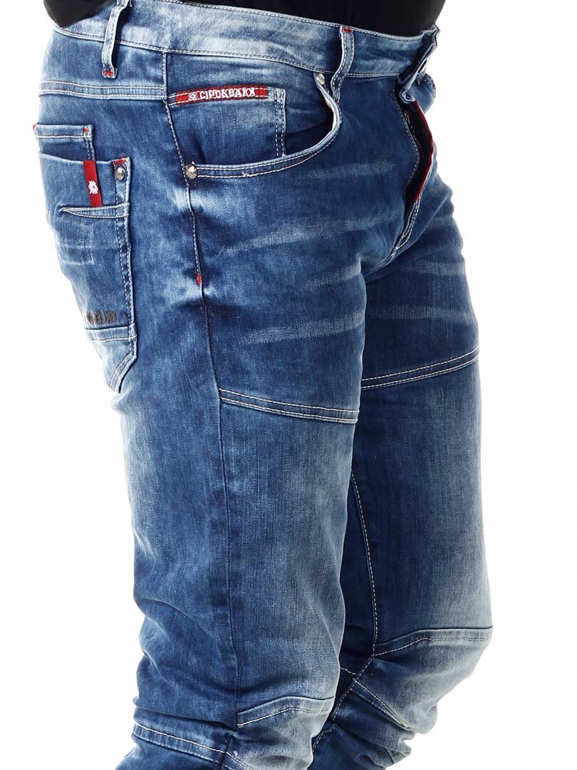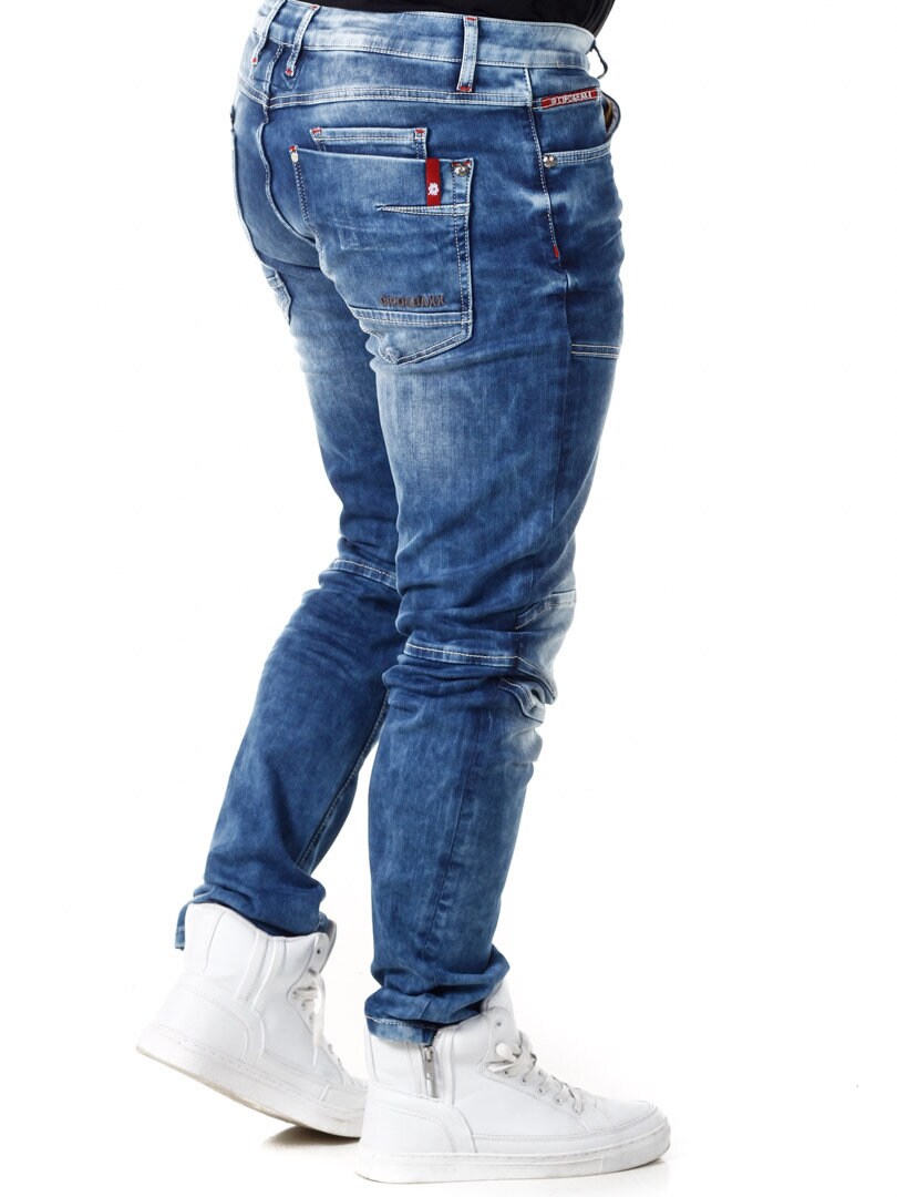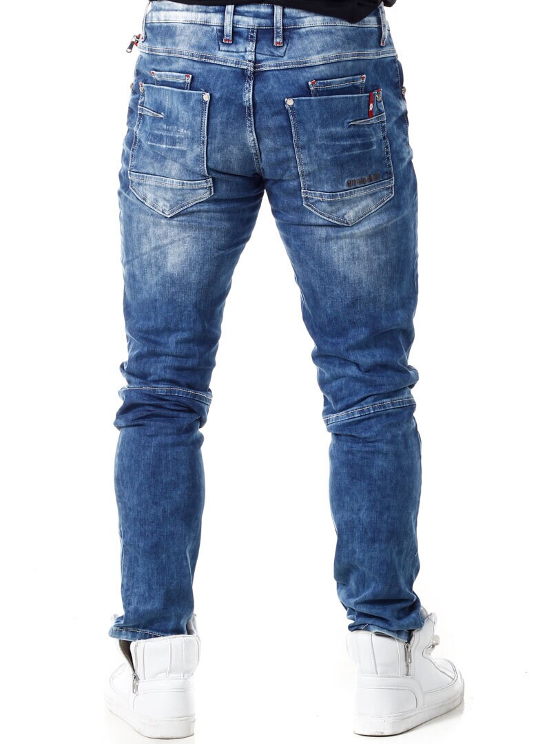 Bukser i en elastisk denim med ekstra sømme fortil ved lårene og på knæene. Der findes fire lommer bagtil samt fire lommer foran på bukserne, hvoraf den ene lomme har en lynlås. Røde detaljer er med til at give et flot look!