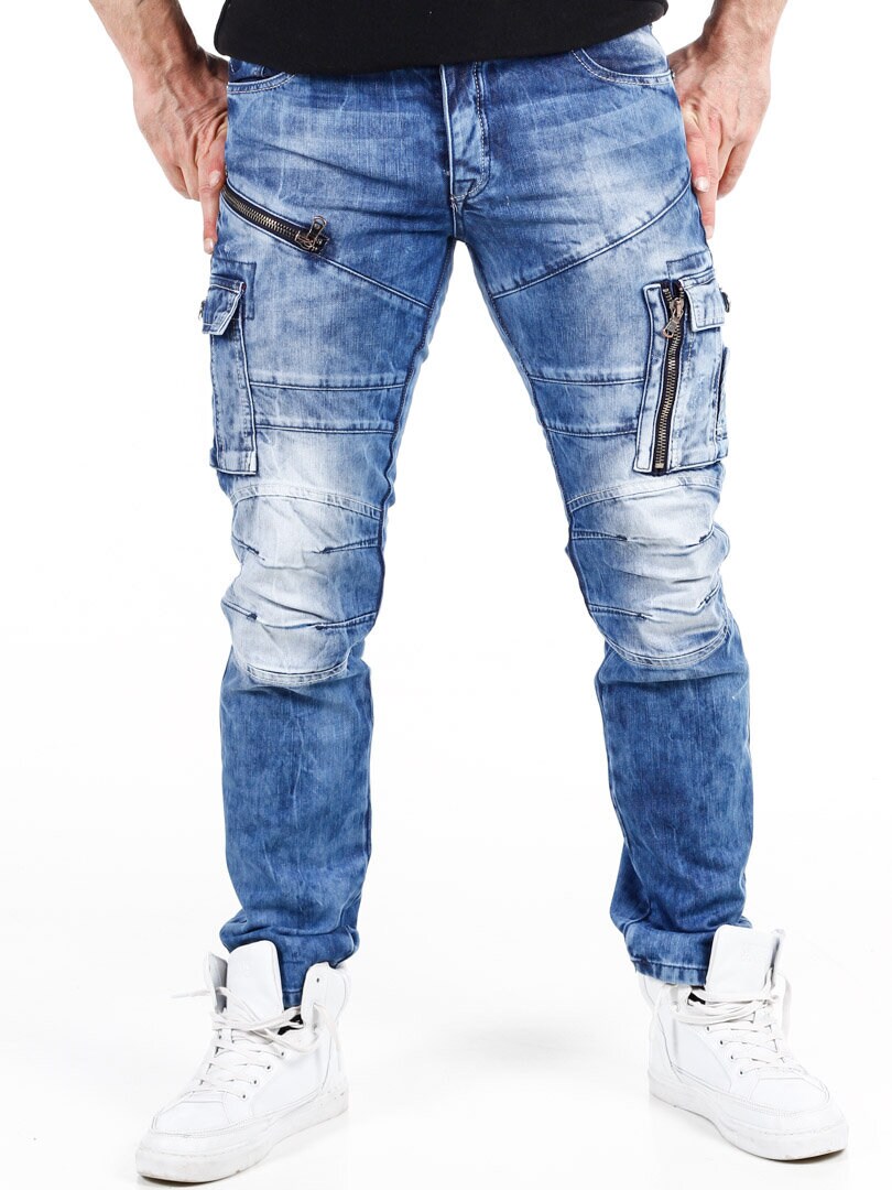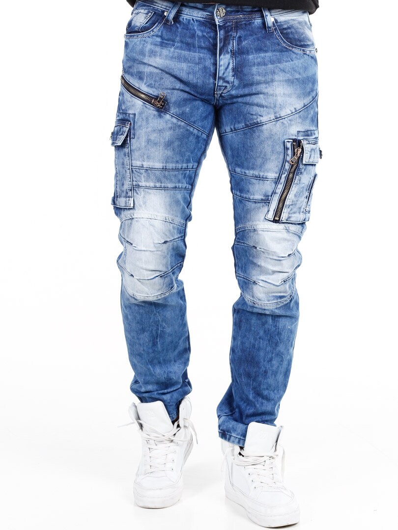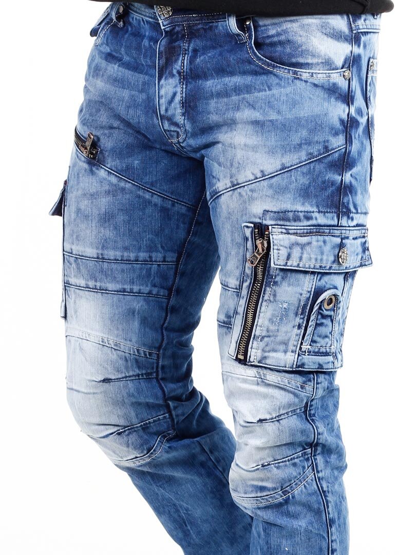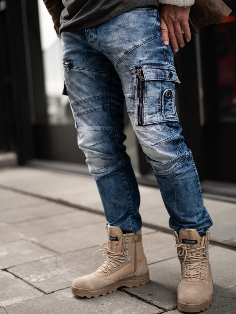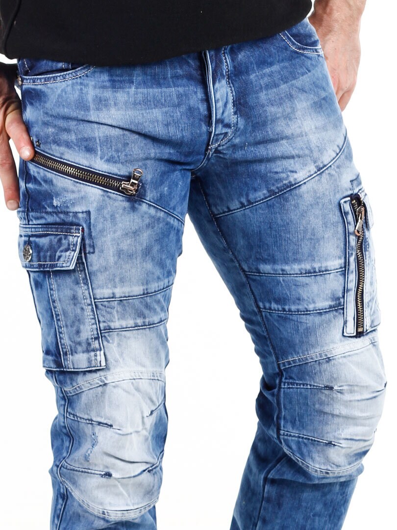 Mellemblå jeans med slitage, nitter i metal, grove lynlåse og lapper i en sort skindimitation med loget på. Disse bukser er fremstillet i 100 % bomuld, og de har rummelige lommer bagtil, tre lommer foran samt to cargolommer, der sidder på benene.