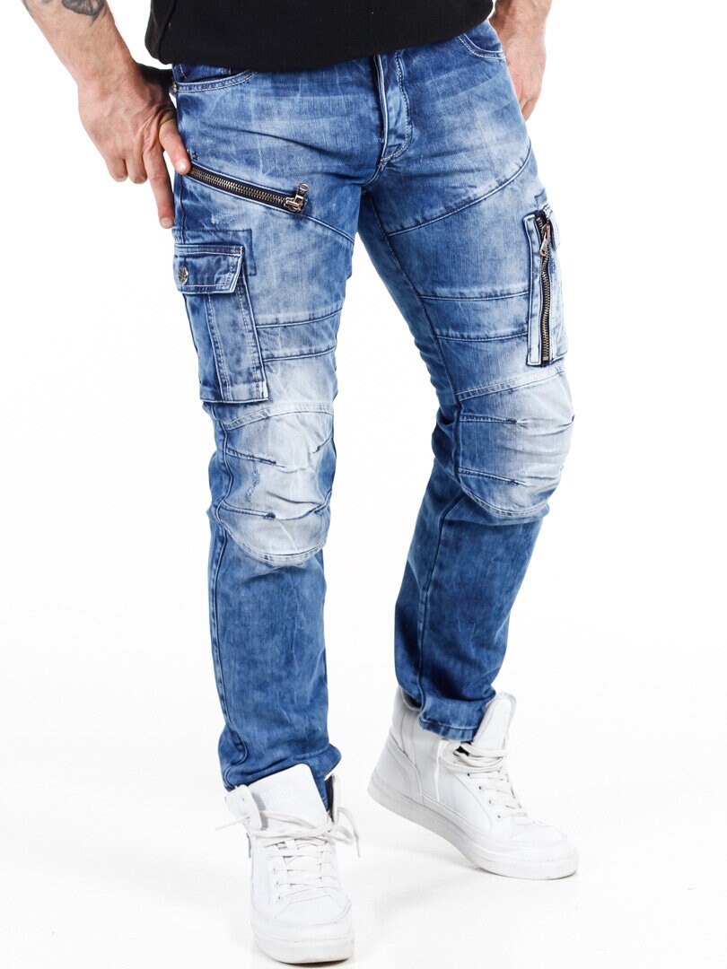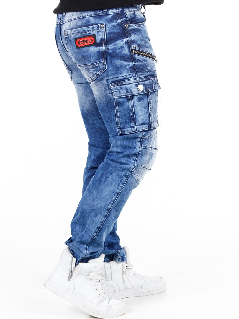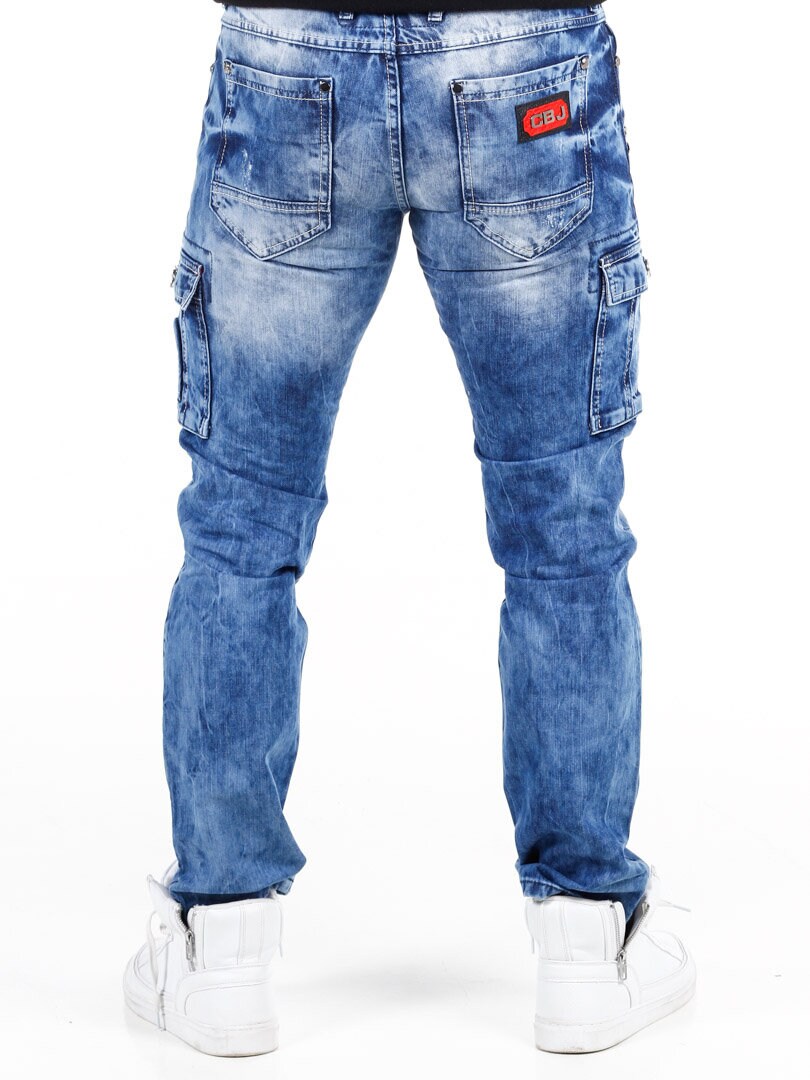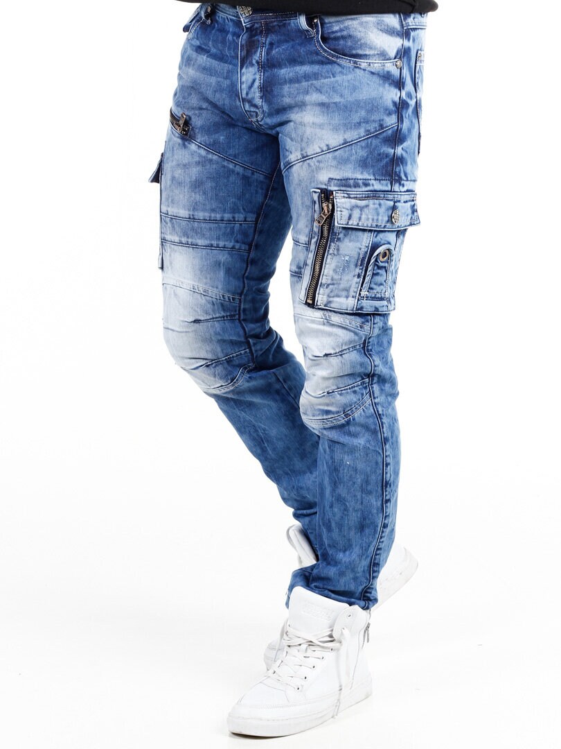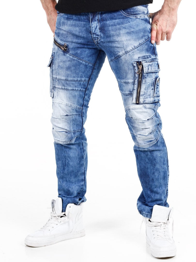 Mellemblå jeans med slitage, nitter i metal, grove lynlåse og lapper i en sort skindimitation med loget på. Disse bukser er fremstillet i 100 % bomuld, og de har rummelige lommer bagtil, tre lommer foran samt to cargolommer, der sidder på benene.
