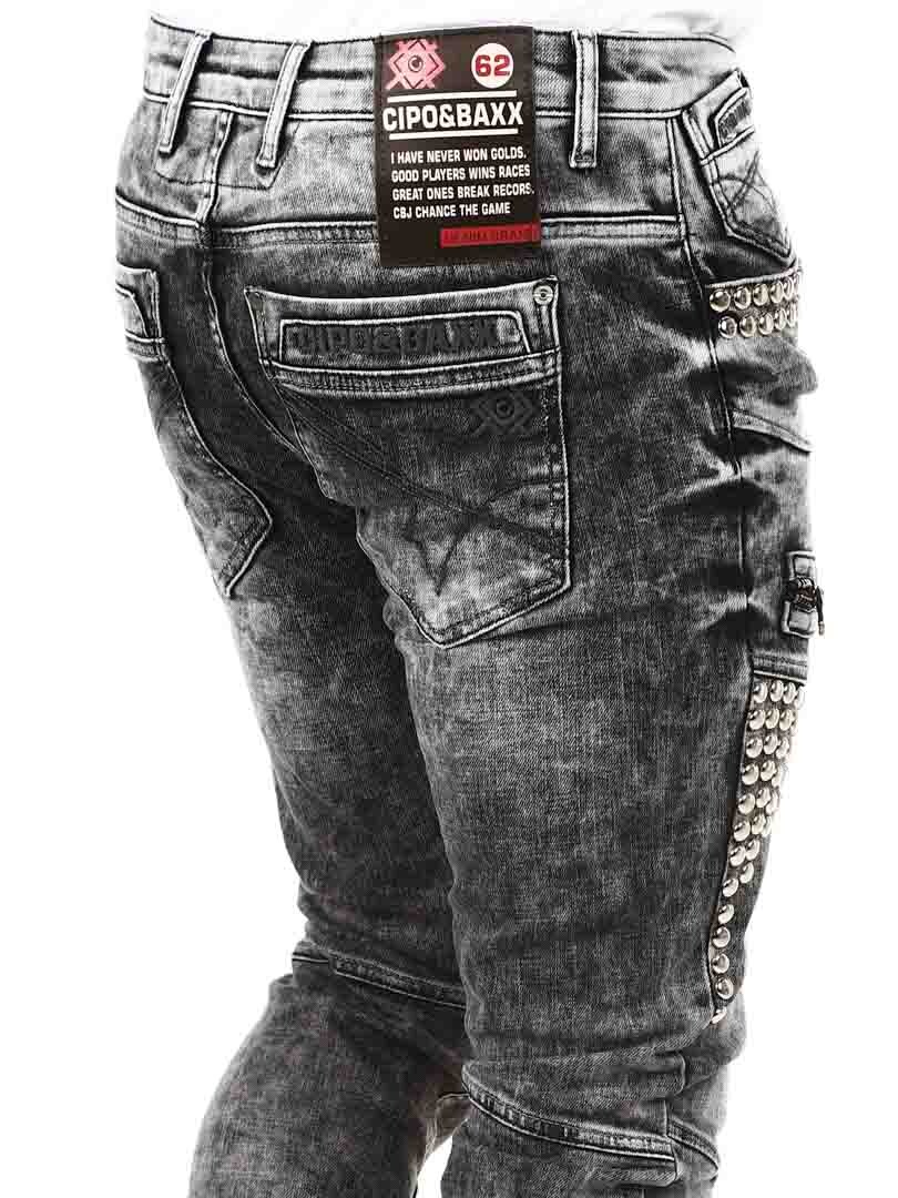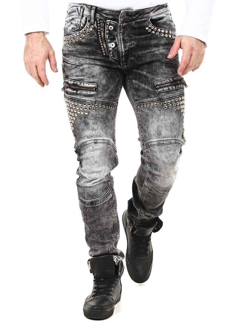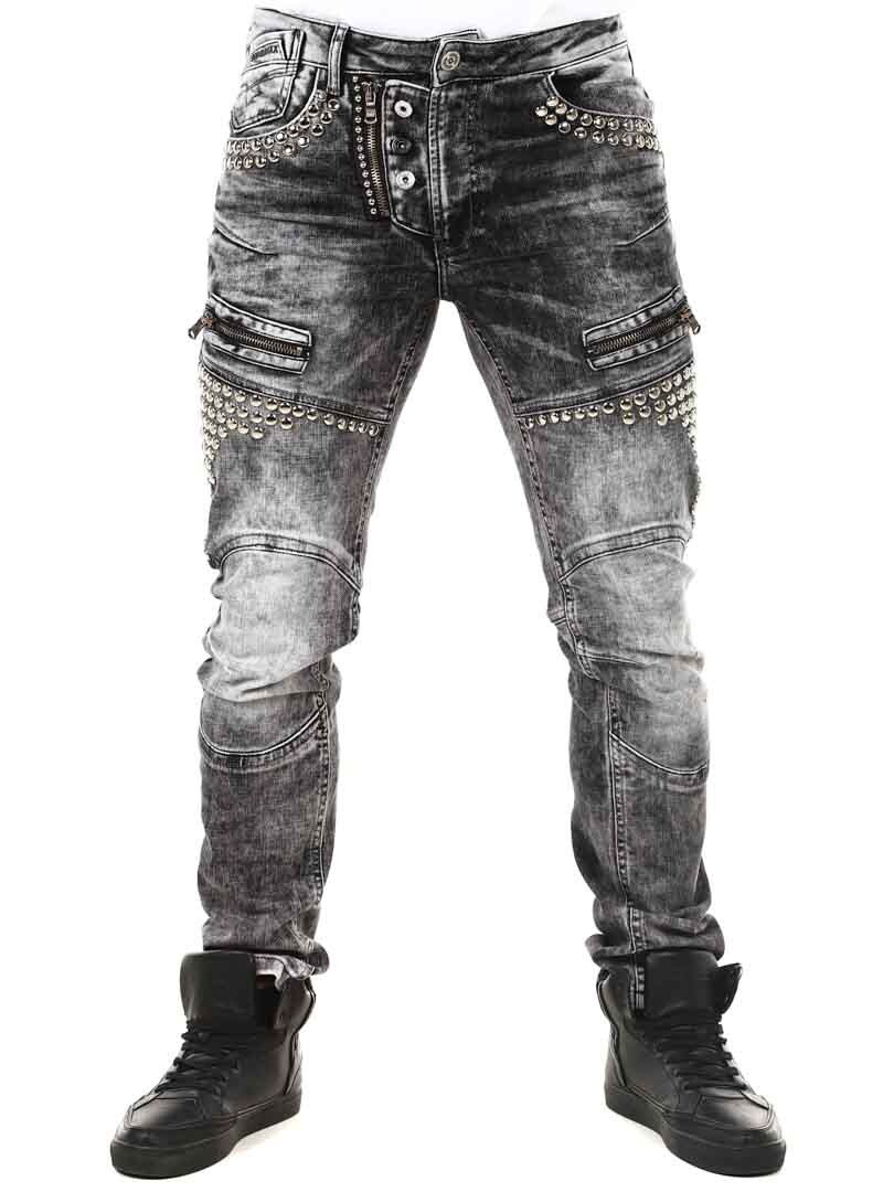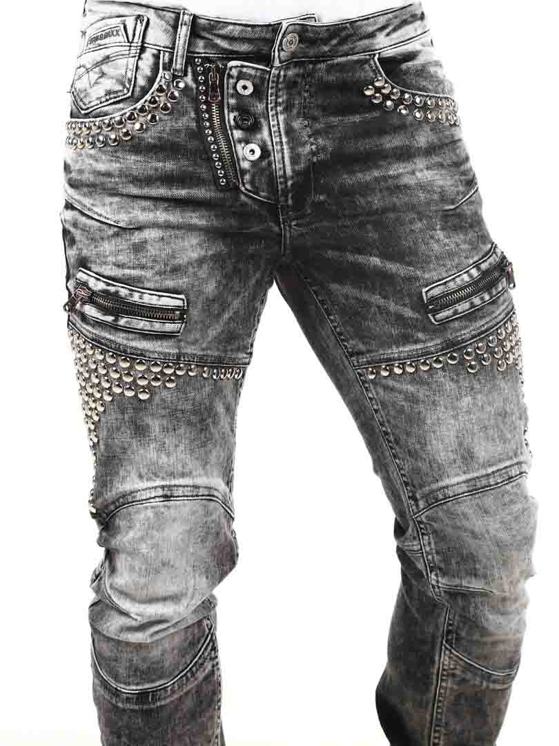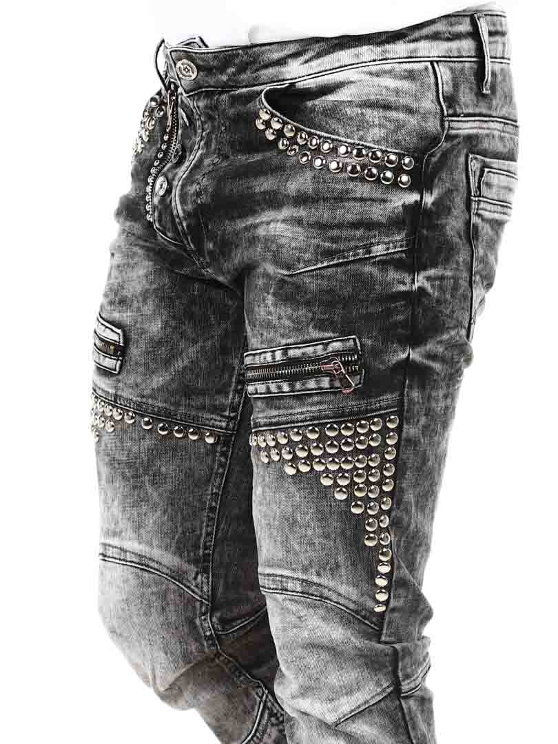 Cool bukser i en elastisk denim. Cool design hvor der også findes nitter, lynlåse og markerede sømme. Dette er en 5-lommers model med lukning ved hjælp af både knapper og en lynlås.