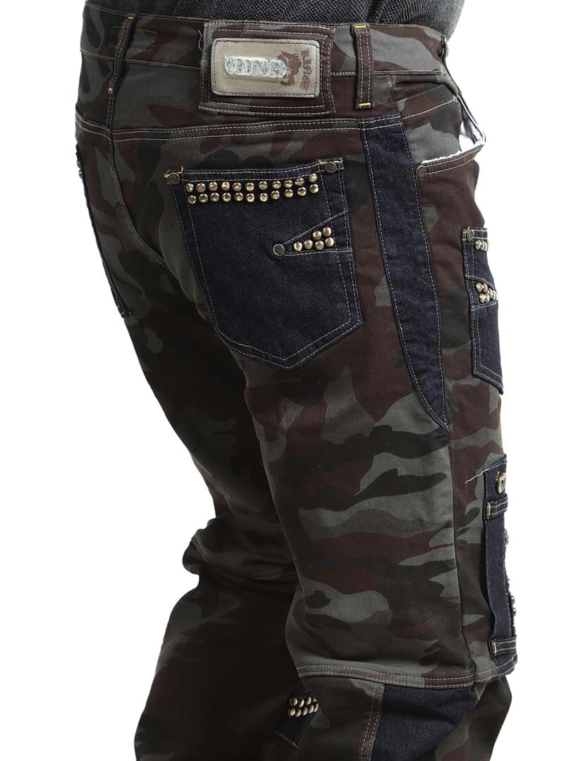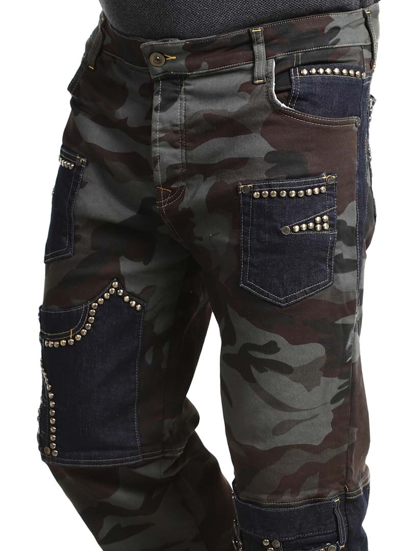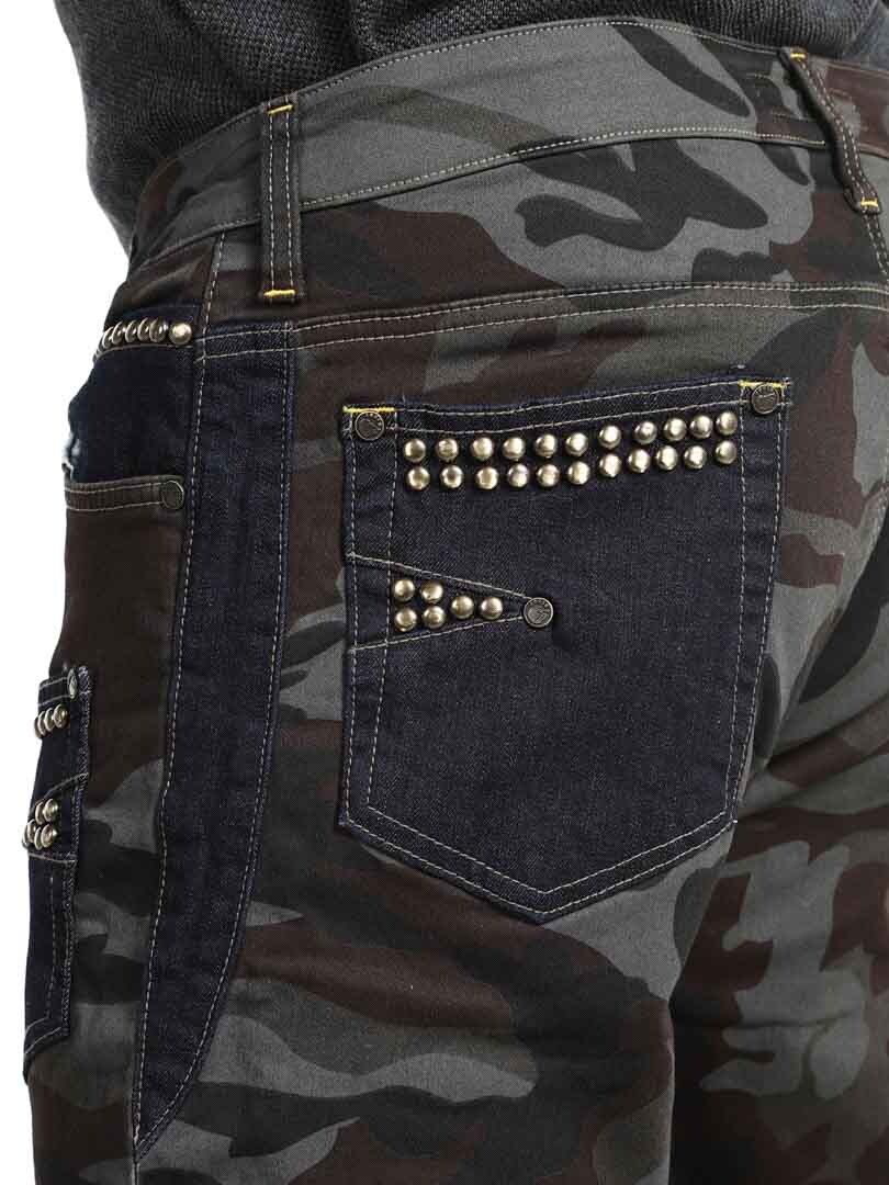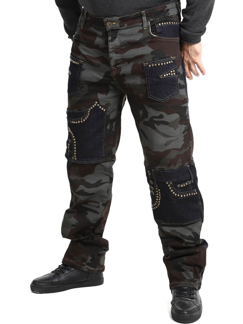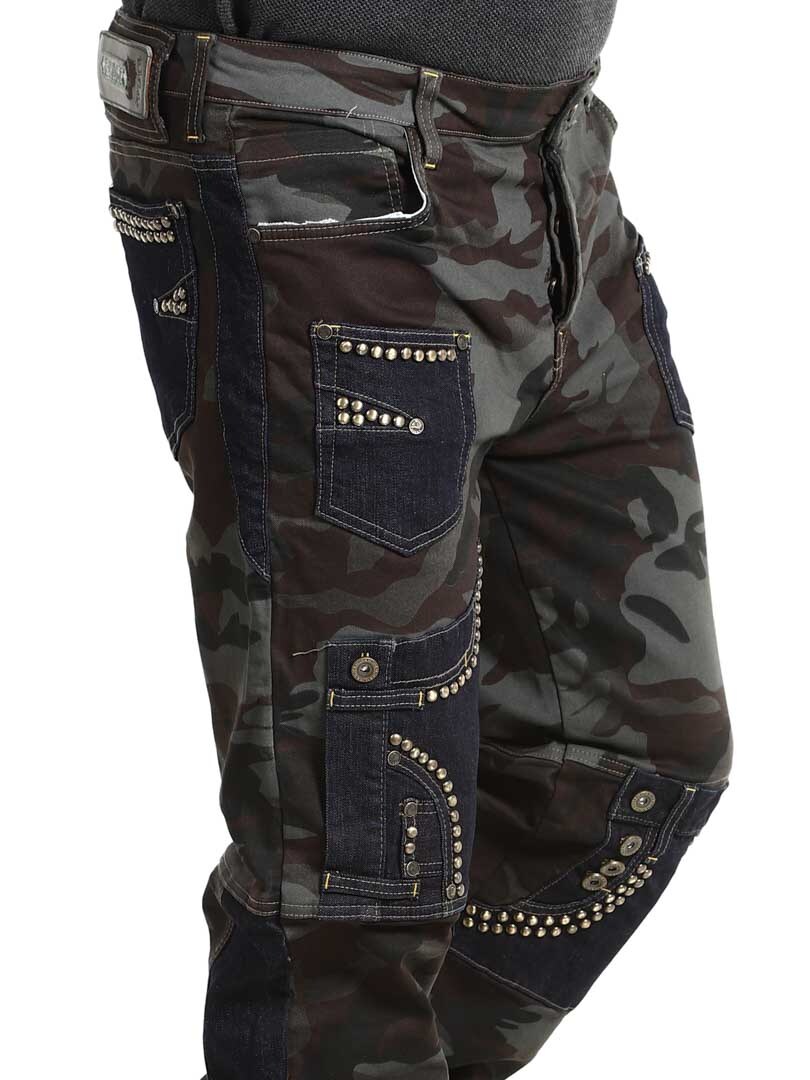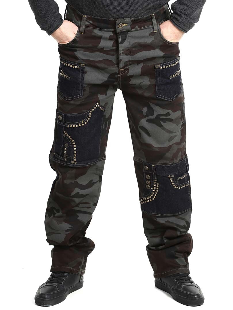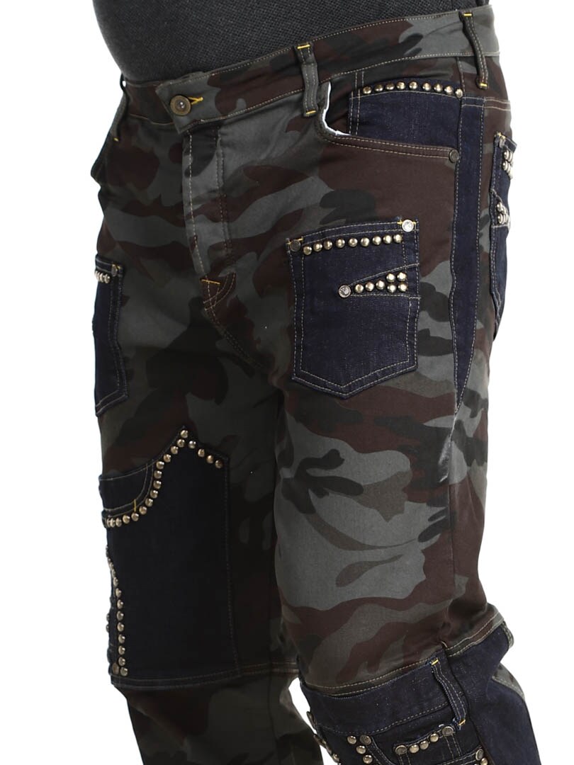 Disse bukser kombinerer et militærmønstret design med denimpaneler i en kontrast, og hertil kommer dekorative nitter, hvilket givet en rå og iøjnefaldende stil. De har flere funktionelle og flotte lommer. Den elastiske pasform giver komfort og bevægelsesfrihed, samtidig som bukserne er perfekte til dig der vil skille dig ud med et edgy look!