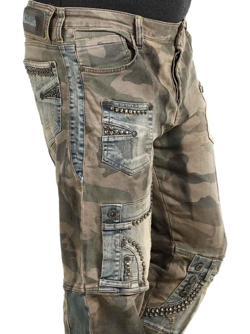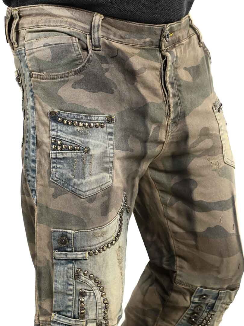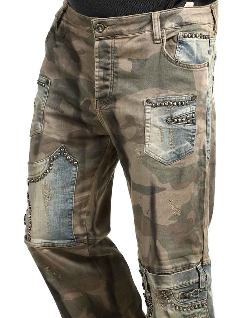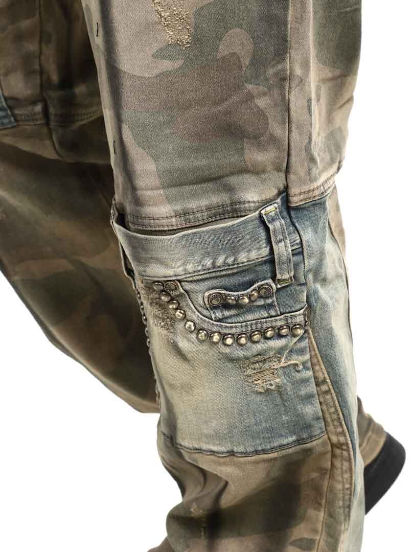 Disse bukser kombinerer et militærmønstret design med denimpaneler i en kontrast, og hertil kommer dekorative nitter, hvilket givet en rå og iøjnefaldende stil. De har flere funktionelle og flotte lommer. Den elastiske pasform giver komfort og bevægelsesfrihed, samtidig som bukserne er perfekte til dig der vil skille dig ud med et edgy look!
