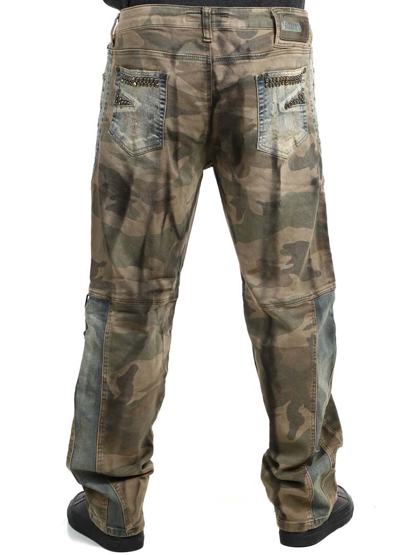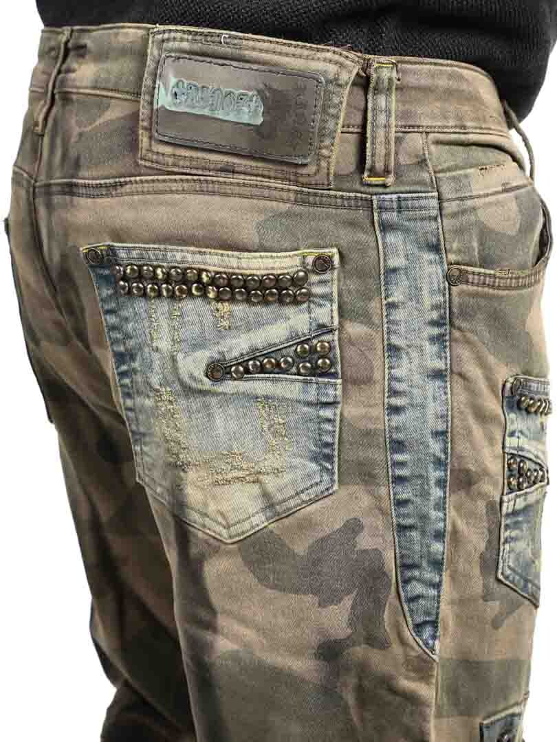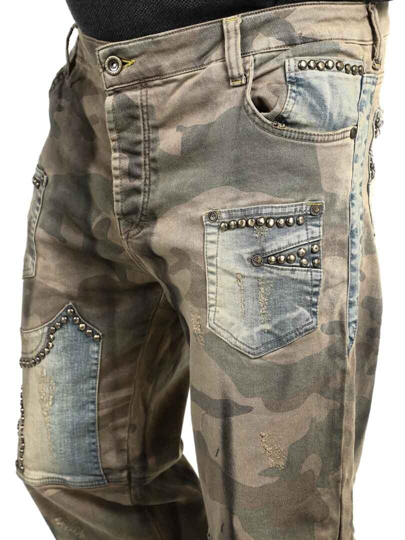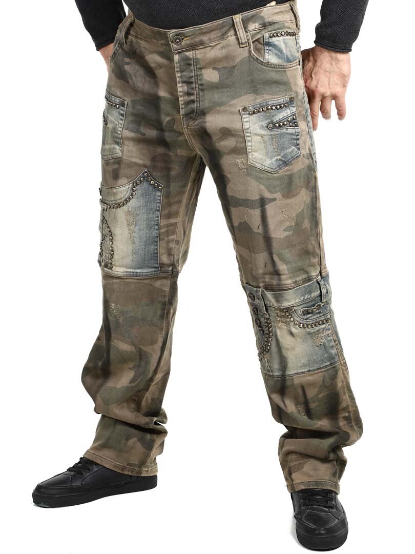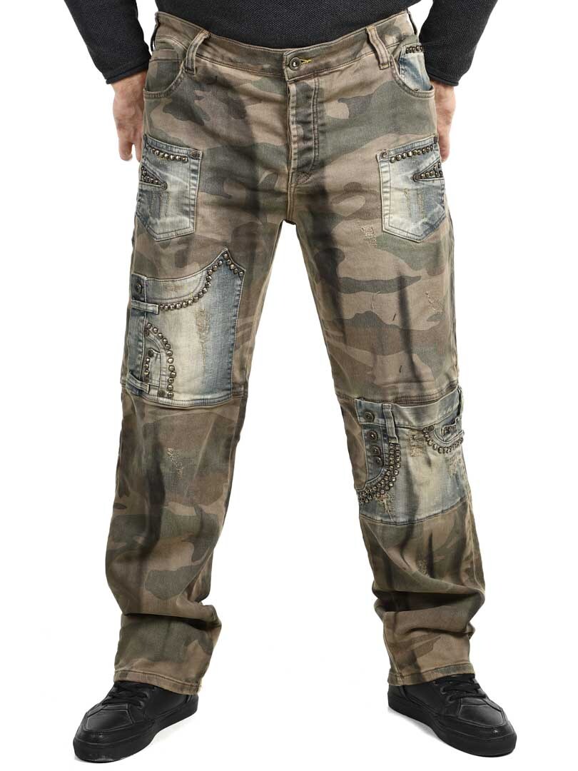 Disse bukser kombinerer et militærmønstret design med denimpaneler i en kontrast, og hertil kommer dekorative nitter, hvilket givet en rå og iøjnefaldende stil. De har flere funktionelle og flotte lommer. Den elastiske pasform giver komfort og bevægelsesfrihed, samtidig som bukserne er perfekte til dig der vil skille dig ud med et edgy look!
