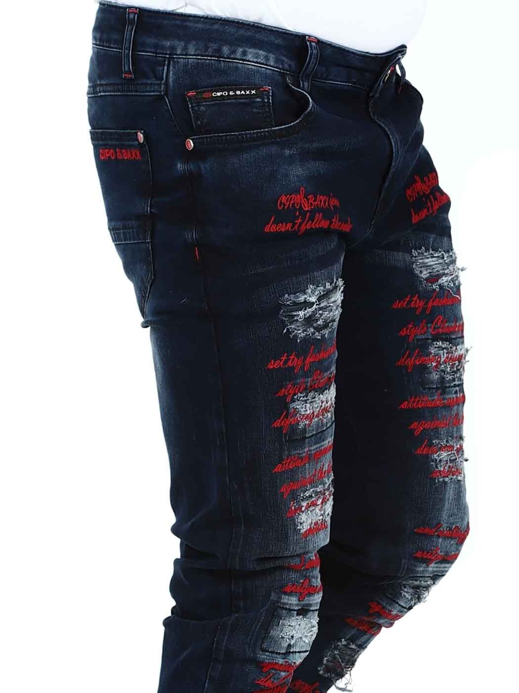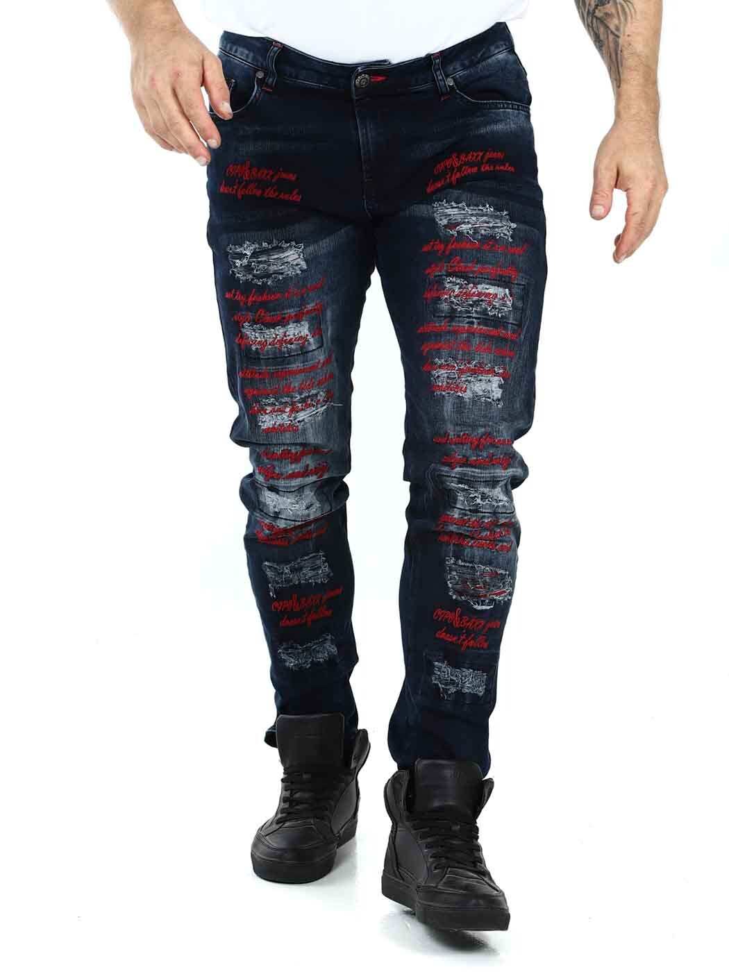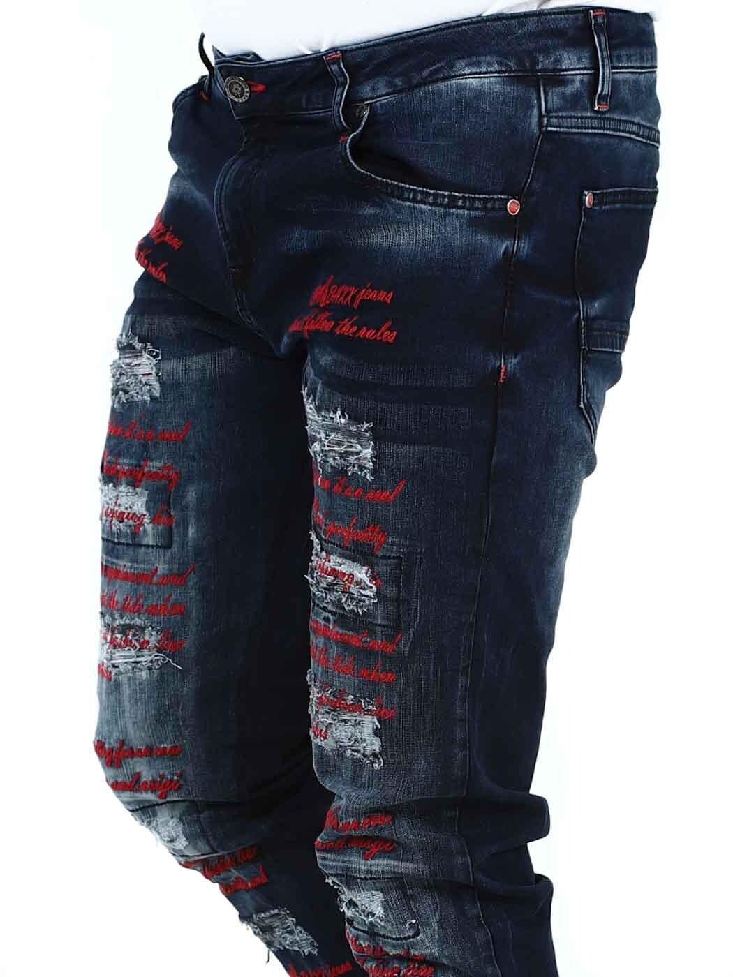 Bukser i en stenvasket denim med rifter. De er designet med røde detaljer og en fastsyet tekst, der giver et unikt look. Dette er en elastisk model med fem klassiske lommer.