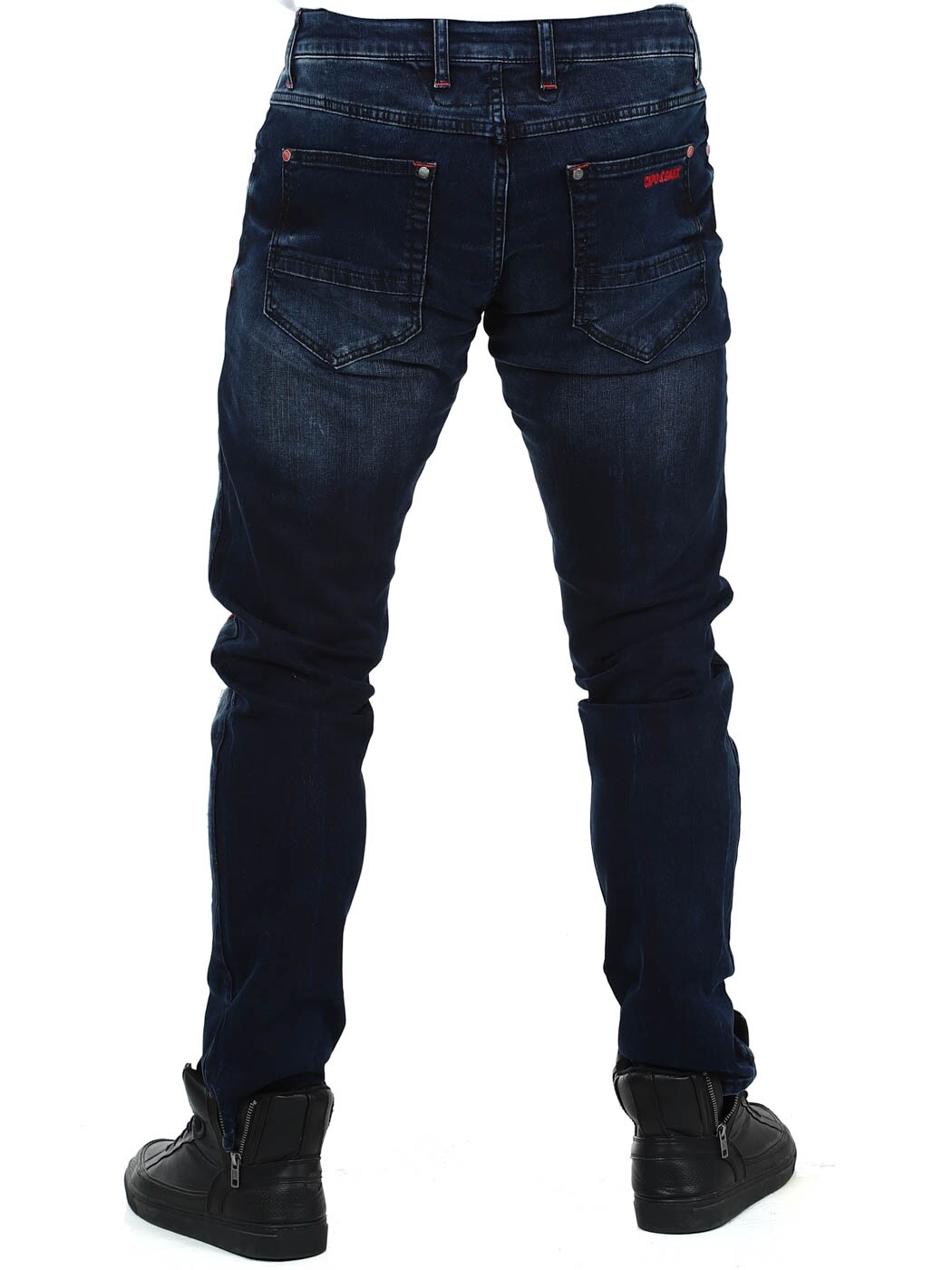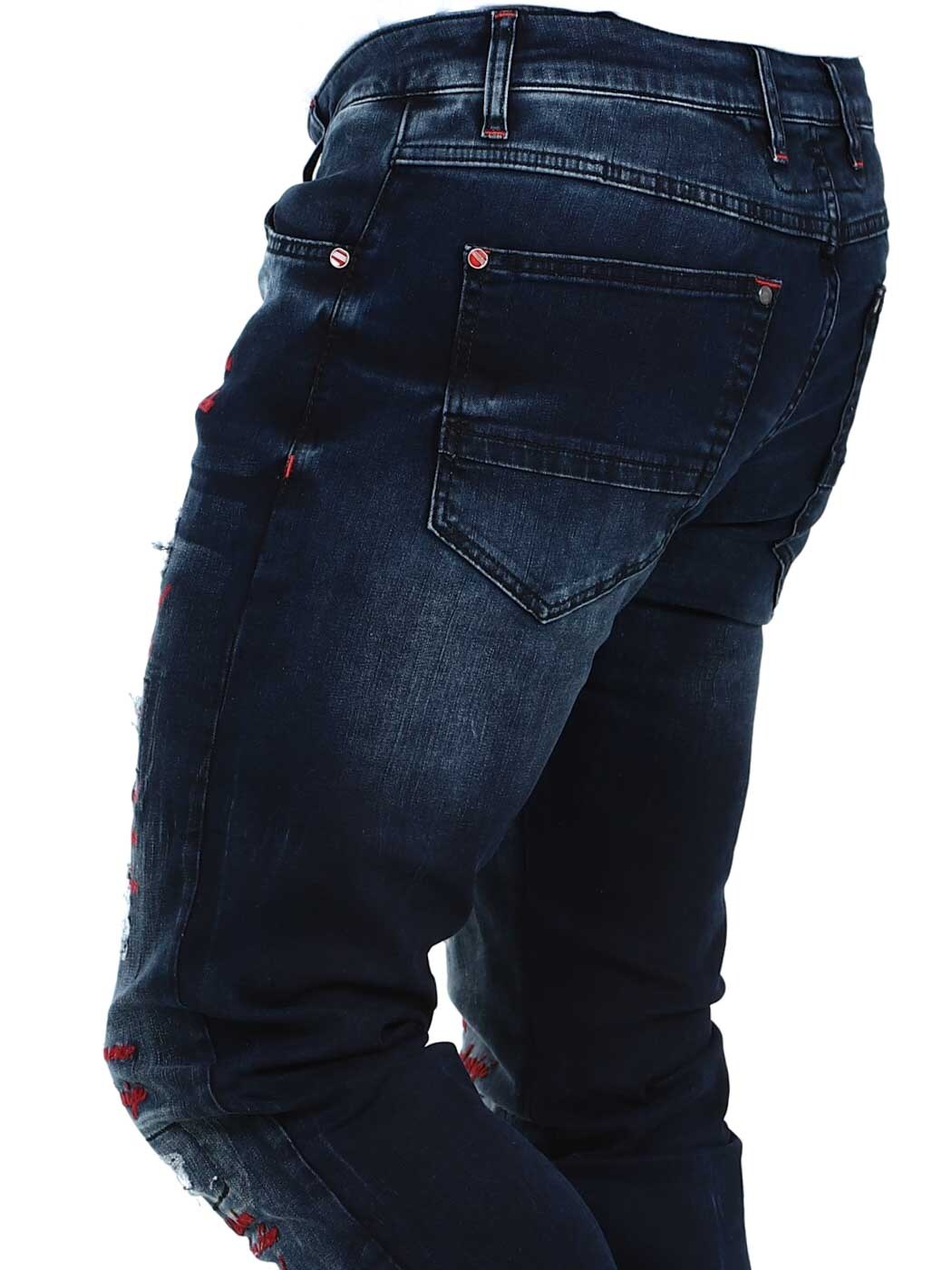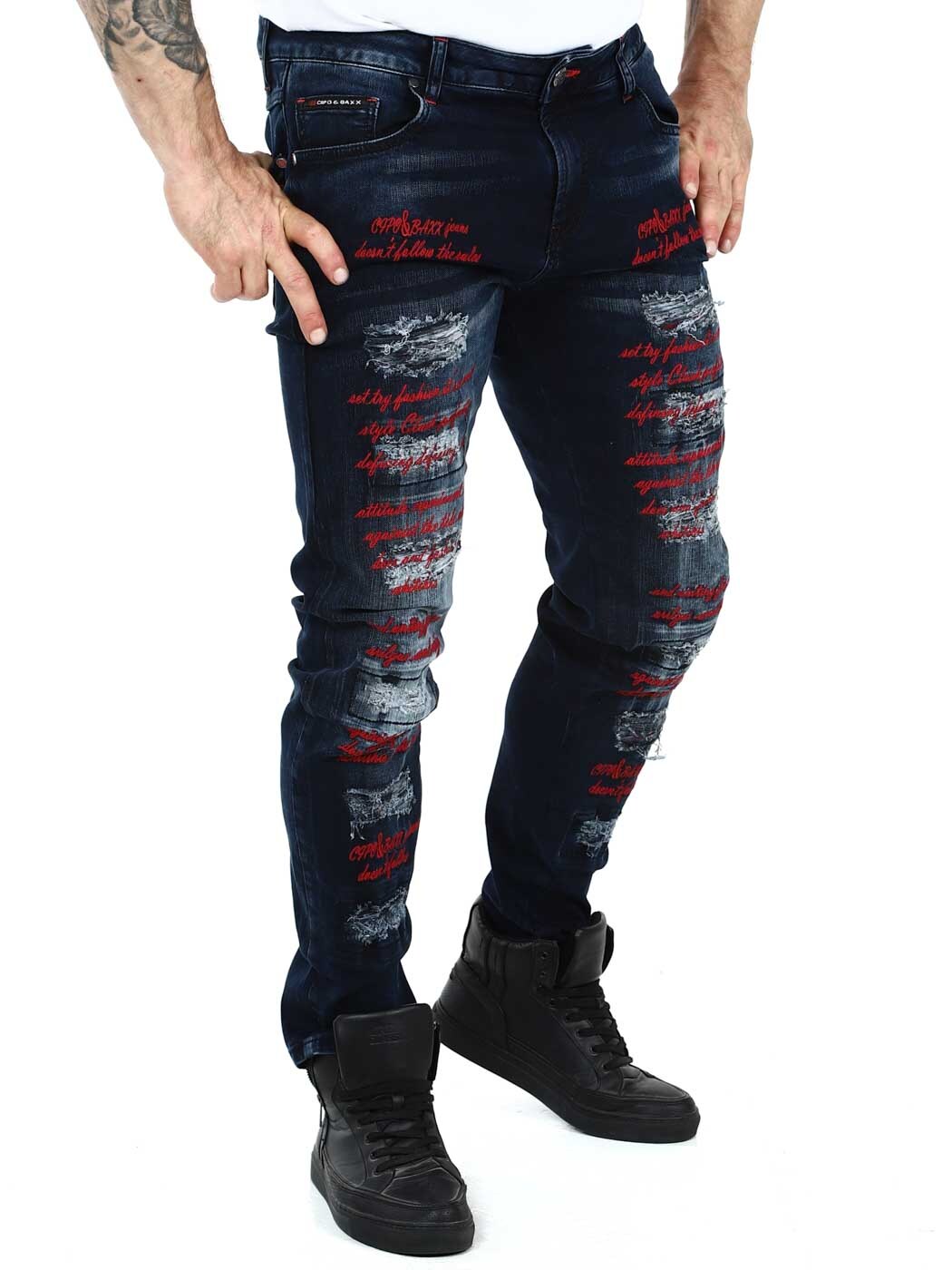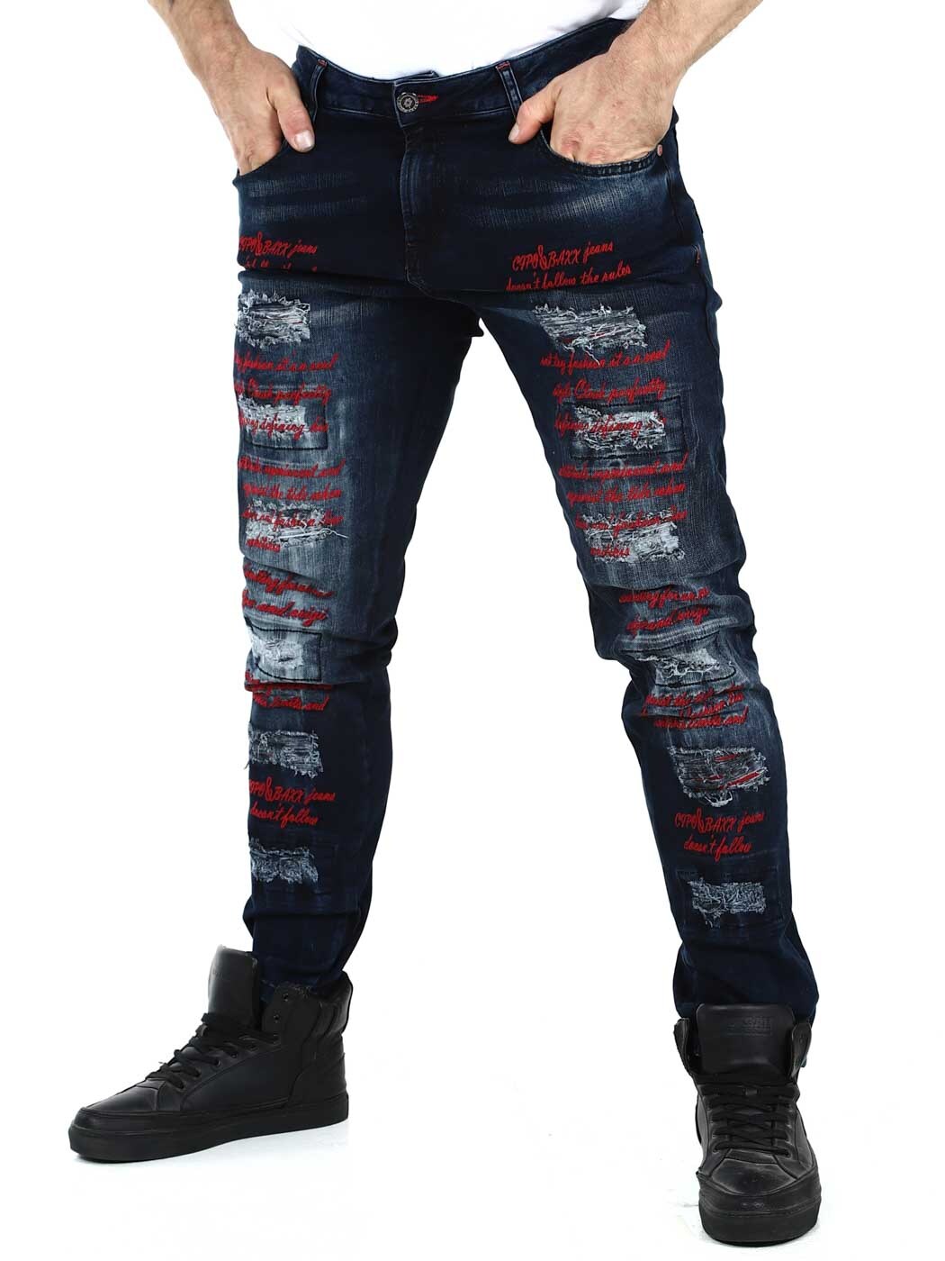 Bukser i en stenvasket denim med rifter. De er designet med røde detaljer og en fastsyet tekst, der giver et unikt look. Dette er en elastisk model med fem klassiske lommer.