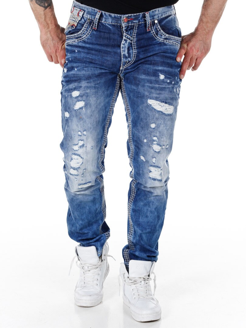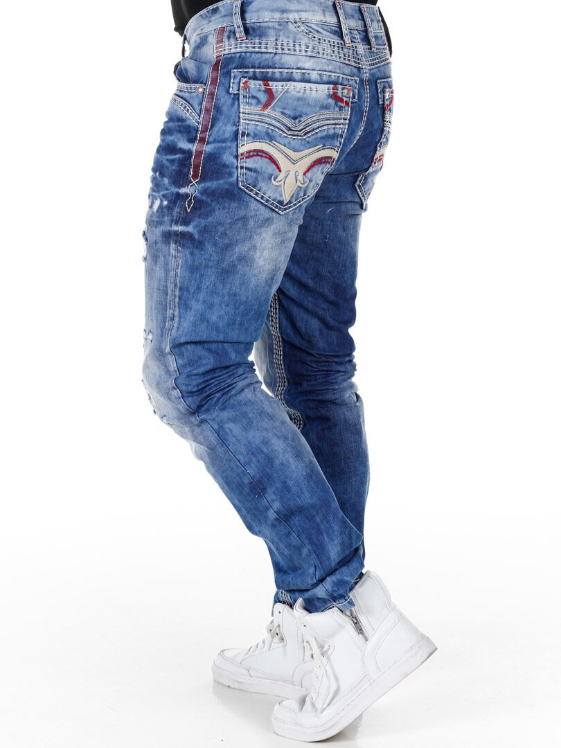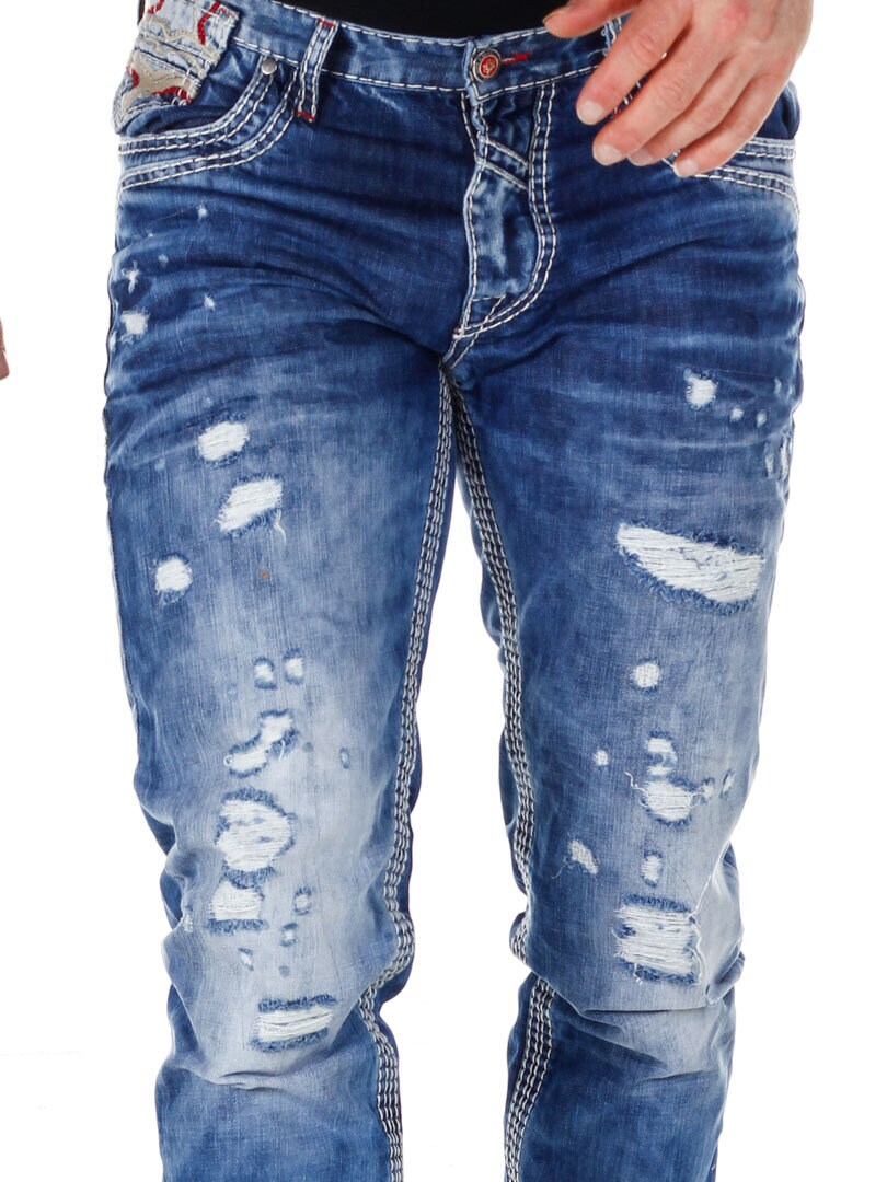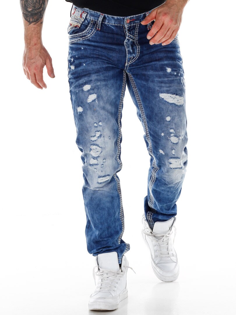Bukser i en mellemblå denim med lyse slitager. Dette er en model med 5 lommer og en klassisk pasform. Bukserne er designede med grove sømme og skræddersyede baglommer der kmmer i kontrastfarver.